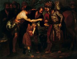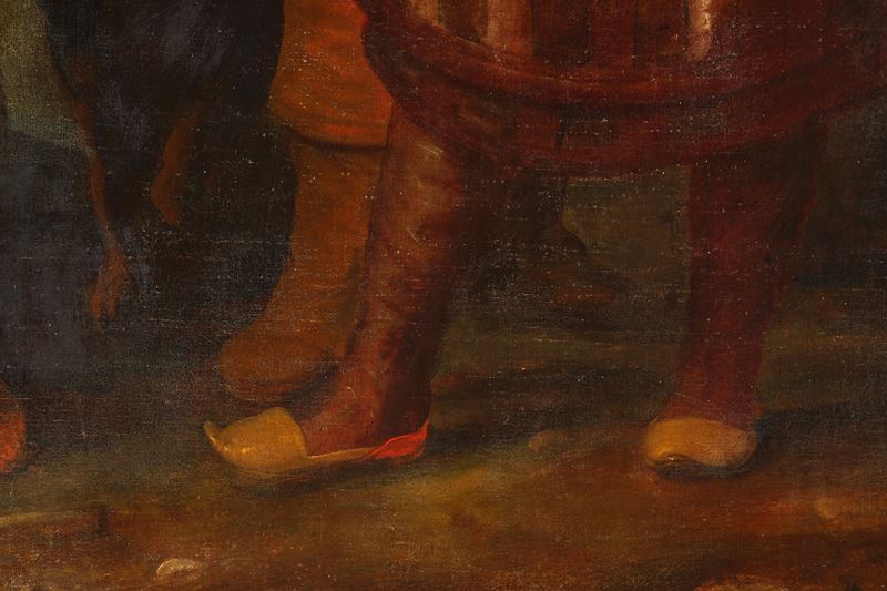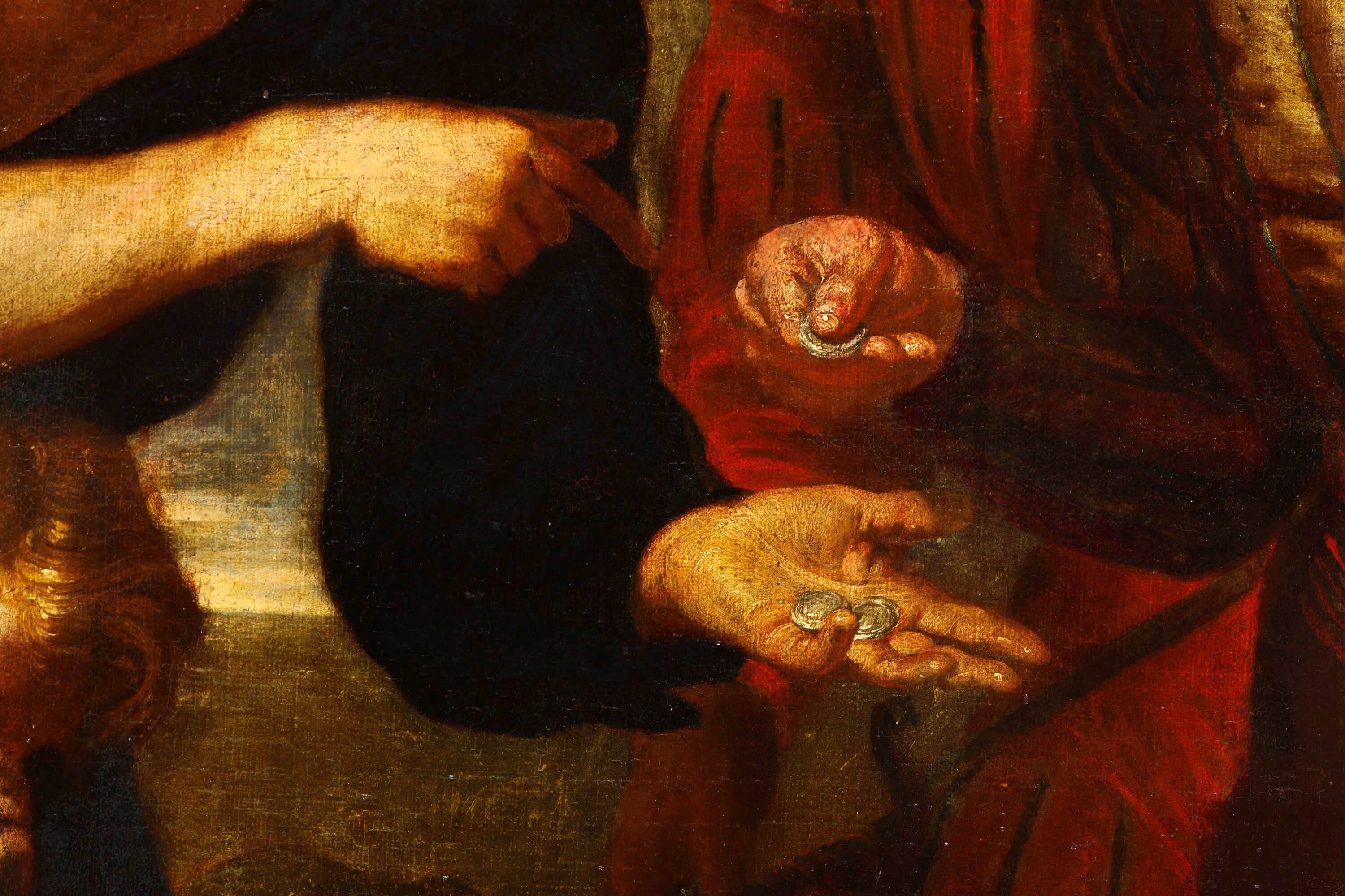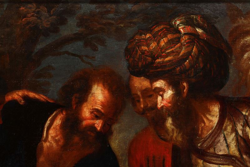 scaltro Giuda, a torso nudo con una sacca da pastore a tracolla. L’acquirente è un fiero mercante levantino, accompagnato da un uomo con pizzetto e da un vivace cavallo.