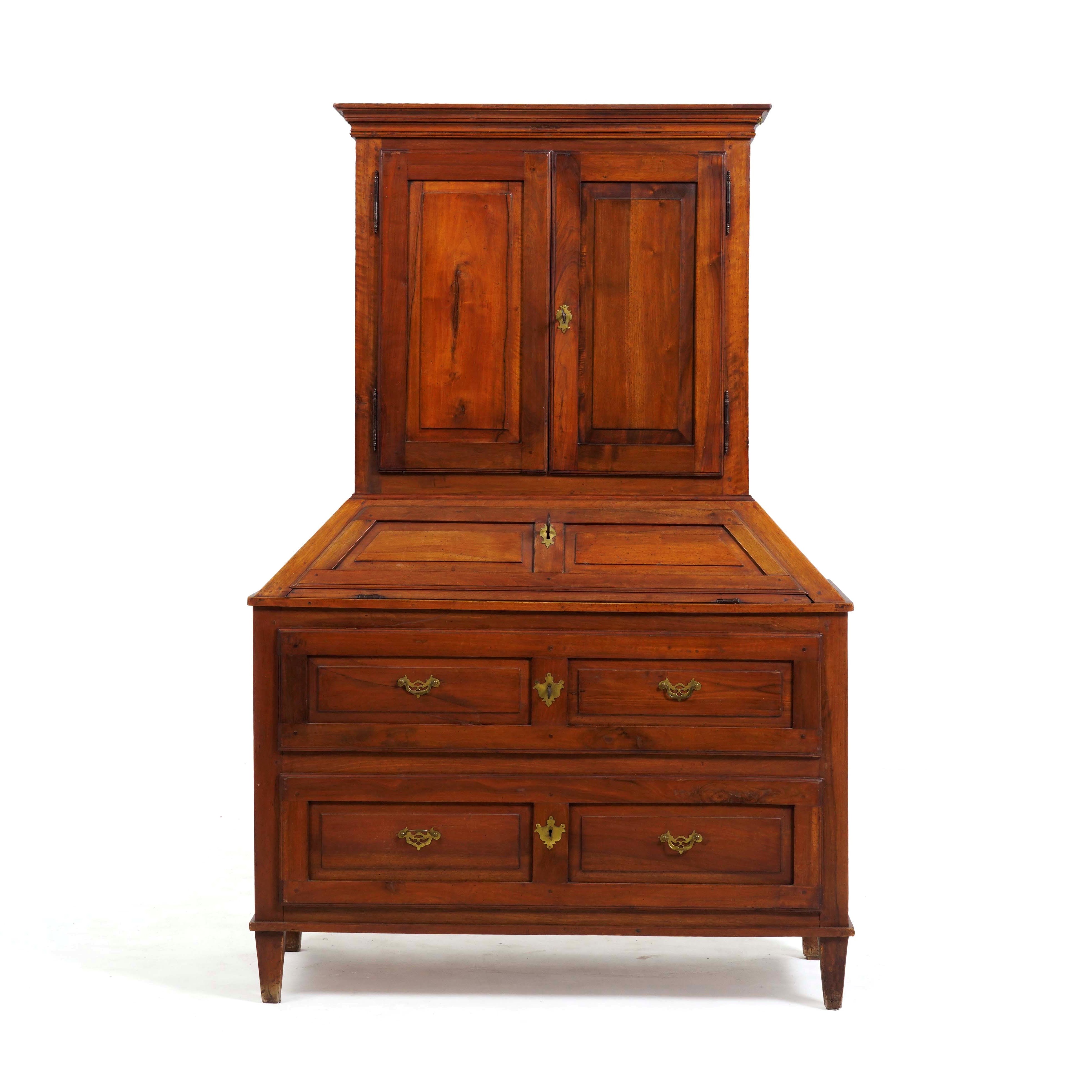 Fronte a due cassetti e scarabattolo, alzata a due ante, tutti pannellati, gambe rastremate