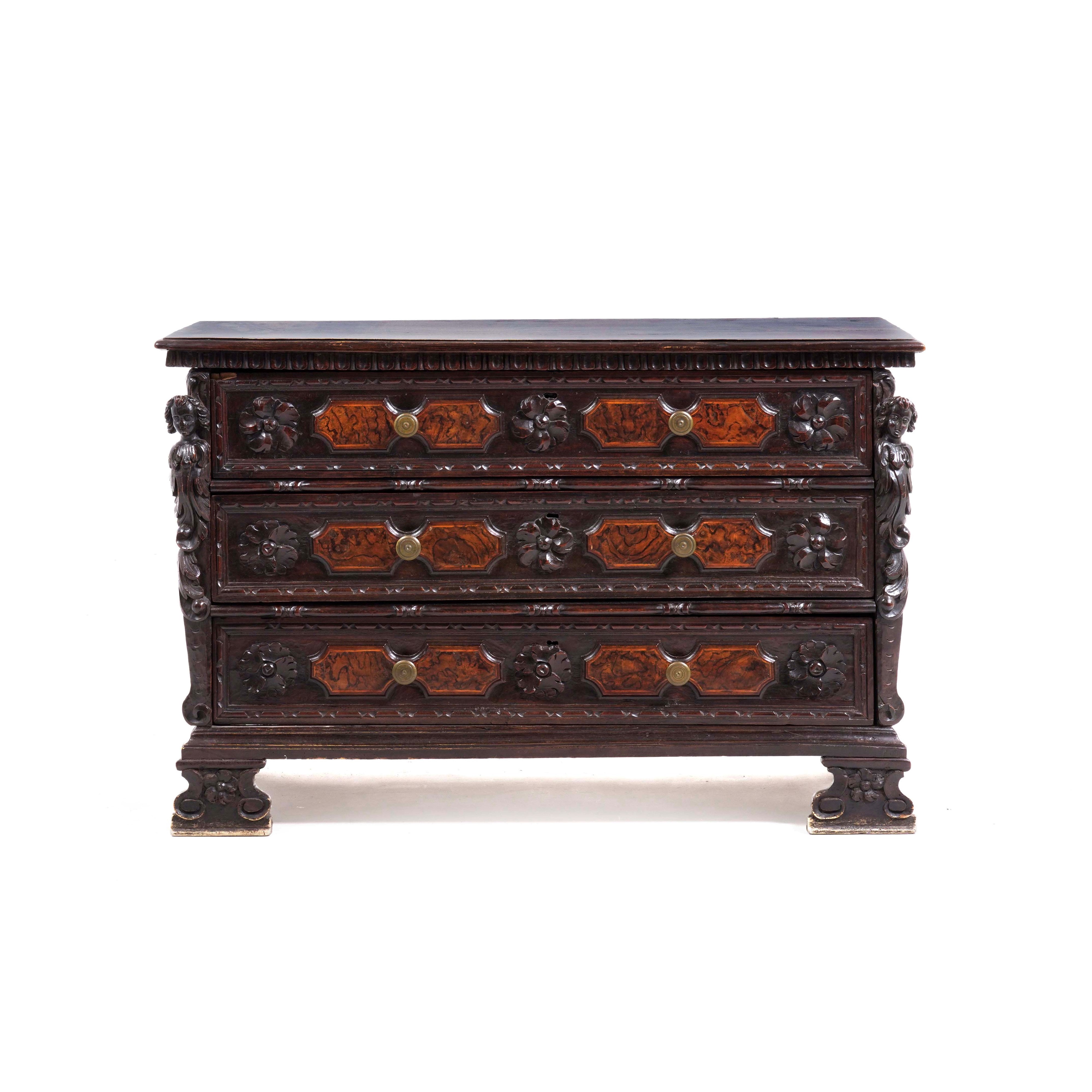 Cassettone in legno intagliato e parzialmente lastronato. XVII secolo