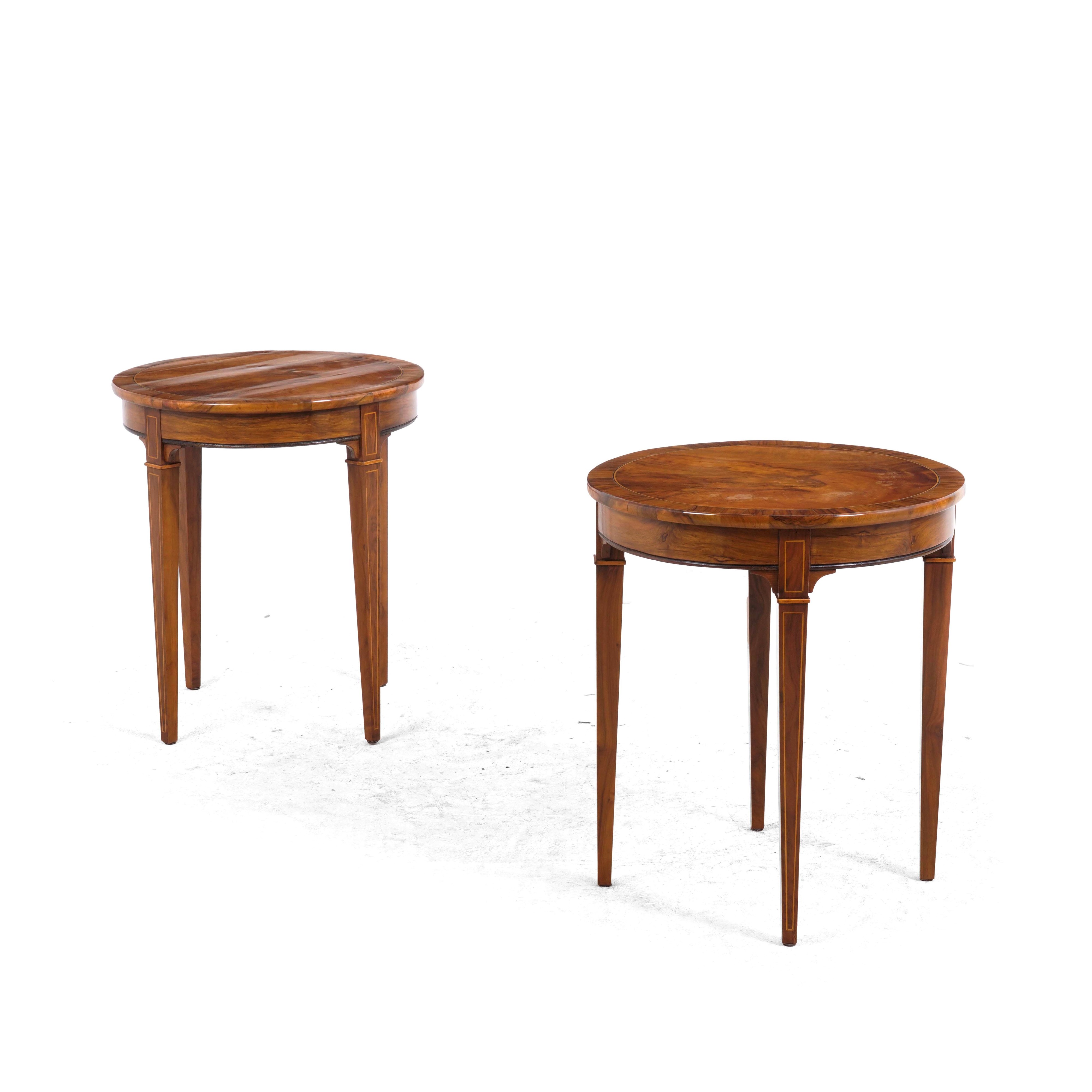 Coppia di tavolini lastronati con piano circolare. XIX-XX secolo