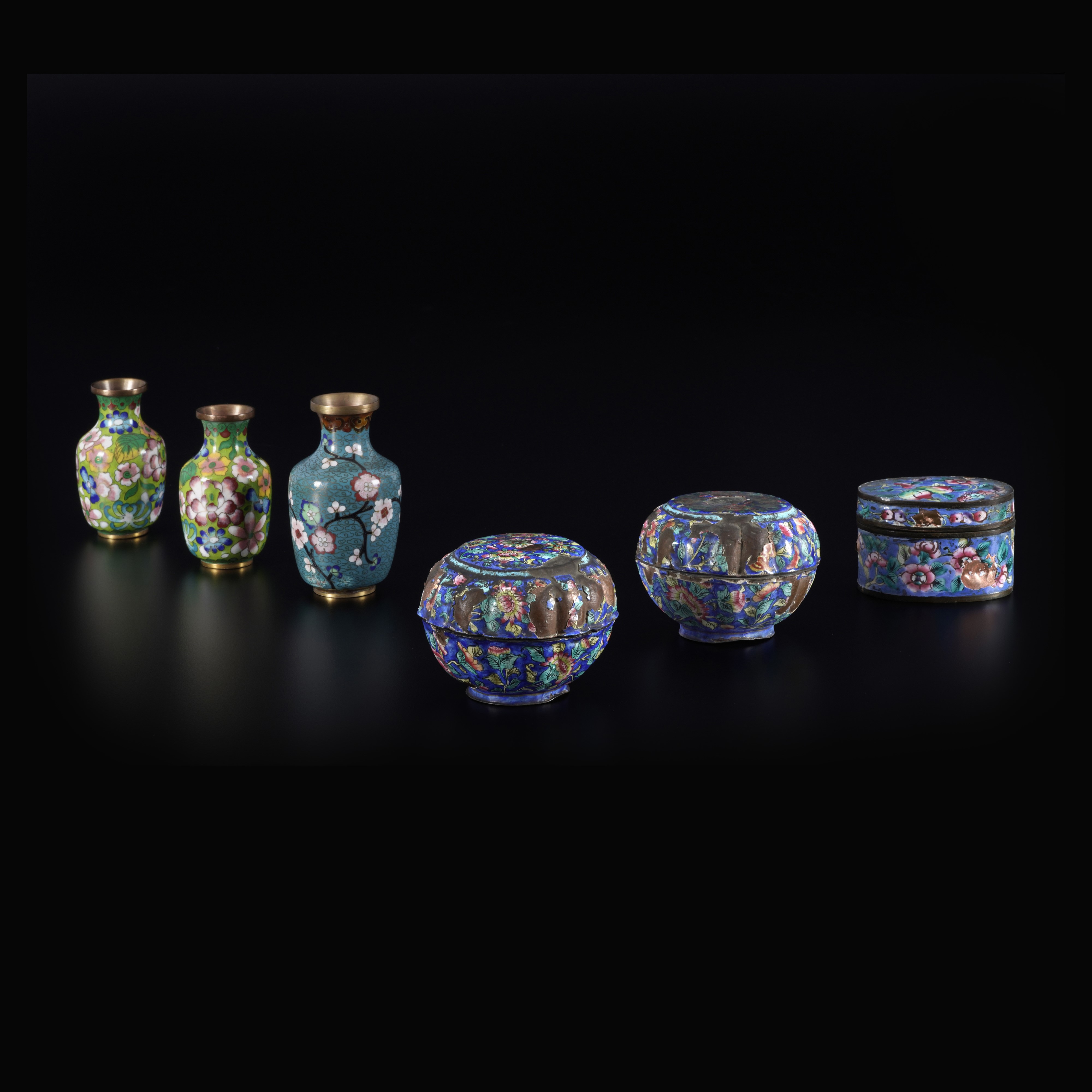 Lotto composto da tre snuff bottle e tre piccole ciotole a smalti policromi cloissoné con decori a motivi floreali, Cina, XX secolo