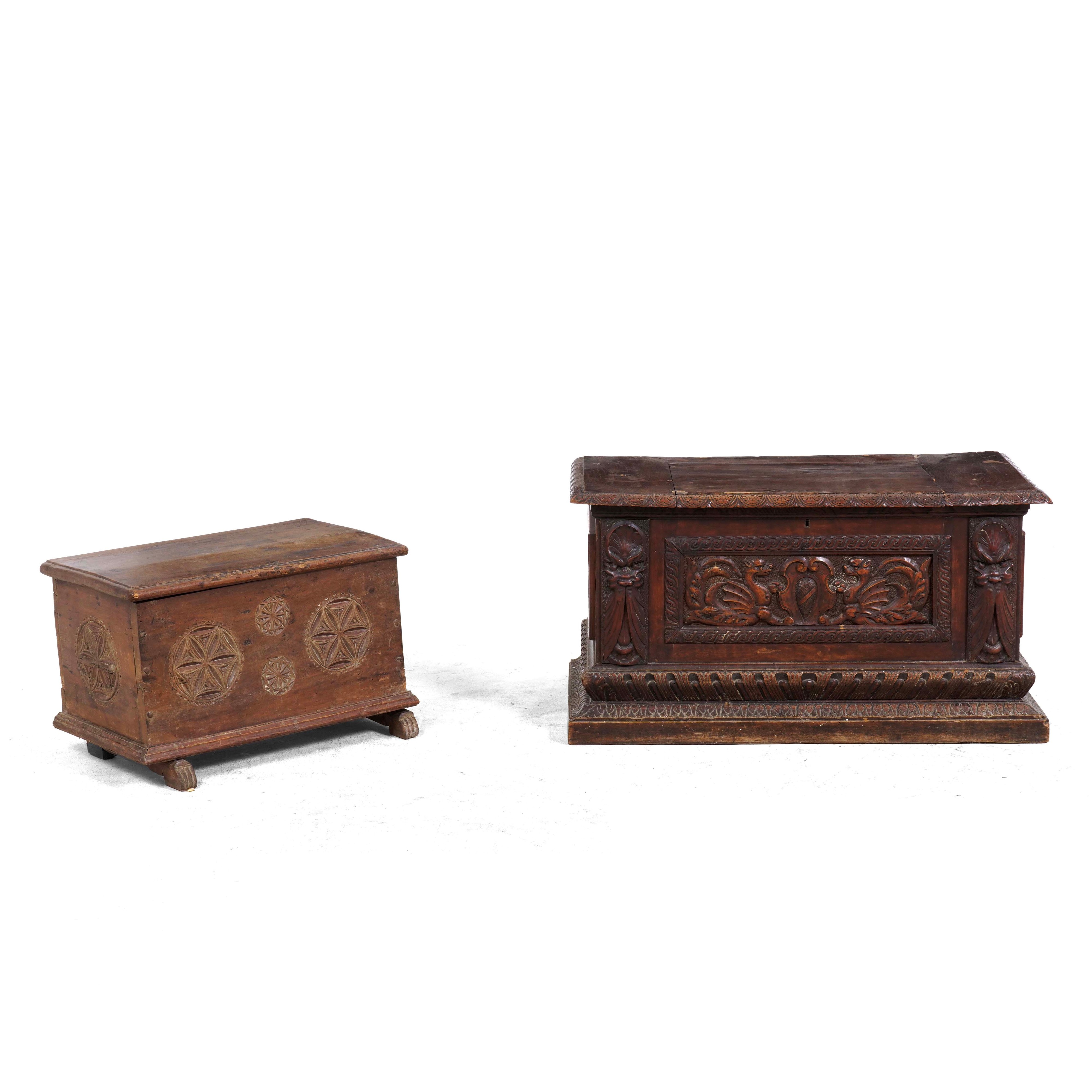 Piccola cassapanca intagliata in stile rinascimento e una diversa