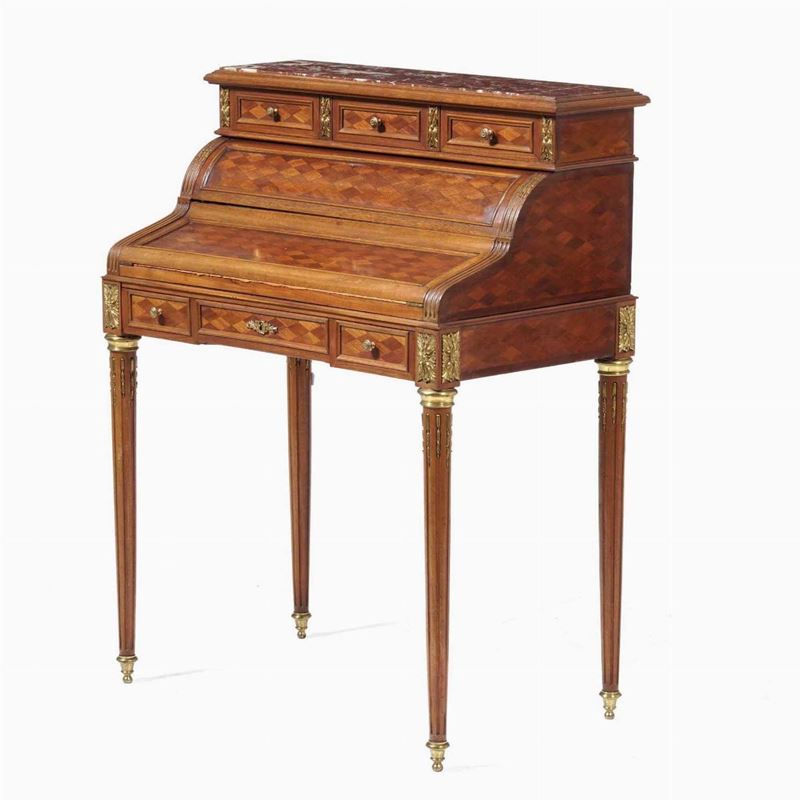 Scrittoio con ribalta a rullo lastronato ed intarsiato a marqueterie in varie essenze. XIX-XX secolo