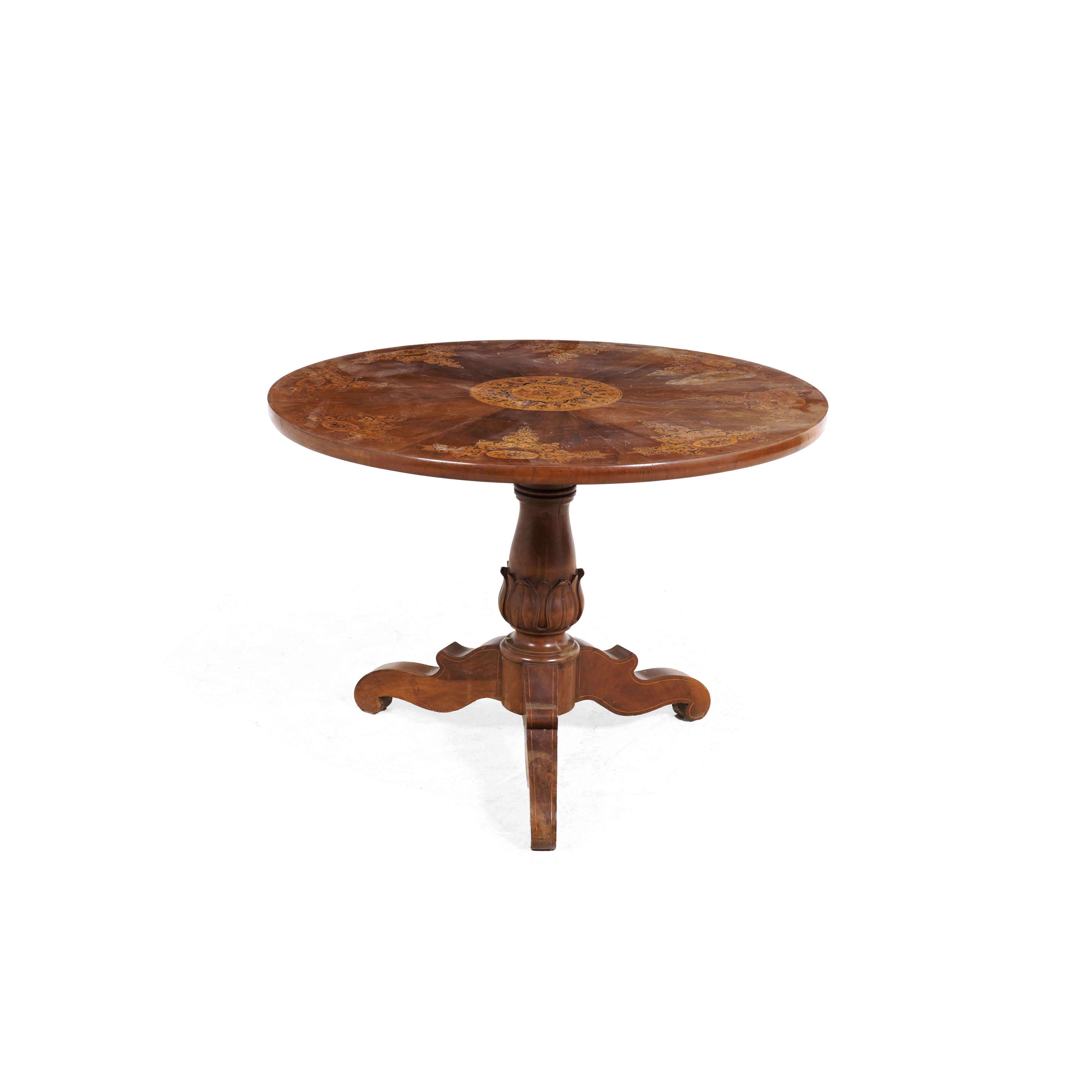 Tavolo tondo in legno con piano intarsiato