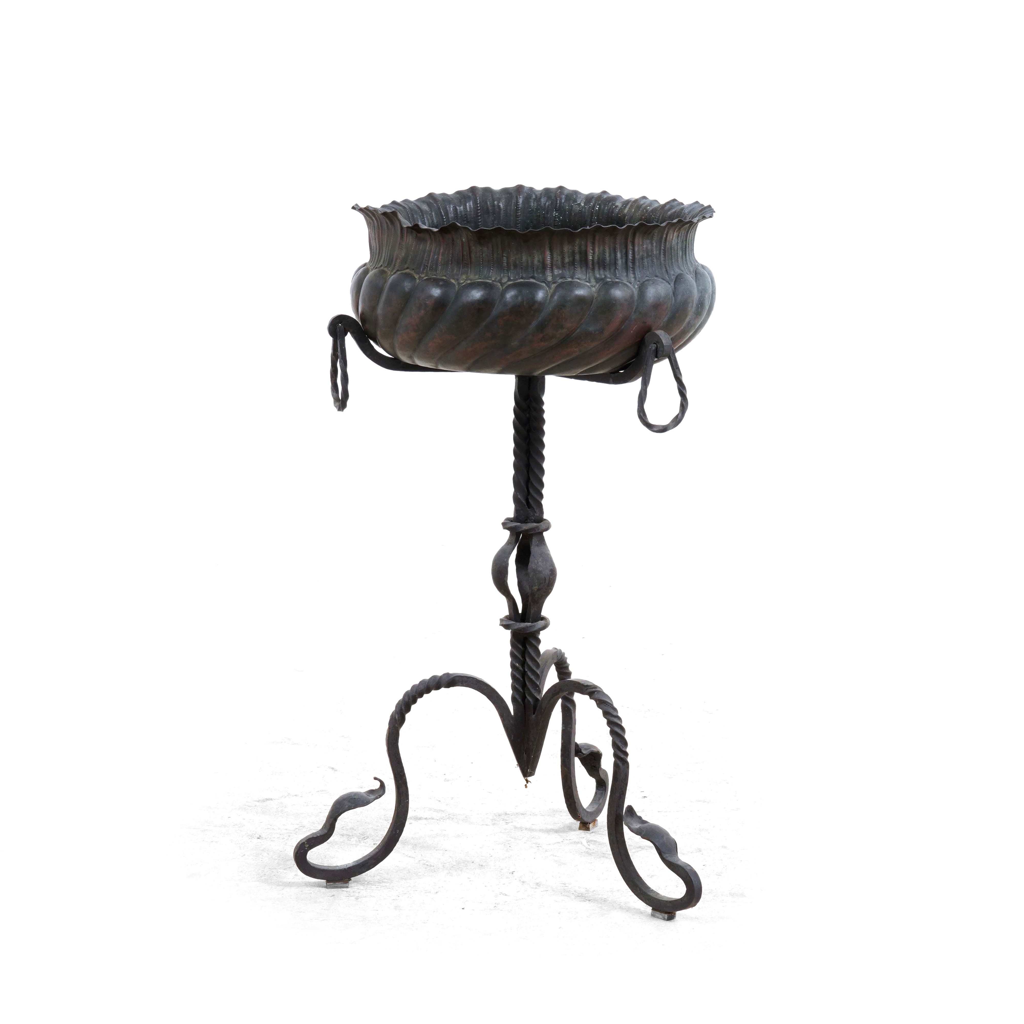 Una fioriera in rame con base tripode