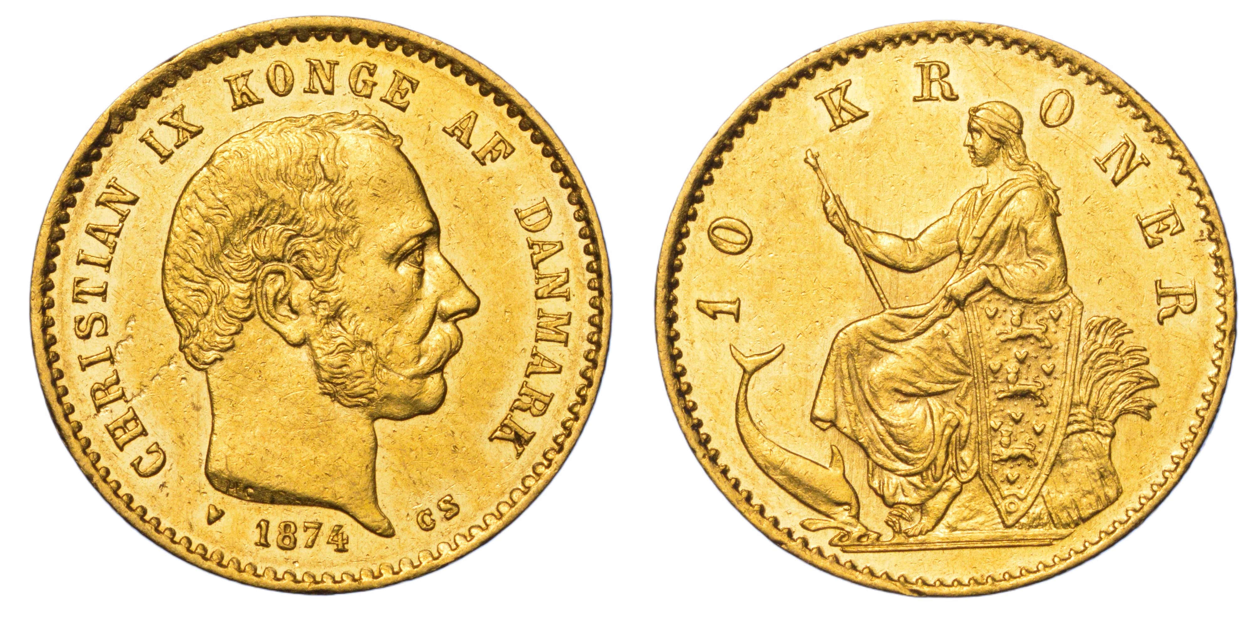 DANIMARCA. CHRISTIAN IX, 1863-1906. 10 Kroner 1874.