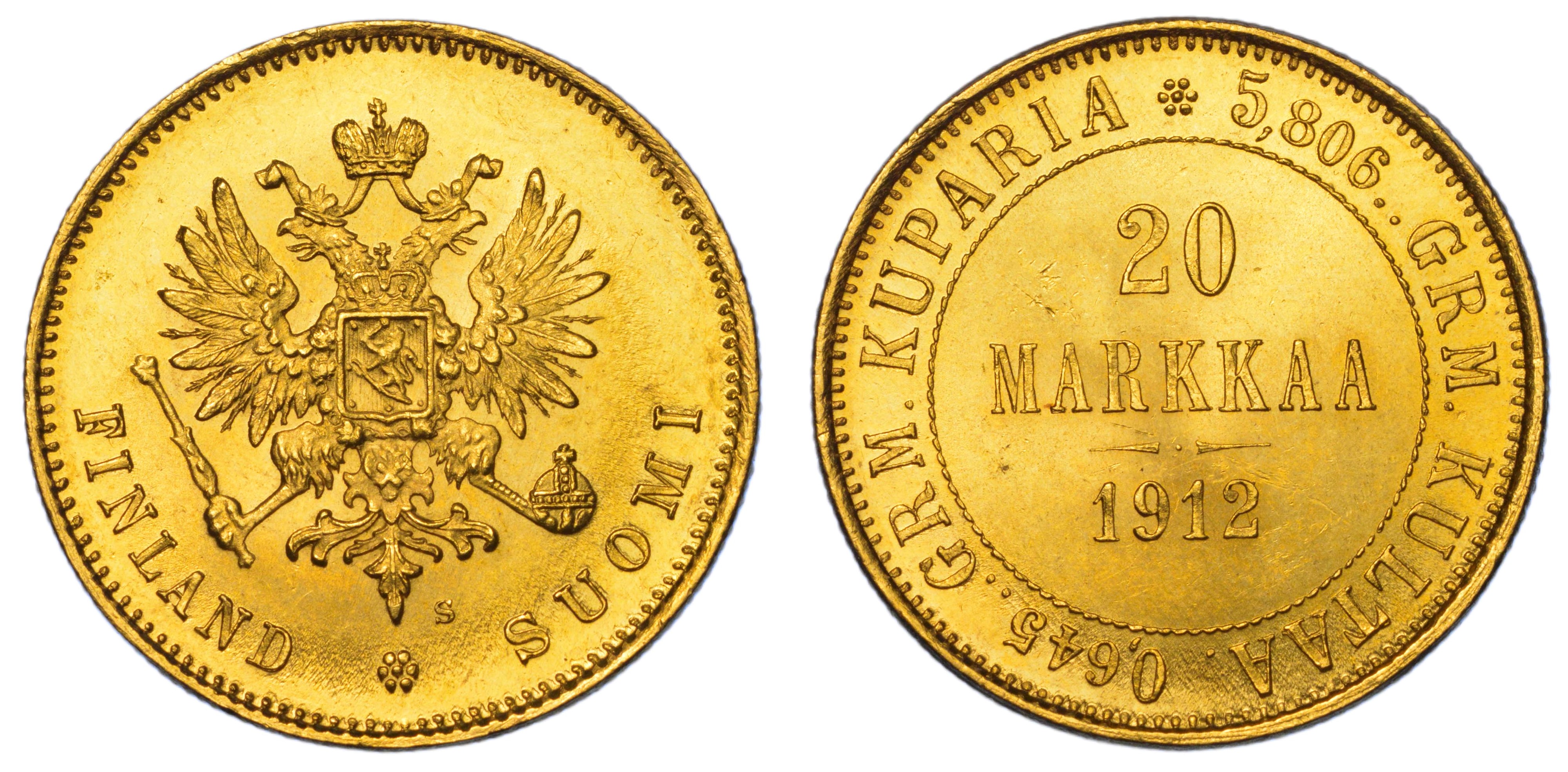 FINLANDIA - OCCUPAZIONE RUSSA. RUSSIA. NIKOLAJ II, 1894-1917. 20 Markkaa 1912.