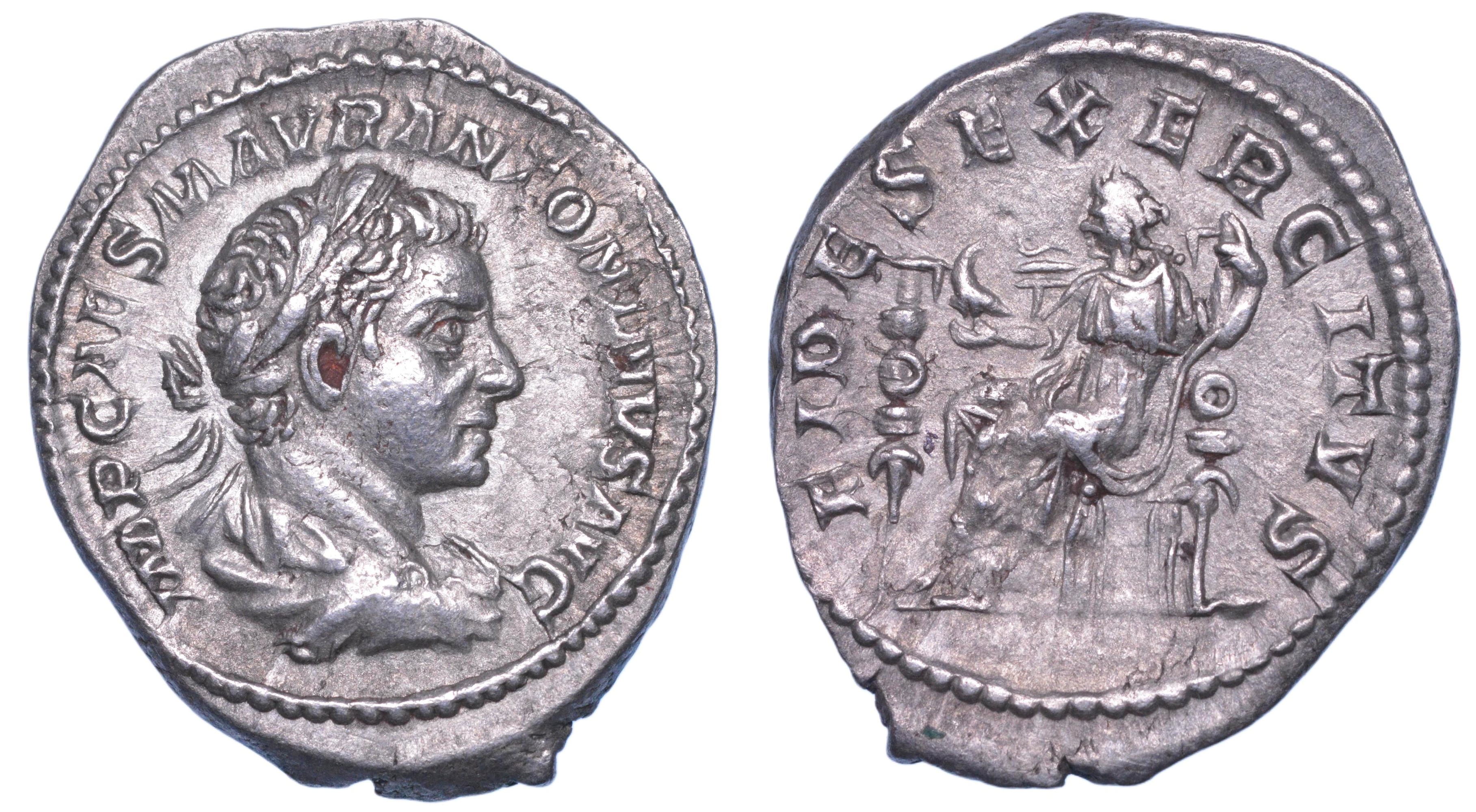 Busto laureato a d. R/ La Fides seduta regge aquila e insegna; a s., insegna. Coh. 32. RIC 71. g. 2,87. Diam. mm. 20,22. Arg. Migliore di BB