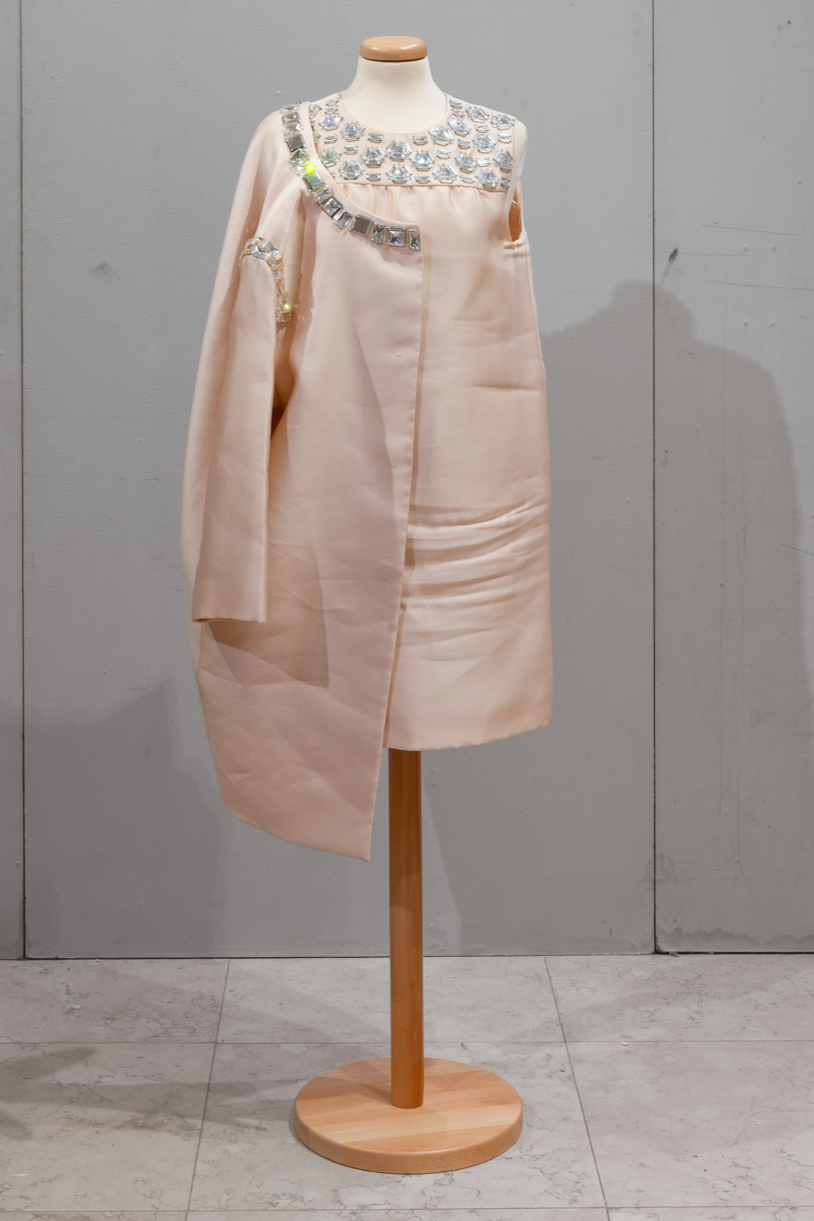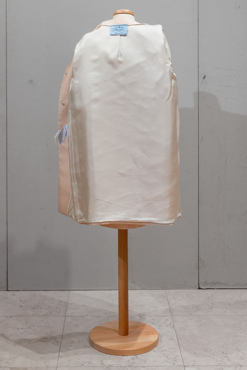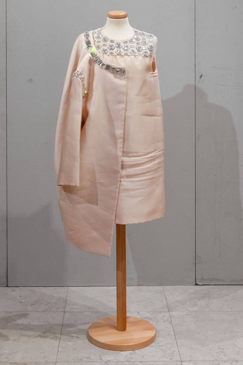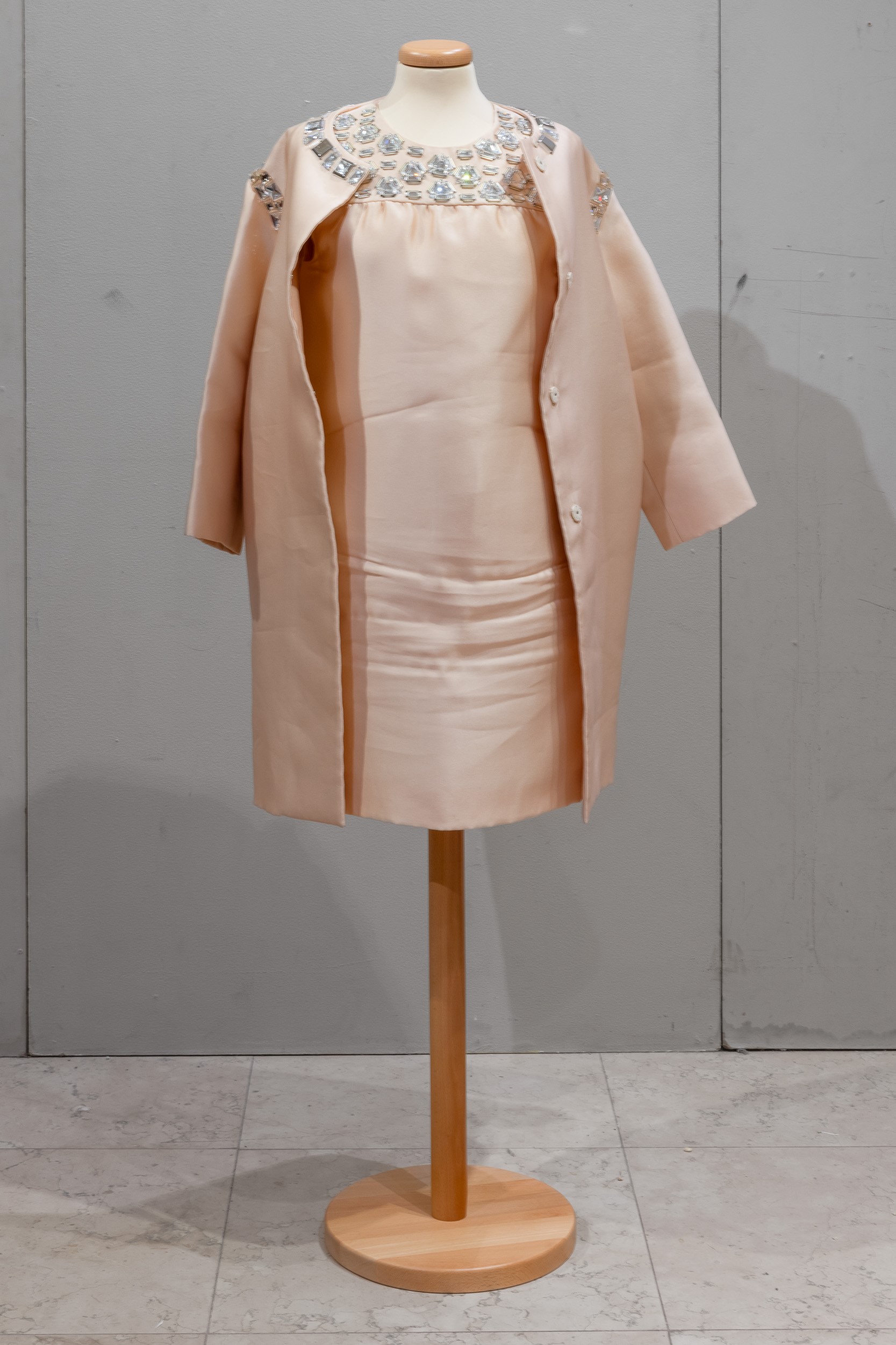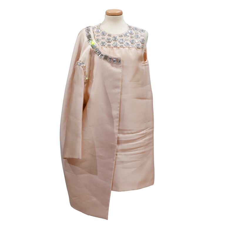 Completo in raso e pietre, con abito e soprabito.