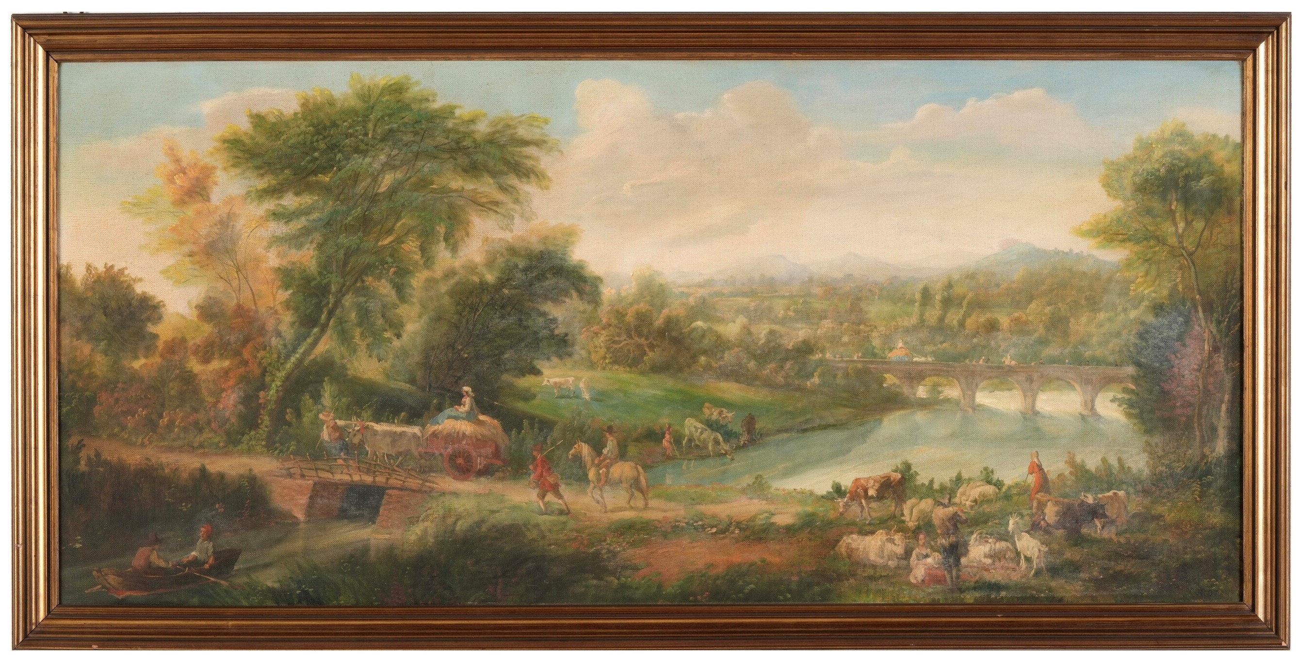 Scuola francese del XIX-XX secolo Paesaggio fluviale con figure e armenti