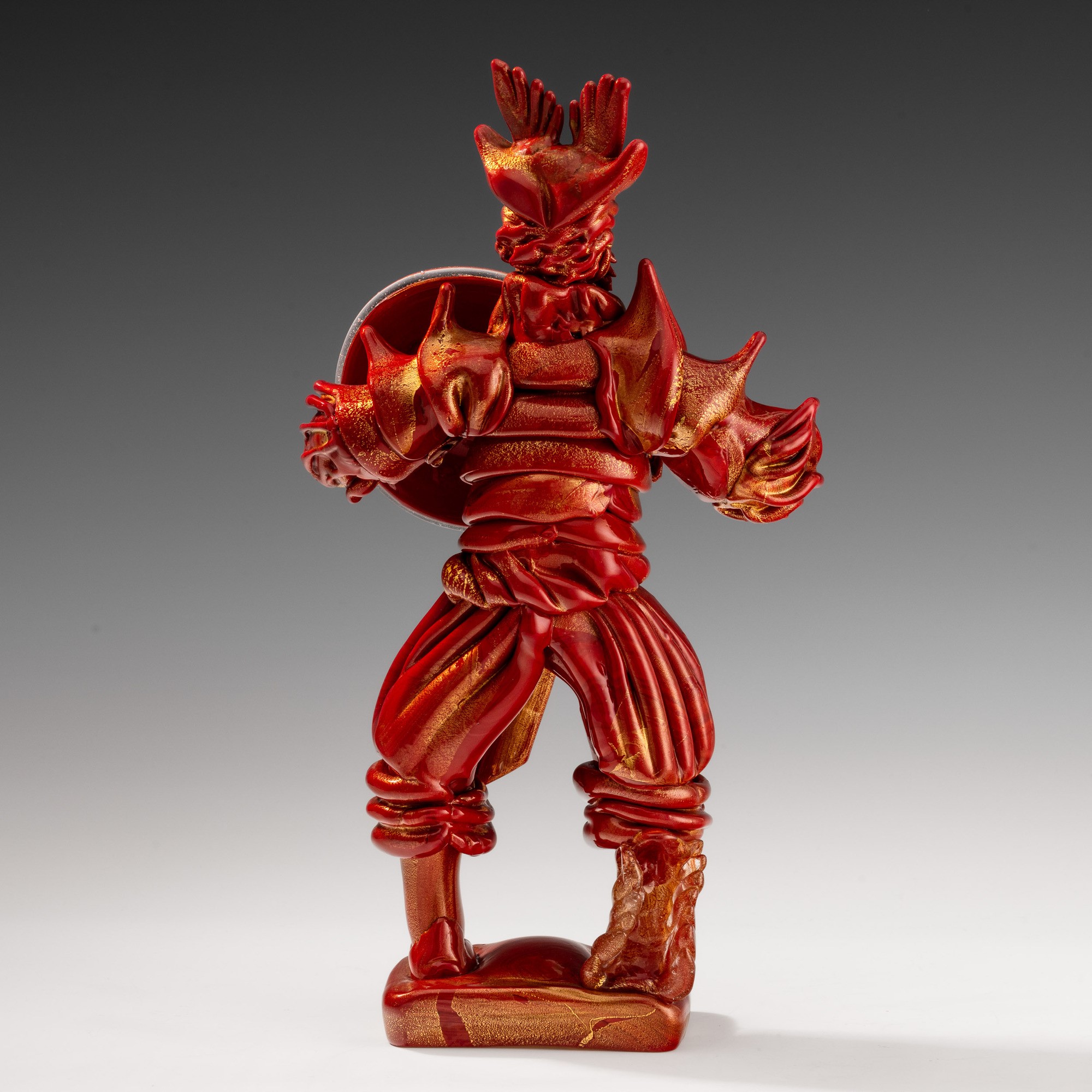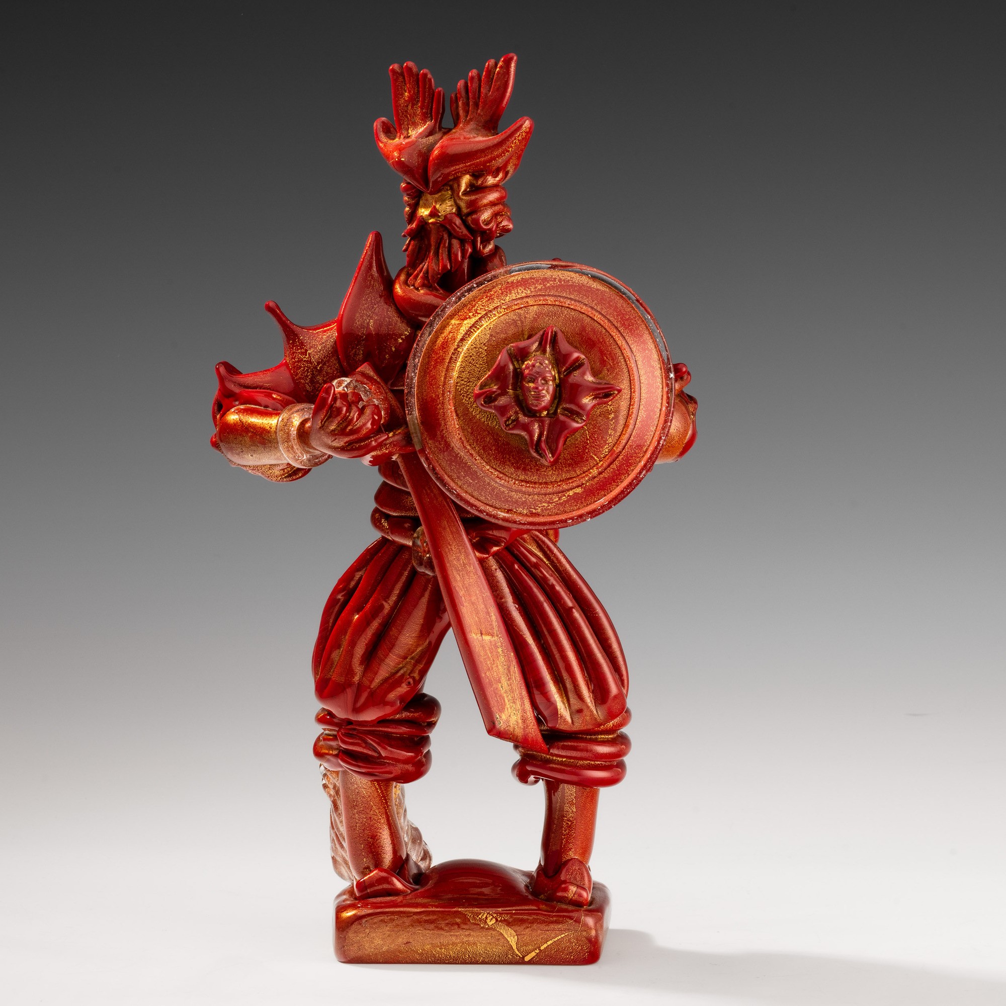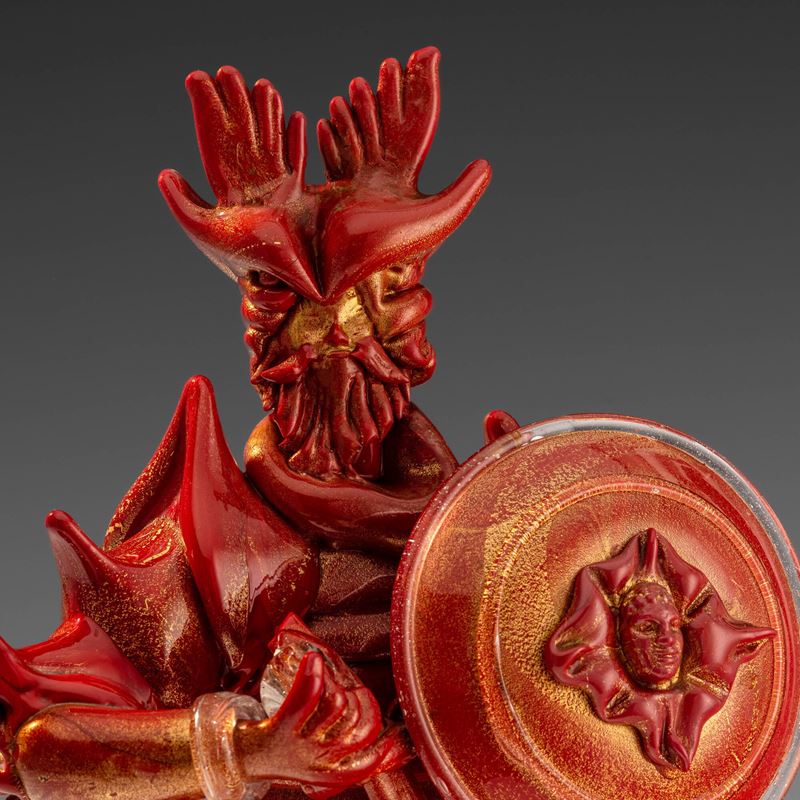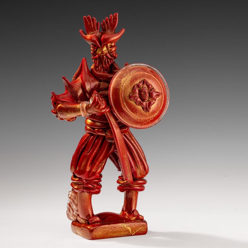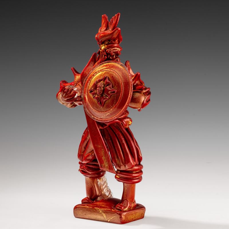 Rara figura di guerriero vichingo con scudo e spada in pasta vitrea rosso corallo su basamento rettangolare e decoro in foglia oro.