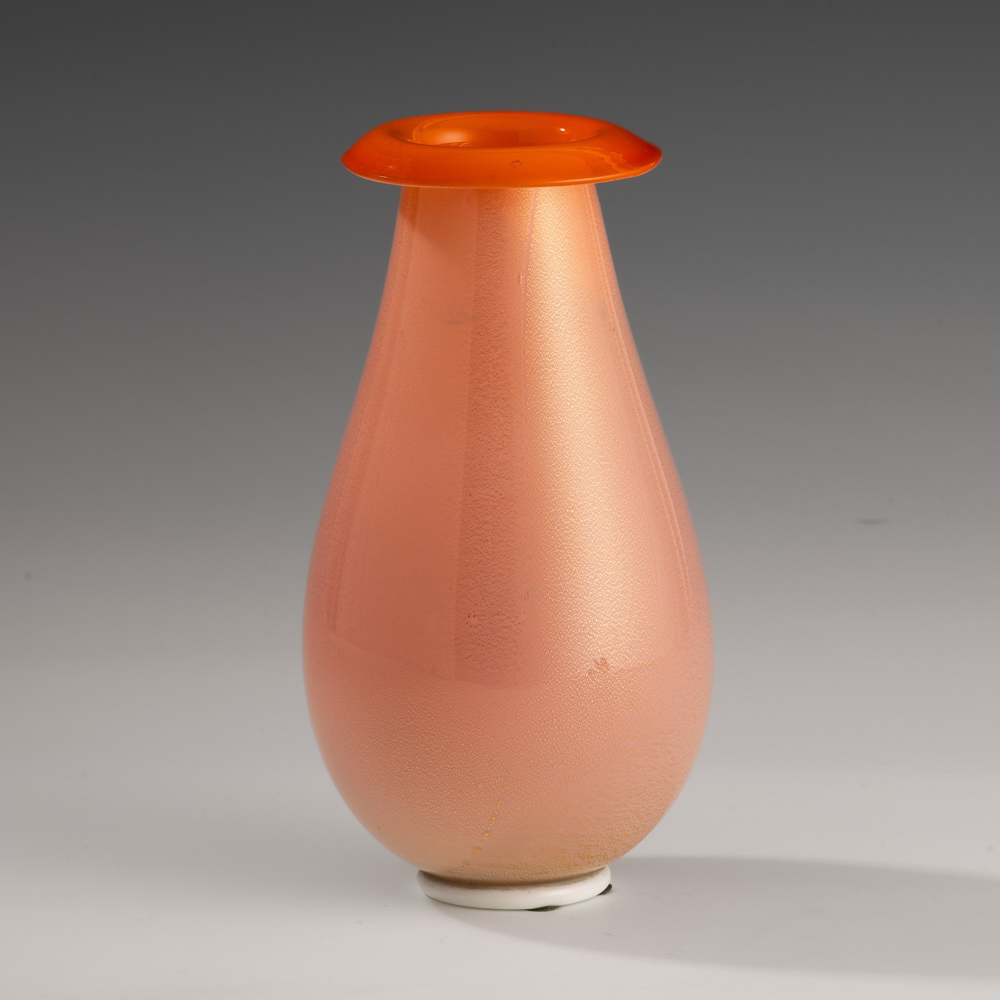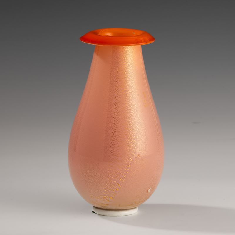 Vaso a goccia con bocca estroflessa in vetro soffiato incamiciato arancione con decoro in foglia oro.
