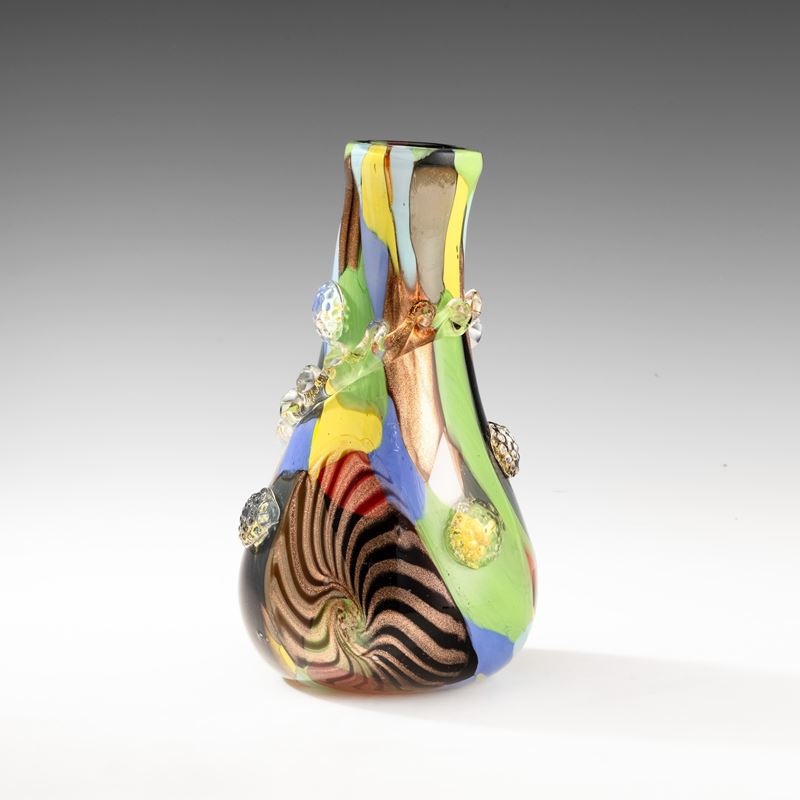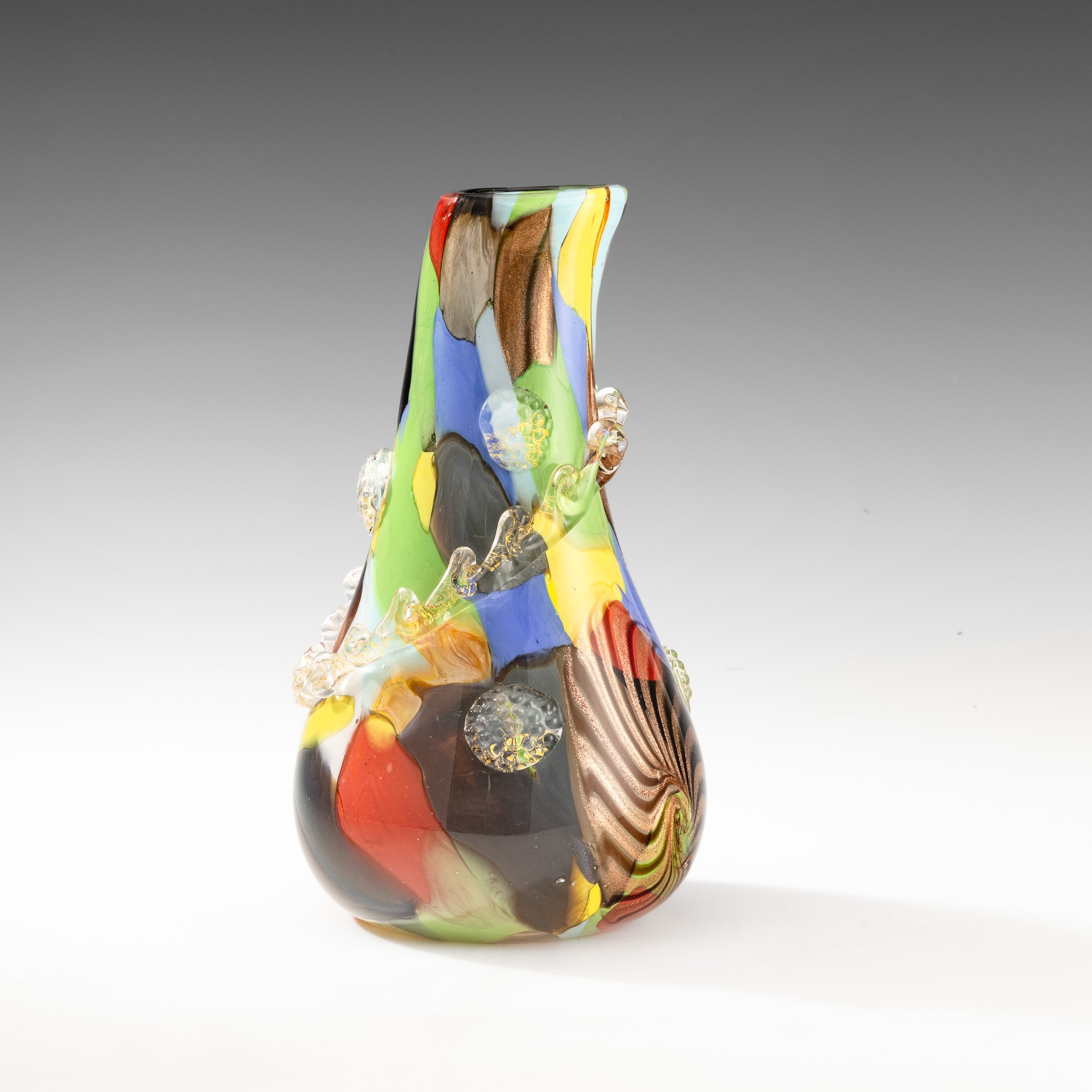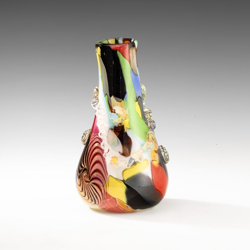 Vaso a goccia asimmetrico in vetro soffiato con decoro di macchie policrome, murrina stellata, avventurina e applicazioni a caldo con foglia oro.