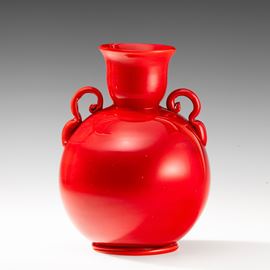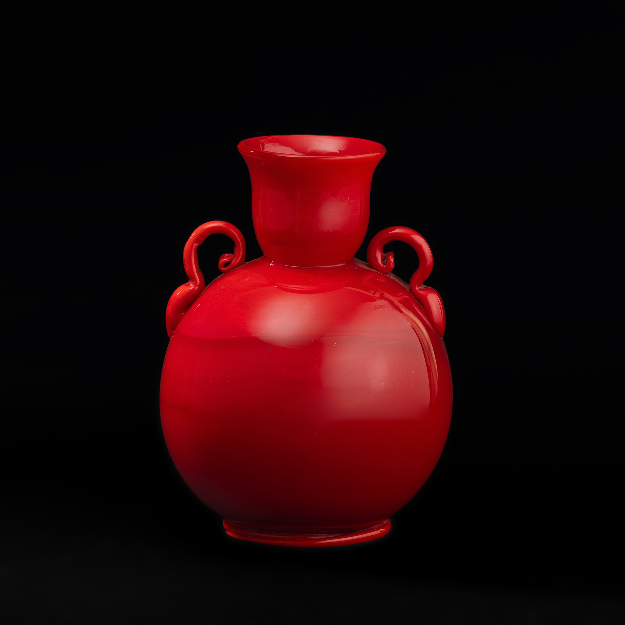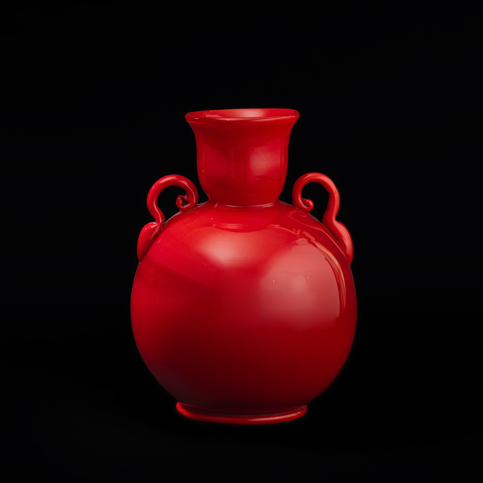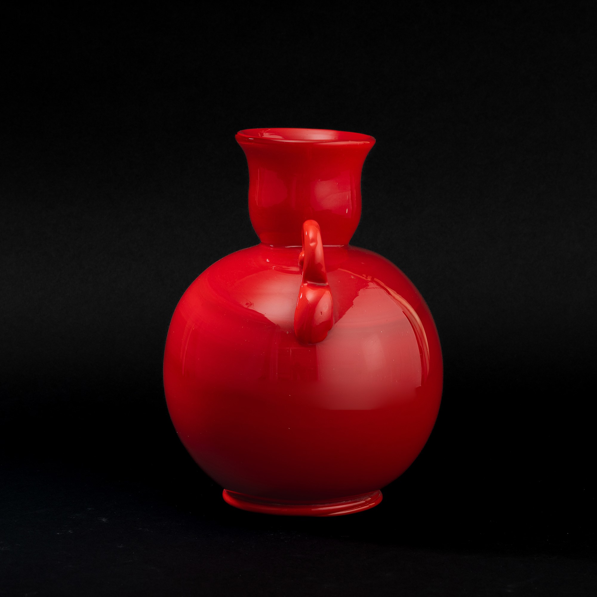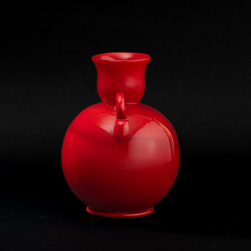 Vaso ad anfora con collo svasato in pasta vitrea rosso corallo. Anse e piede a cordolo applicati.