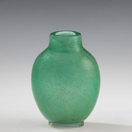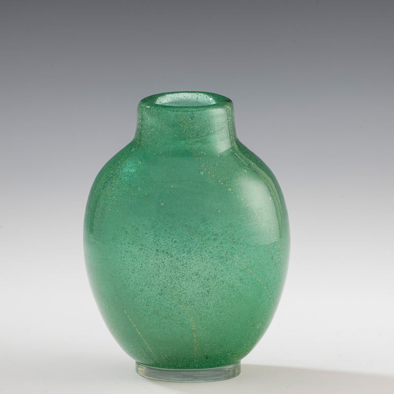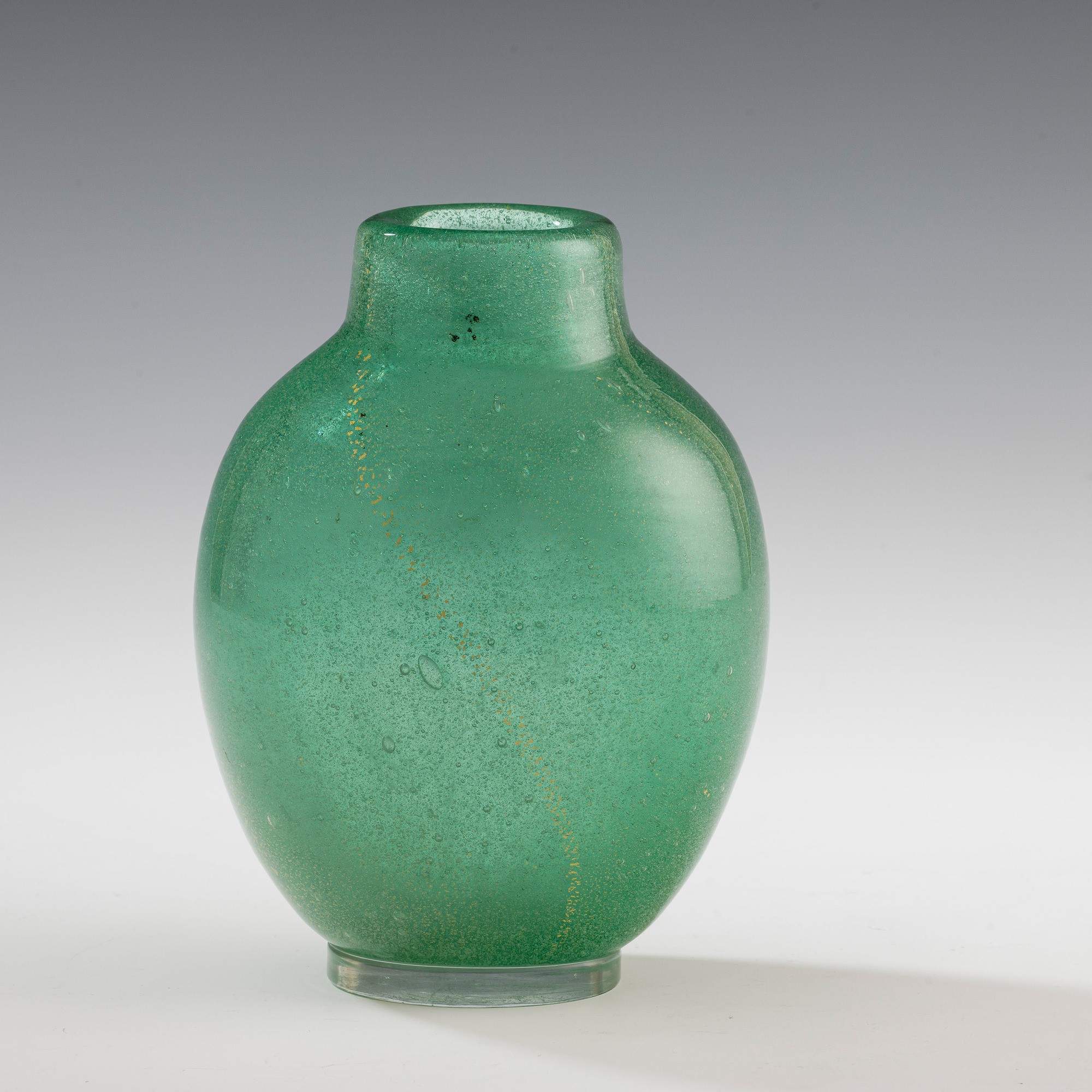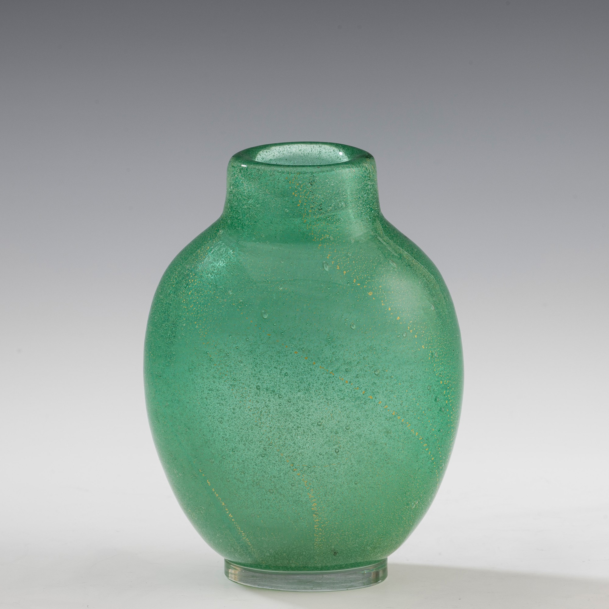 Vaso a sezione ovale in vetro sommerso verde giada A Bollicine con inclusione di foglia oro.