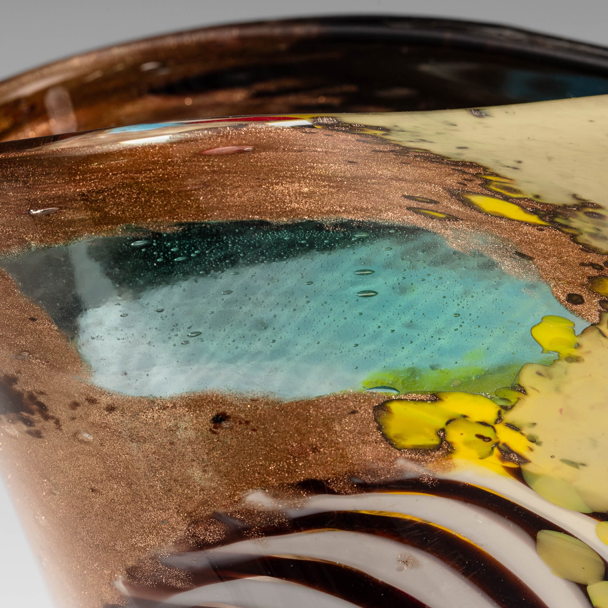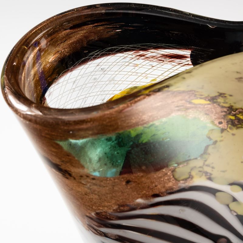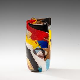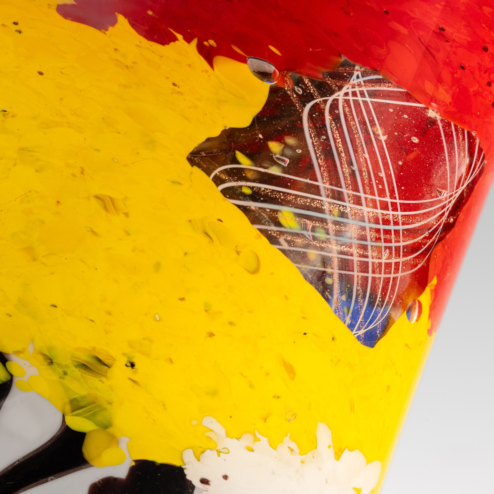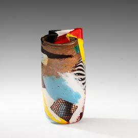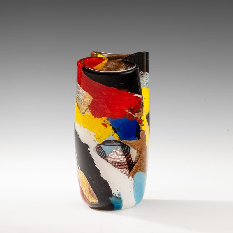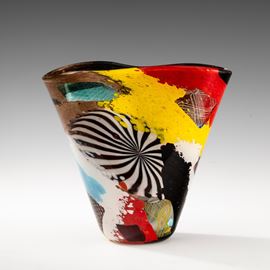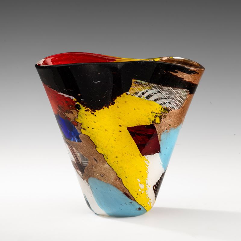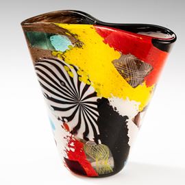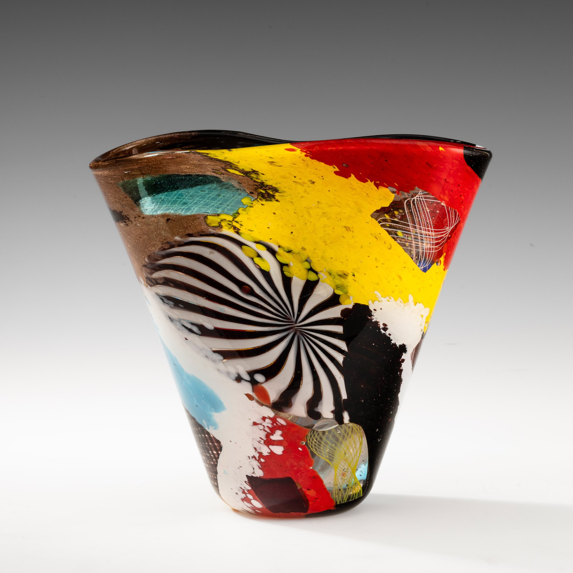 Raro vaso troncoconico a ventaglio serie Oriente in vetro soffiato con decoro di grandi macchie policrome, tessere di canne zanfirico, avventurina e murrina stellata.