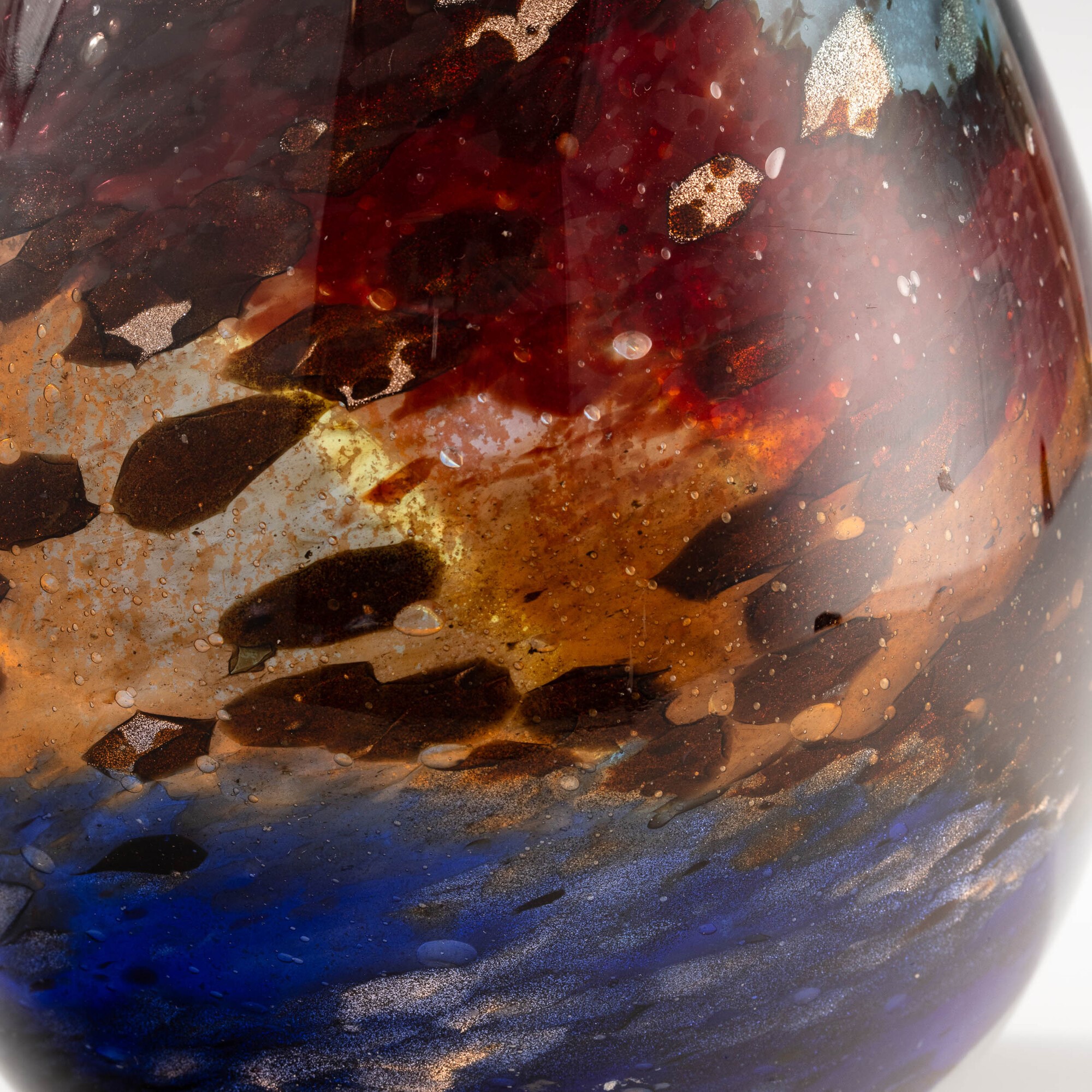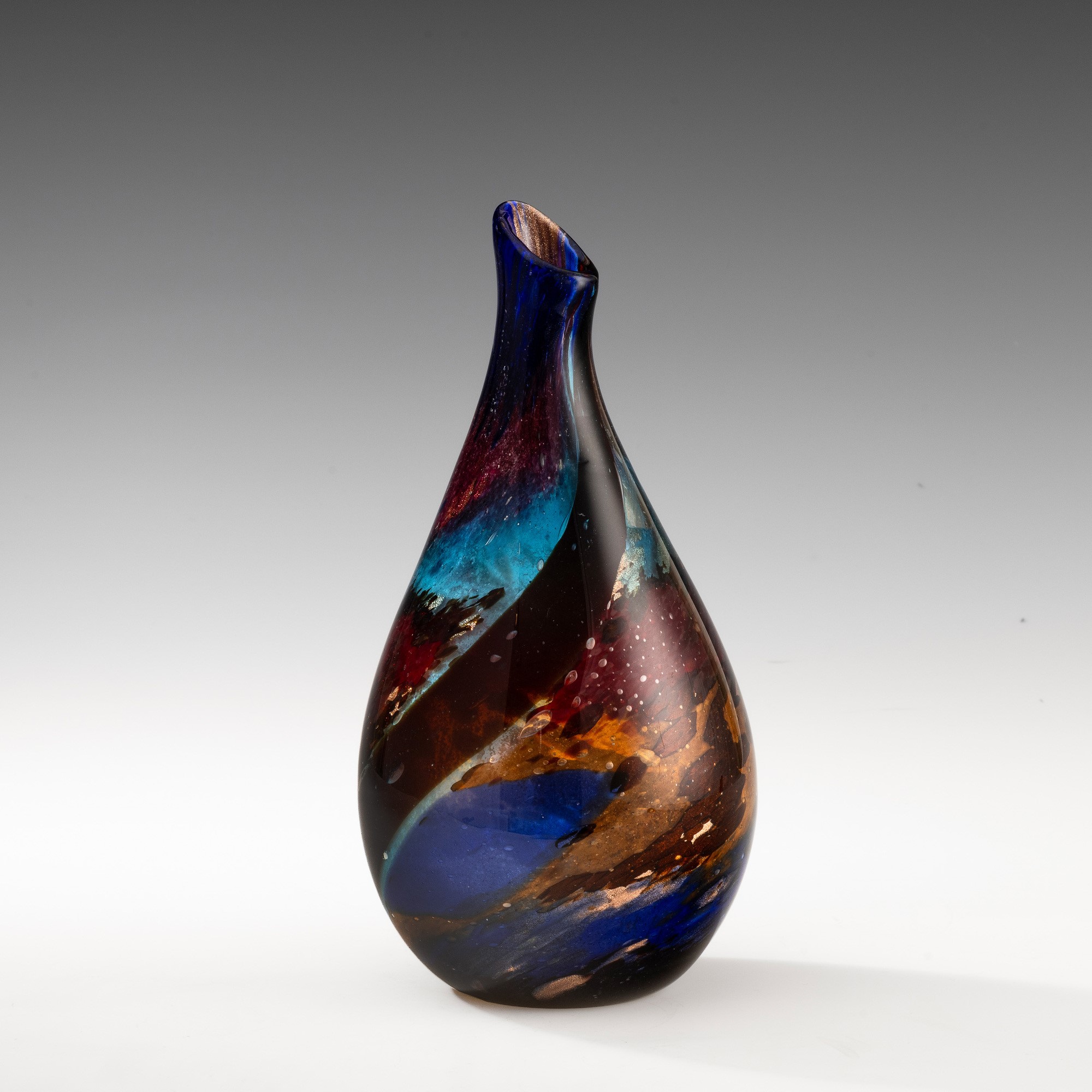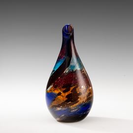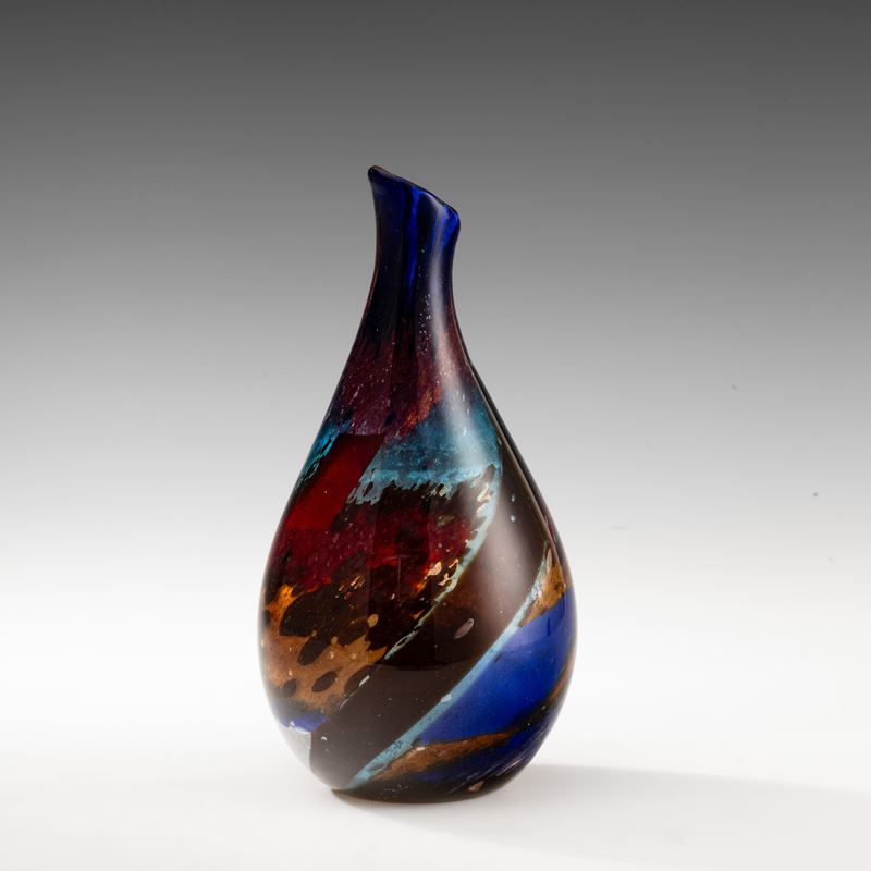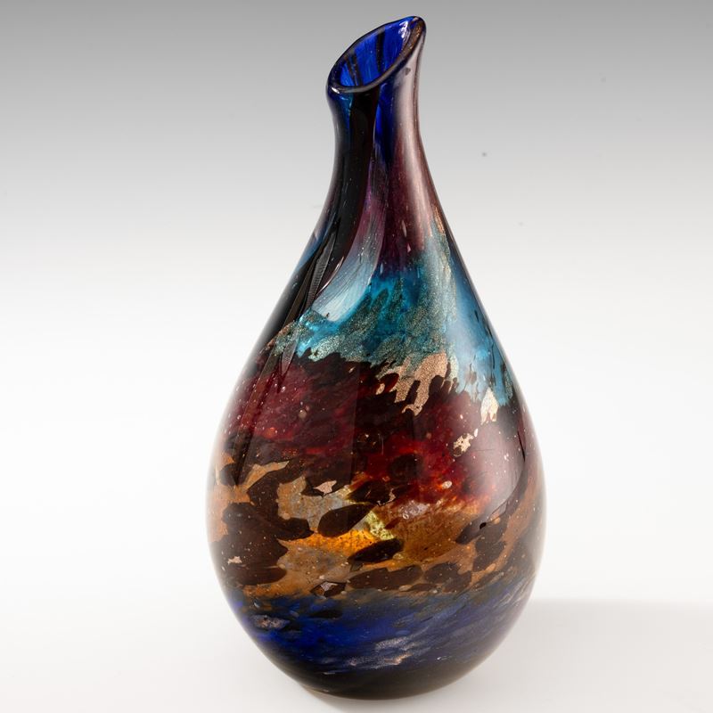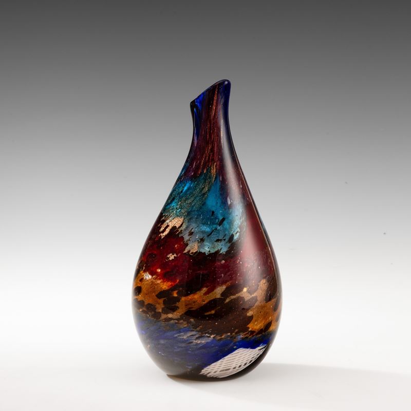 Raro vaso a goccia serie Eldorado in vetro soffiato con decoro di polveri policrome sommerse, tessere a canne zanfirico e avventurina.