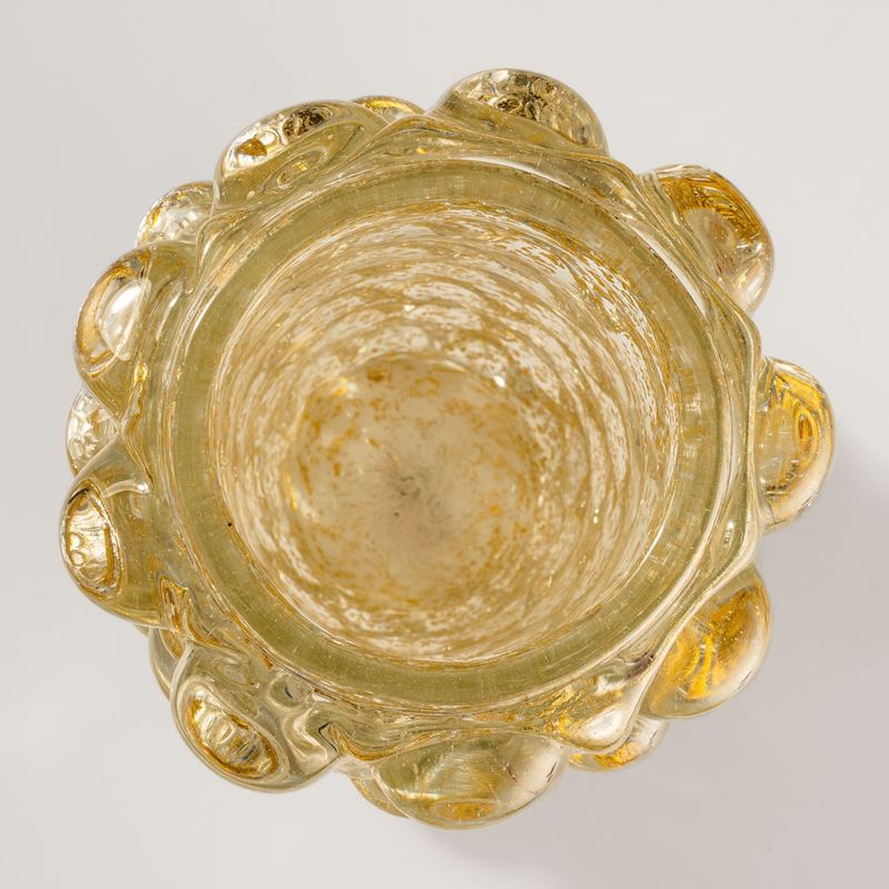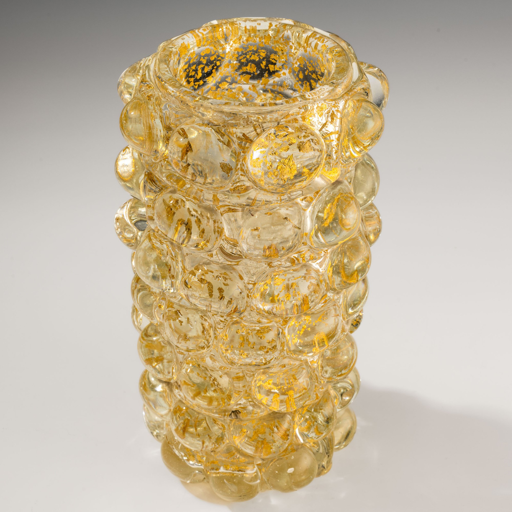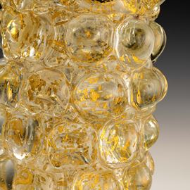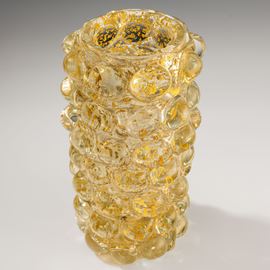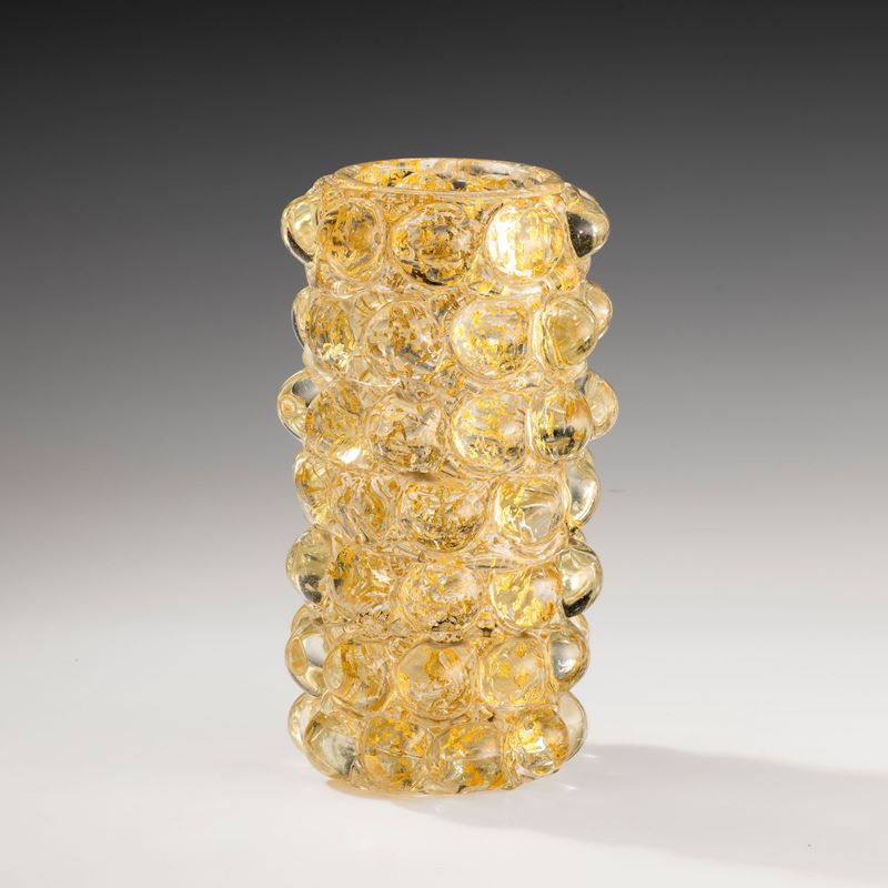 Vaso cilindrico serie Lenti in vetro pesante con decoro stampato di semisfere e inclusione di foglia oro.