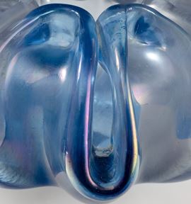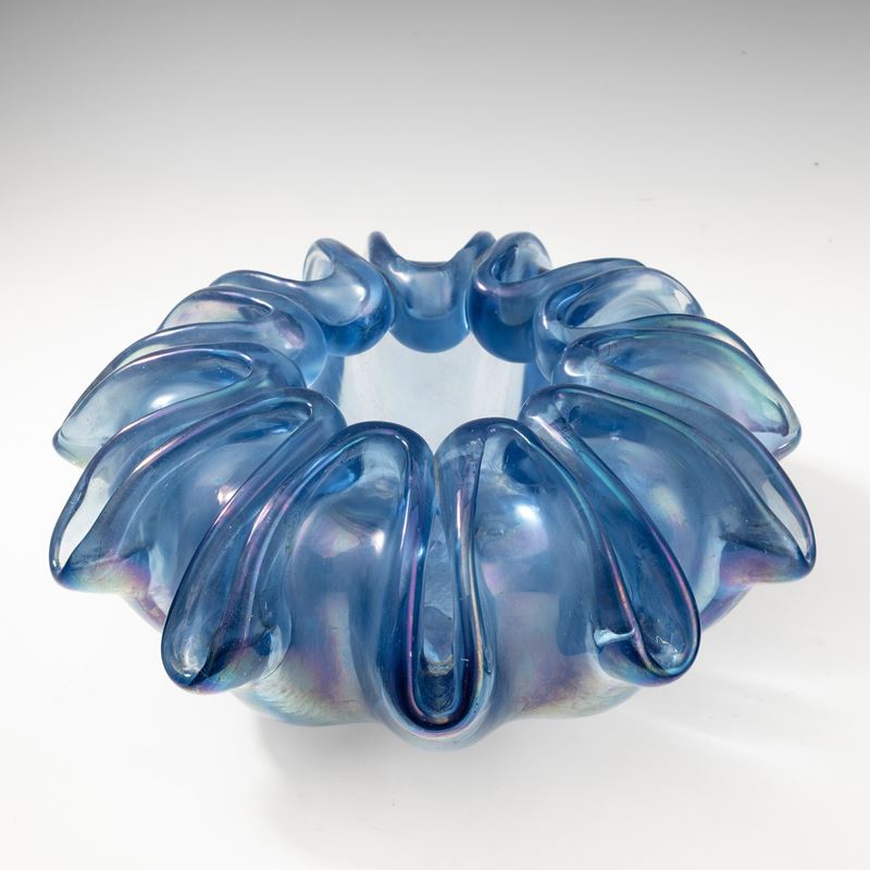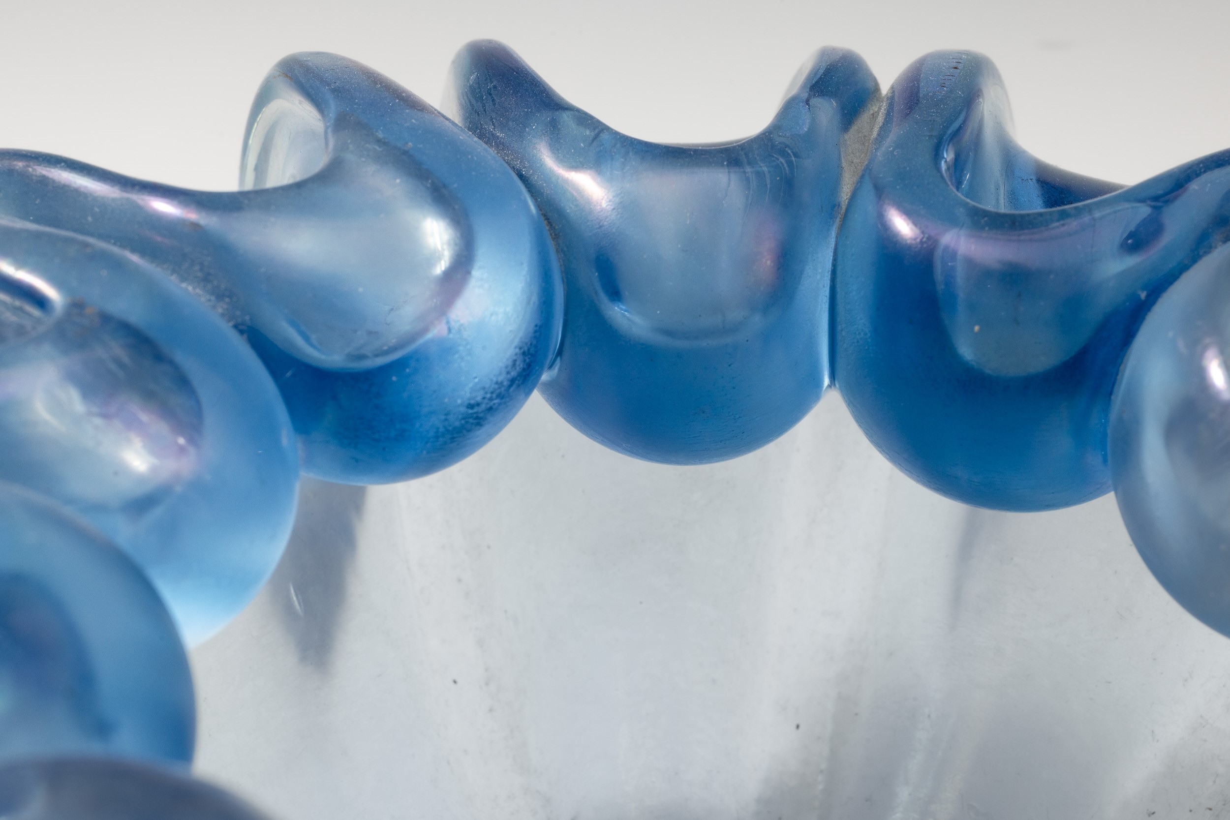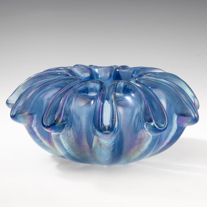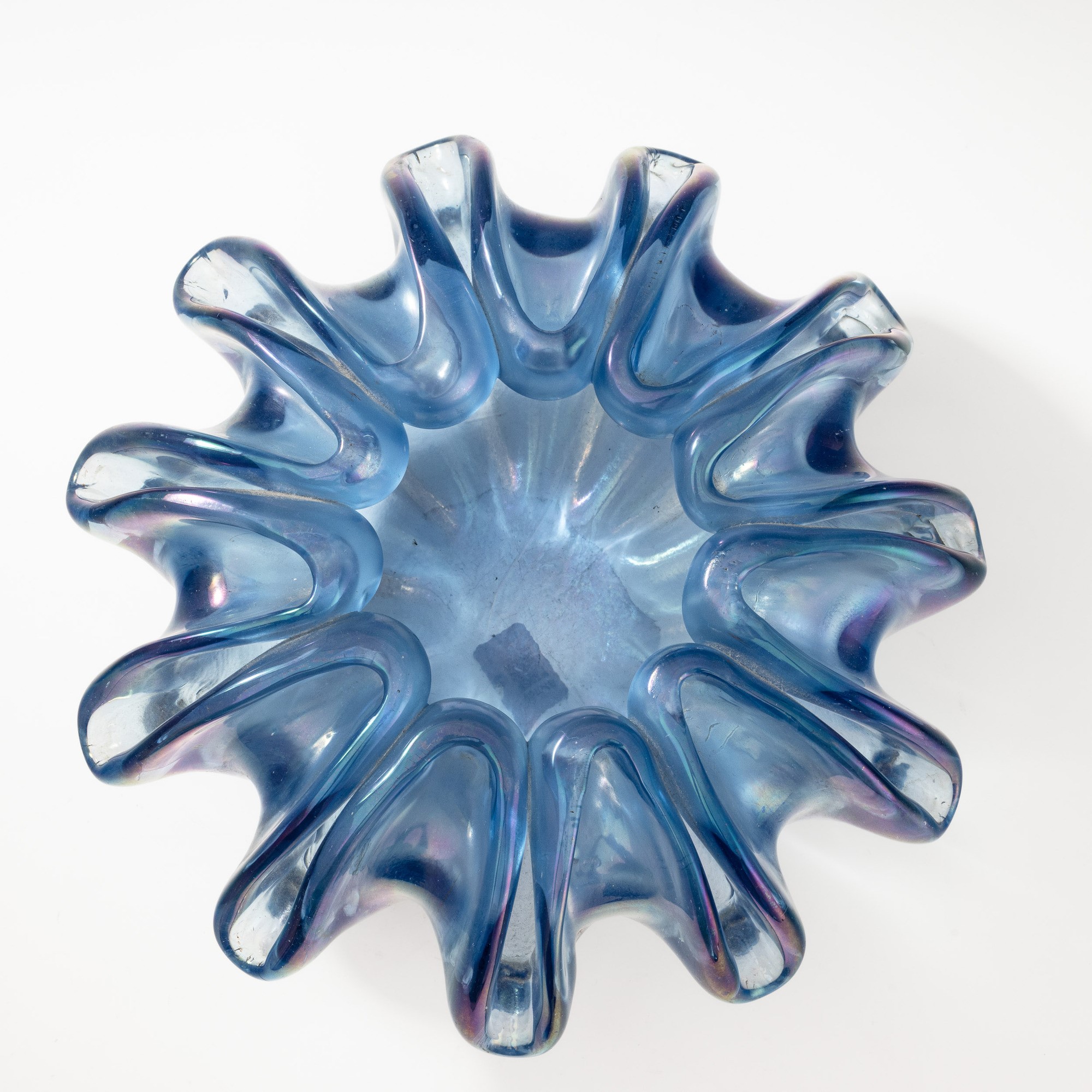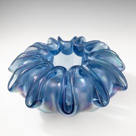 Grande coppa A Grosse Costolature in vetro pesante blu con superficie interamente iridata.