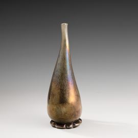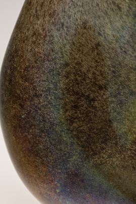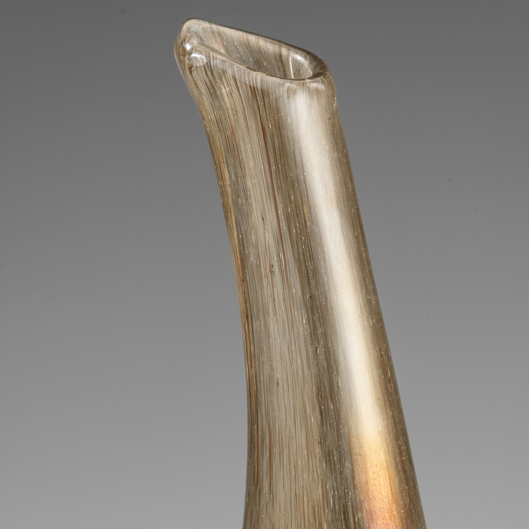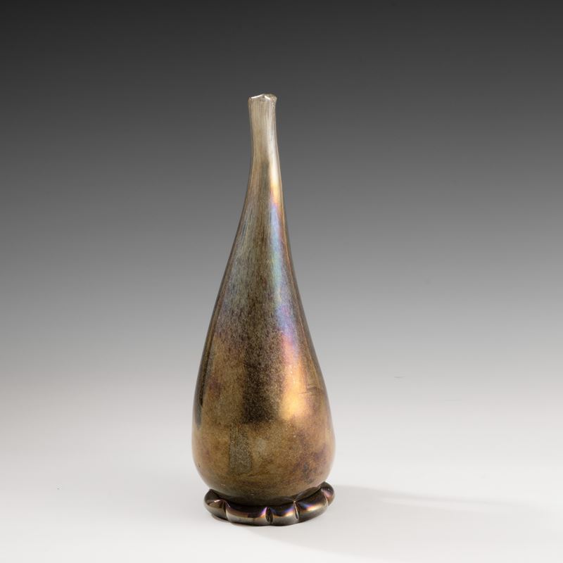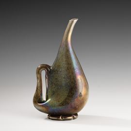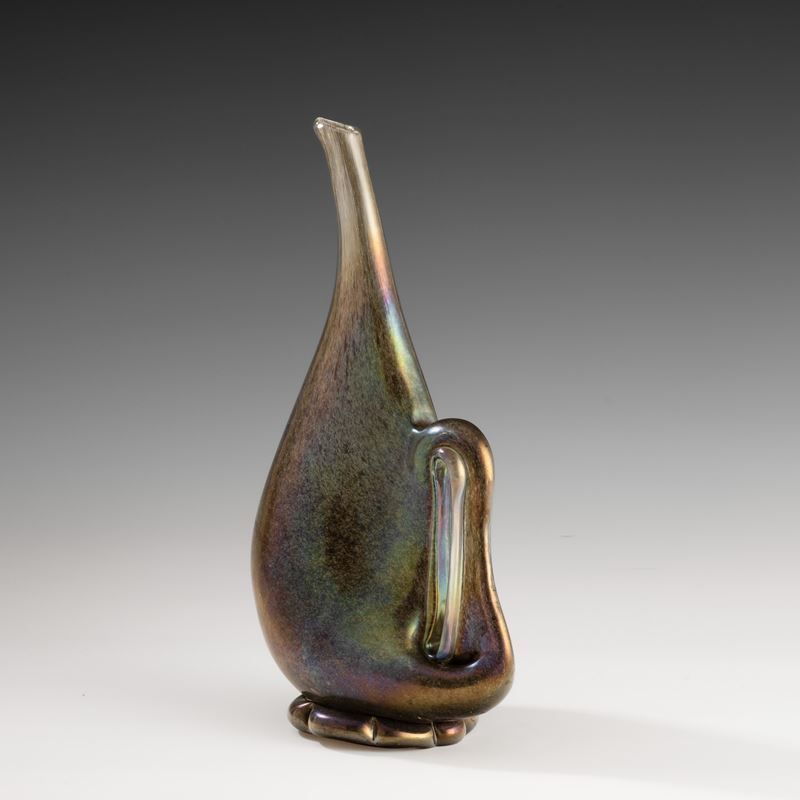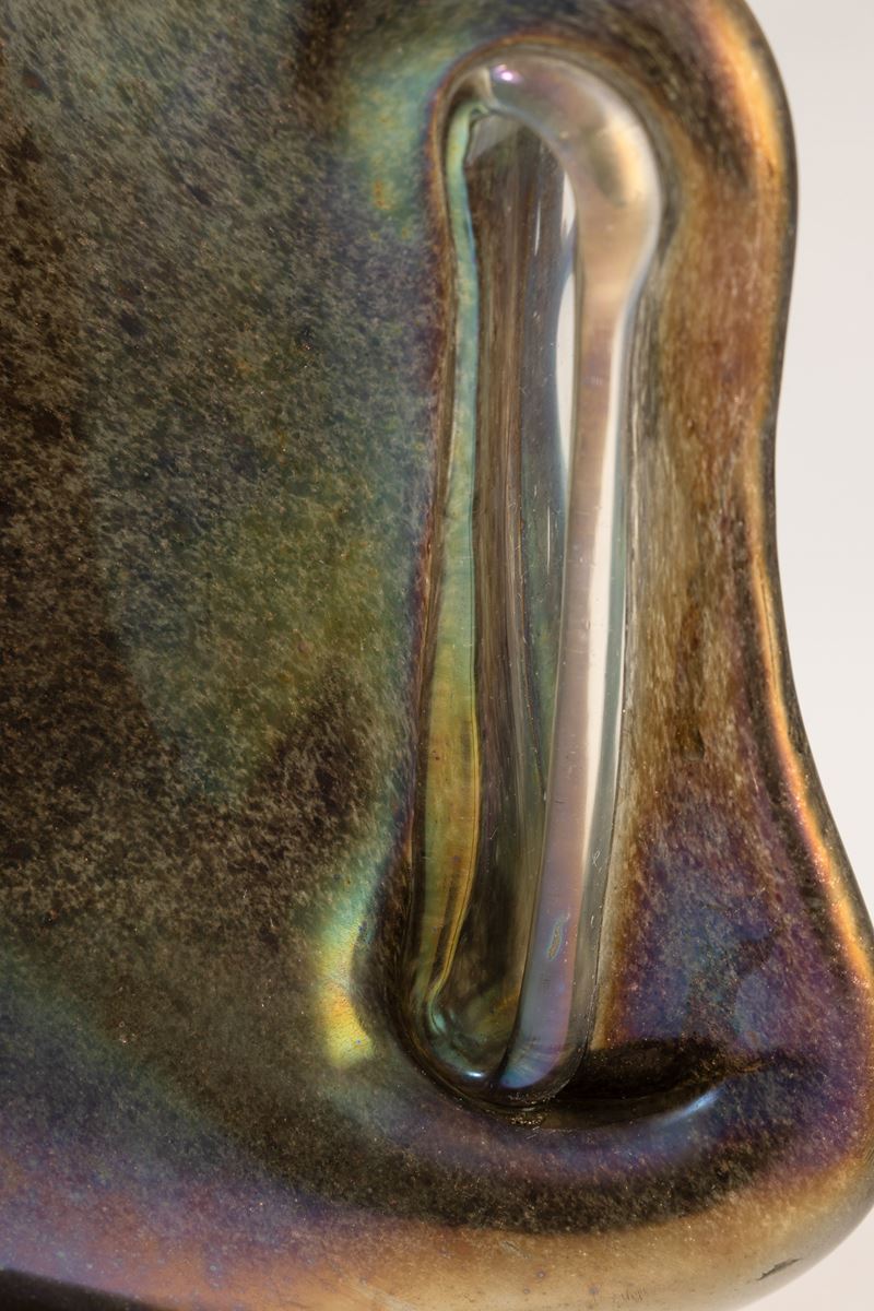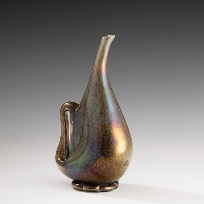Vaso in forma di brocca serie Eugeneo in vetro soffiato con decoro di polveri metalliche, piede applicato e ansa asimmetrica. Superficie fortemente iridata.