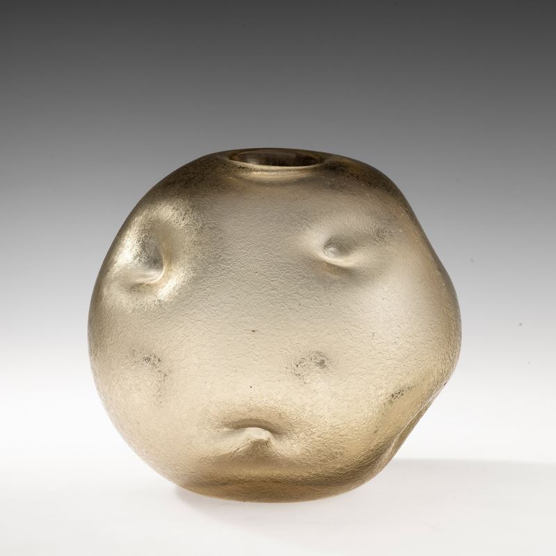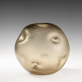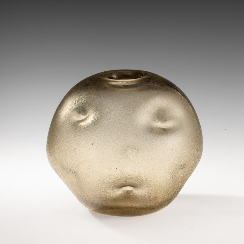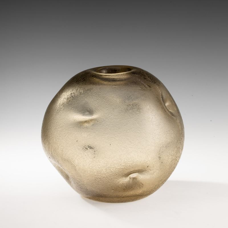 Vaso globulare in vetro pesante con introflessioni e superficie interamente corrosa all'acido.