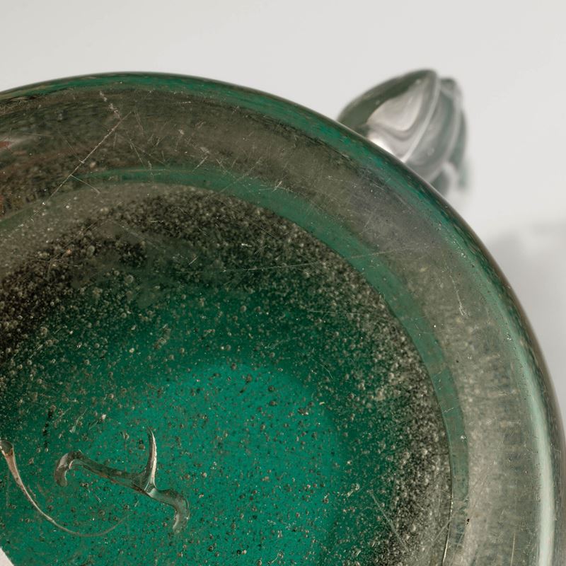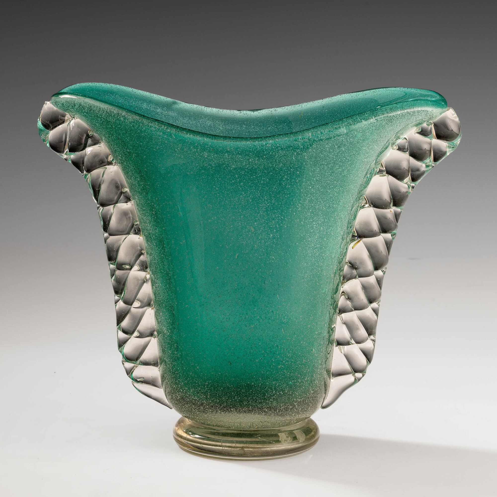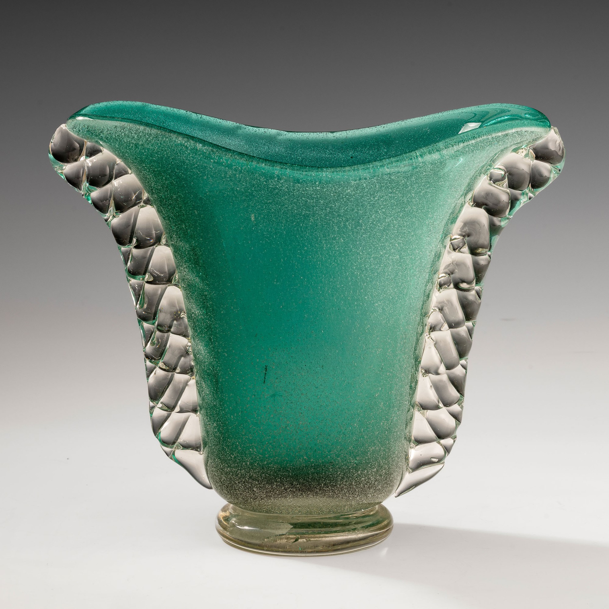 Raro vaso a sezione ovale in vetro sommerso a bollicine verde con anse cordonate e piede circolare applicati.