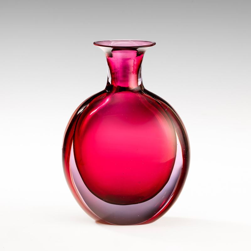 Vaso a balaustro a sezione ovale con collo svasato in vetro sommerso rubino violetto.
