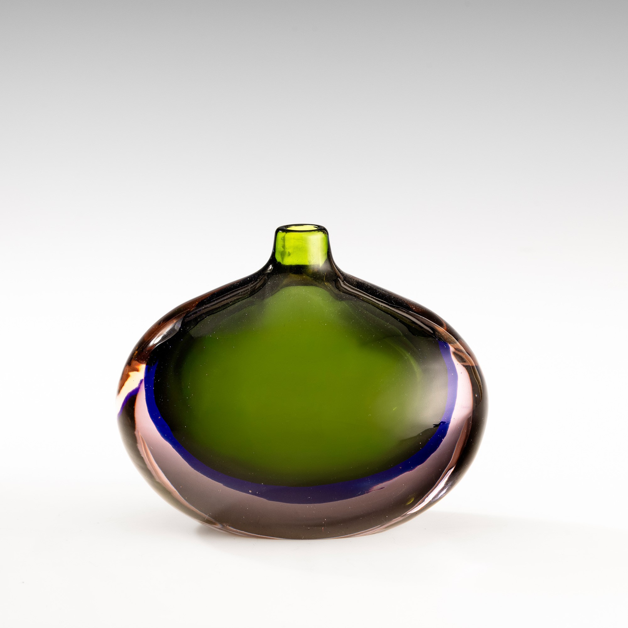 Vaso a uovo con piccolo collo in vetro sommerso verde, filo blu e violetto.