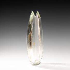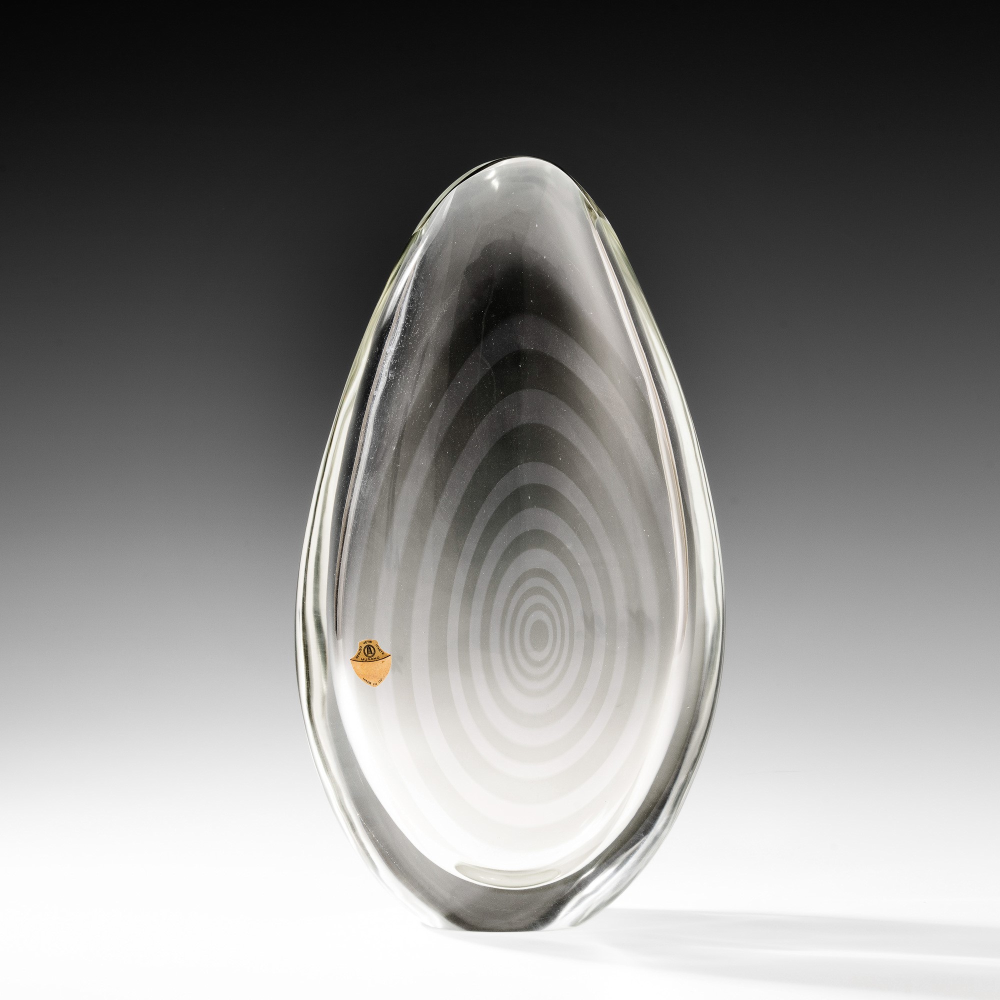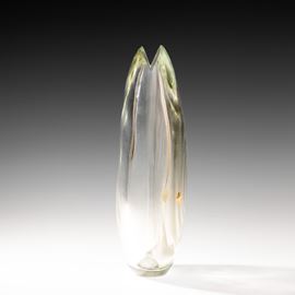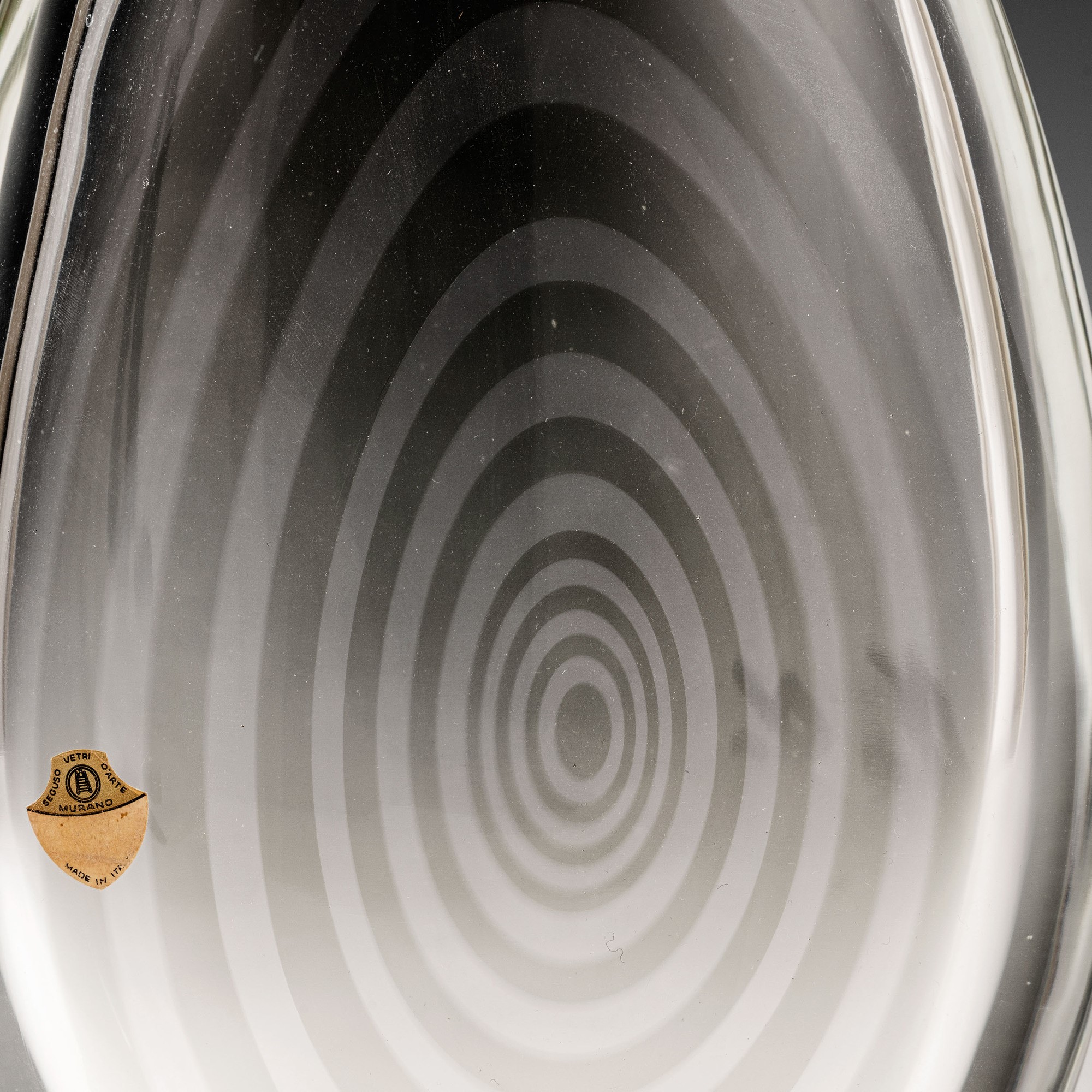 Vaso a goccia serie Siderale a sezione ovale con bocca a taglio in vetro soffiato con decoro di grande murrina ad anelli concentrici. Vecchia etichetta cartacea.