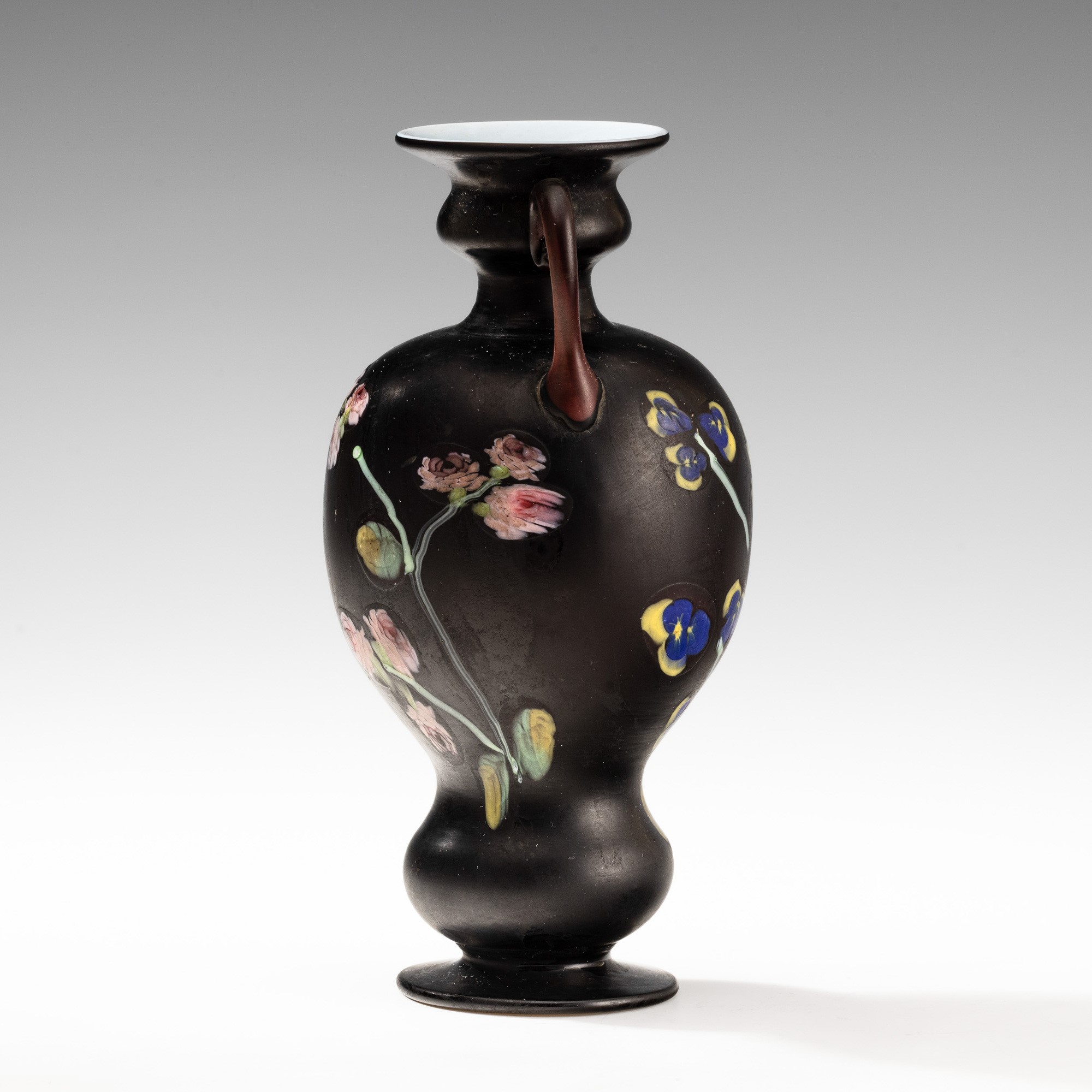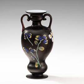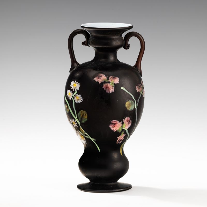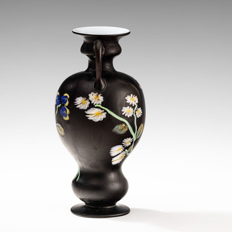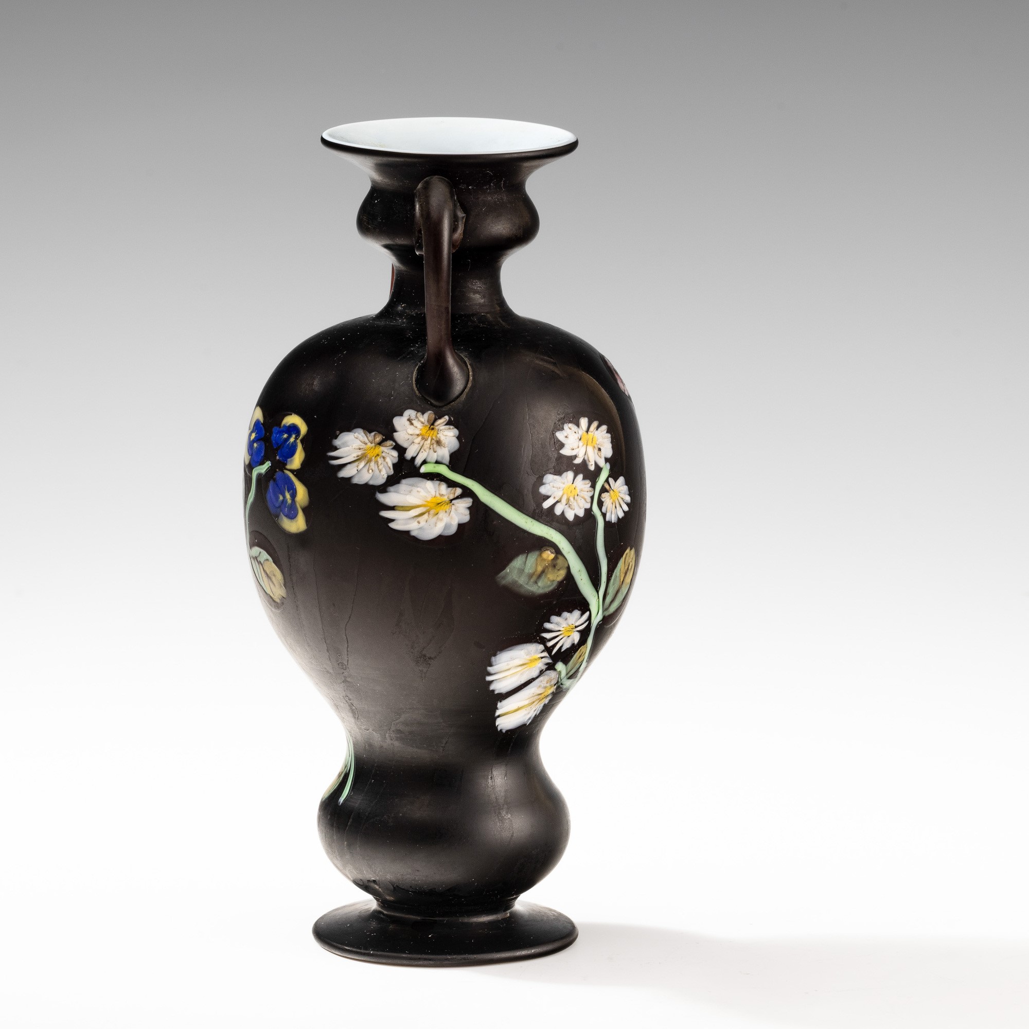 Vaso ad anfora in vetro soffiato opalino con decoro di rami di fiori eseguiti a murrine policrome. Anse applicate.