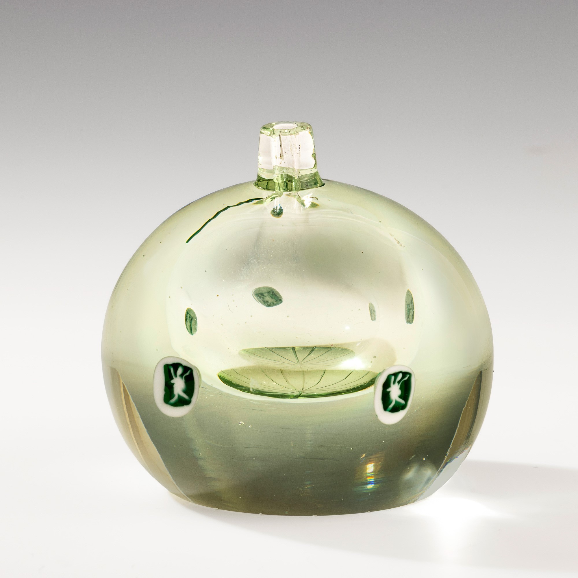 Vaso globulare in vetro pesante trasparente e piccolo collo con decoro di murrine raffiguranti nudini.