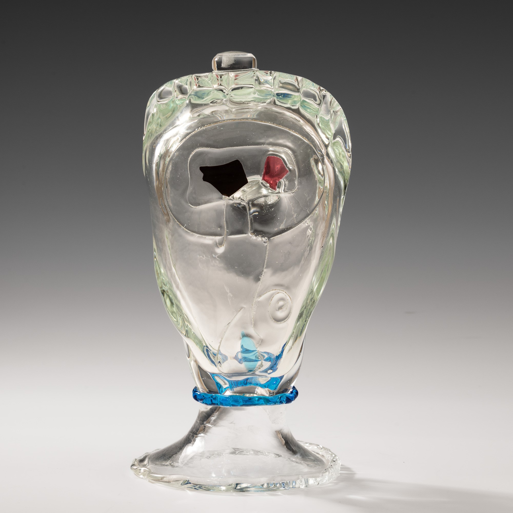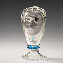 Scultura raffigurante testa informale in vetro soffiato con applicazioni di tessere policrome e filo blu.