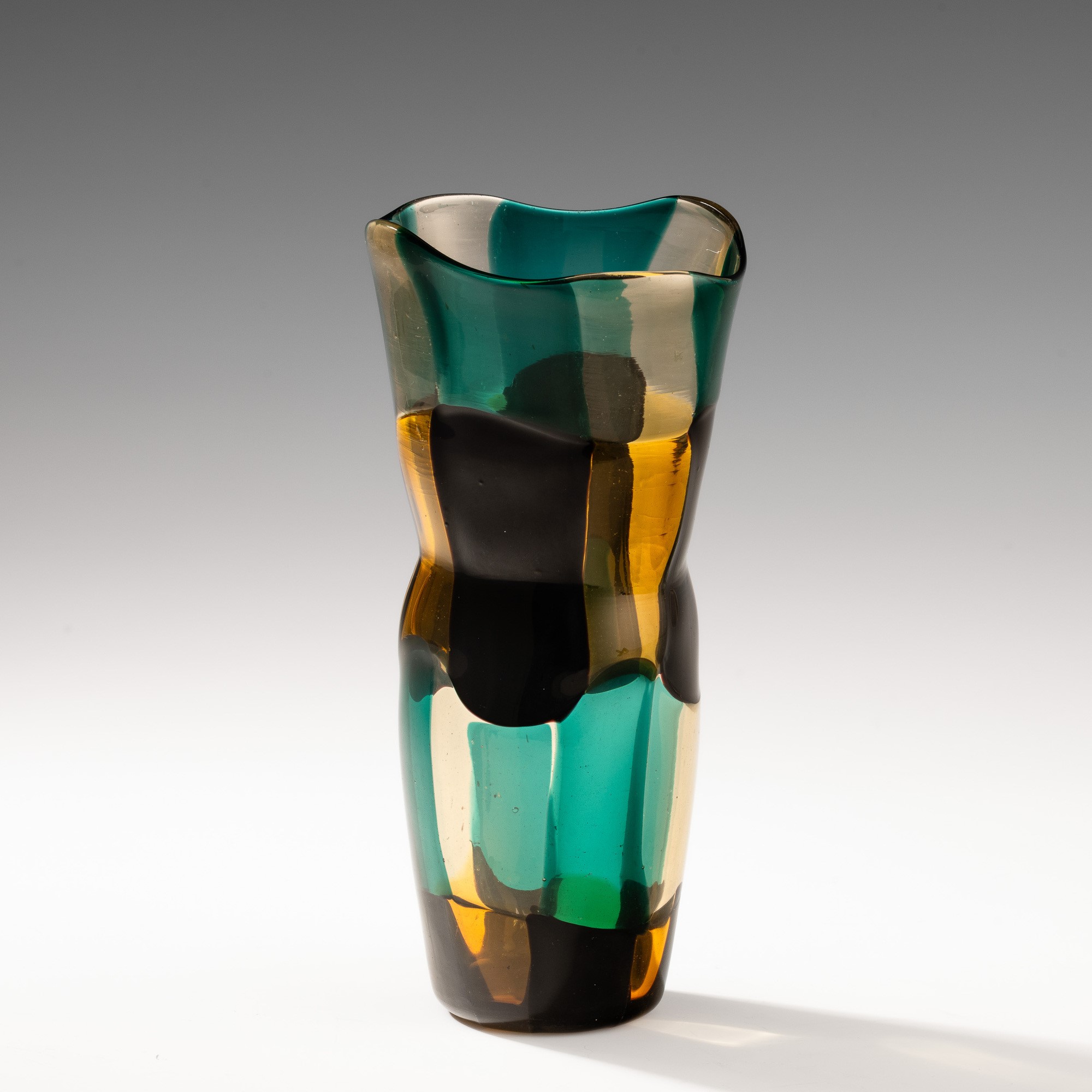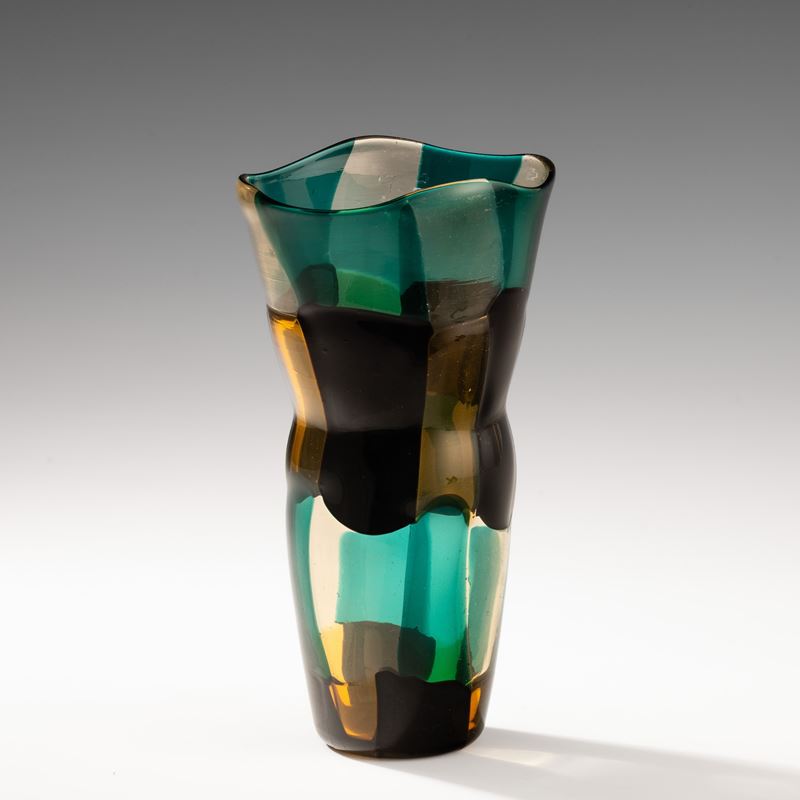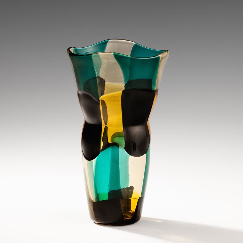 Vaso serie Pezzati di forma troncoconica a sezione ovale e strozzatura centrale in vetro soffiato con decoro di tessere pagliesco, giallo, nero e verde (variante America).