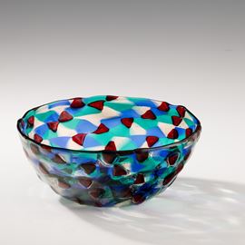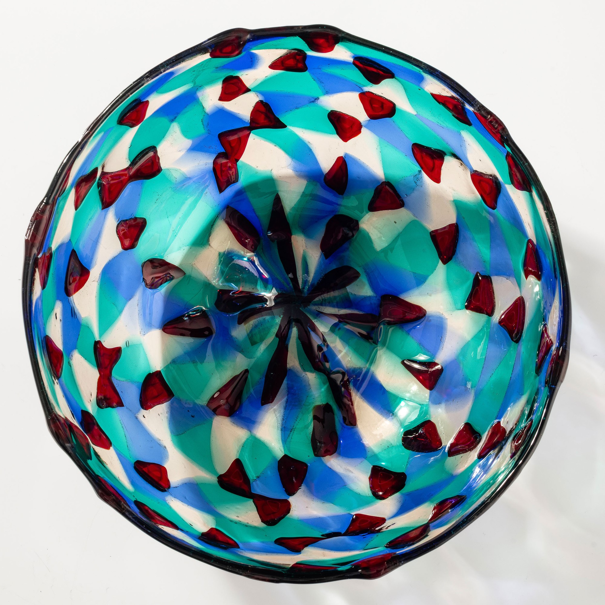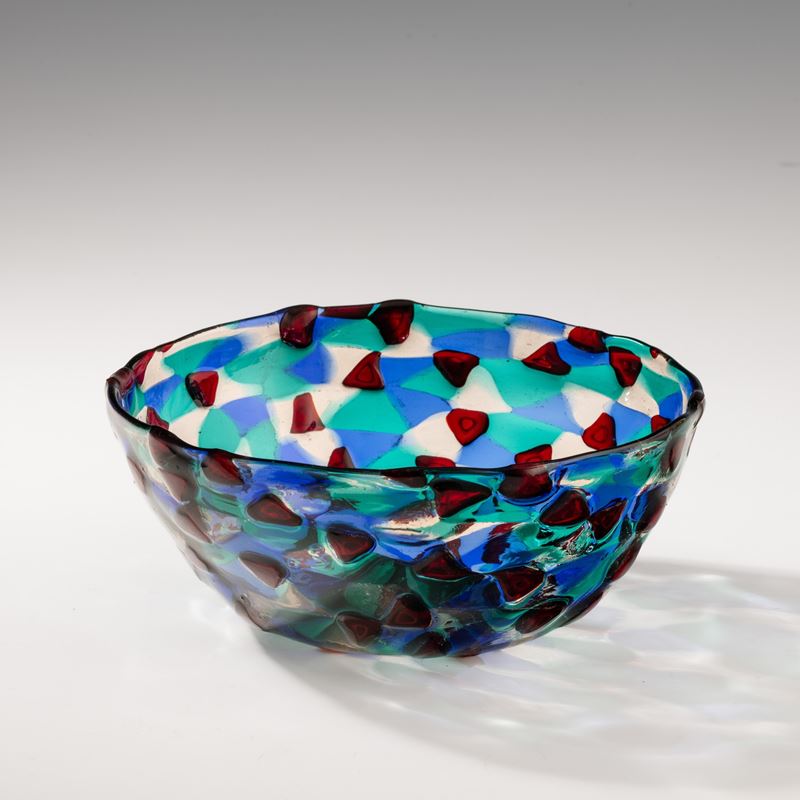 Rara coppa in vetro soffiato con decoro di mosaico a tessere triangolari trasparenti rosso, zaffiro, verde e pagliesco.