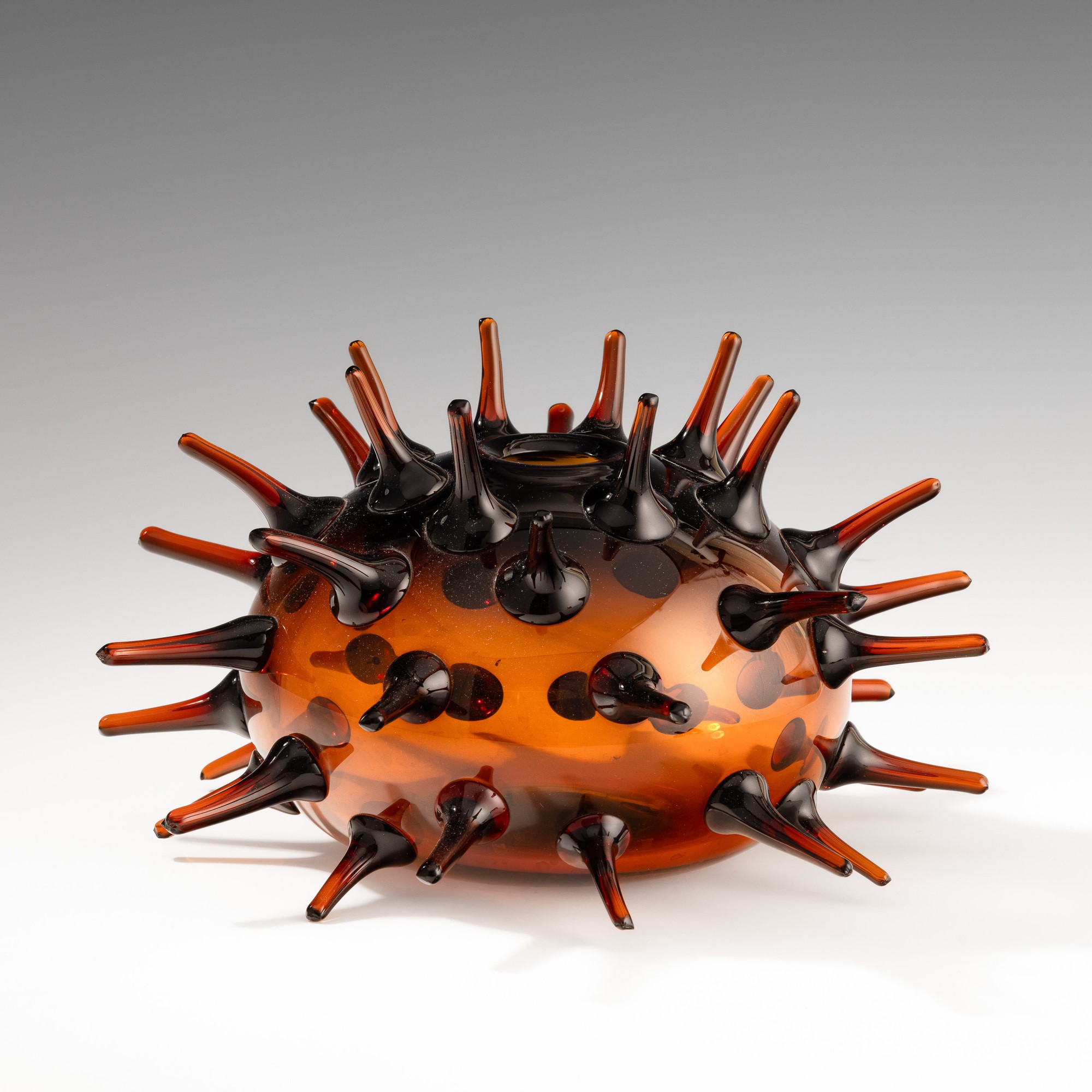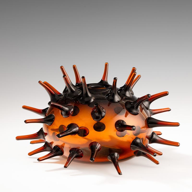 Vaso prototipo della serie Riccio in vetro ambra con decoro di lunghe spine soffiate applicate.