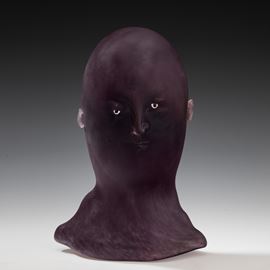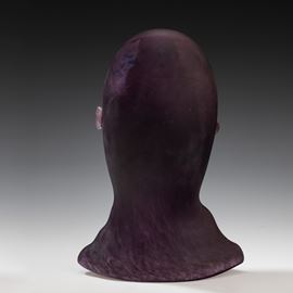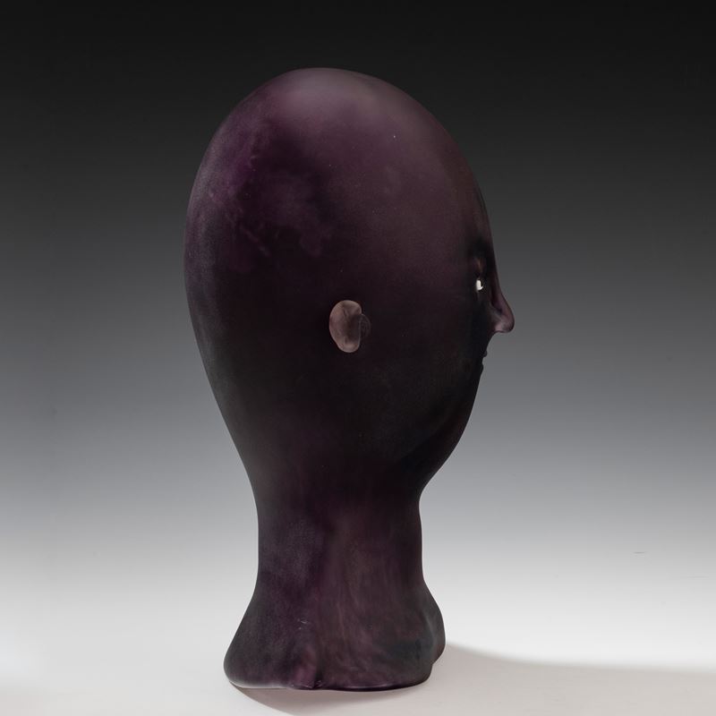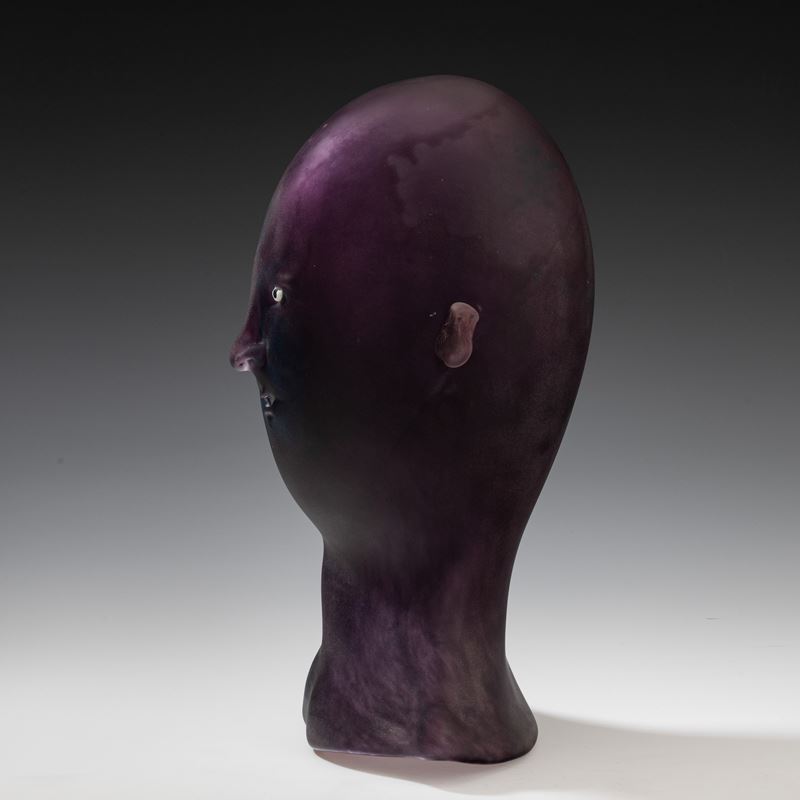Scultura in forma di testa d'uomo in vetro soffiato ametista modellato a mano.