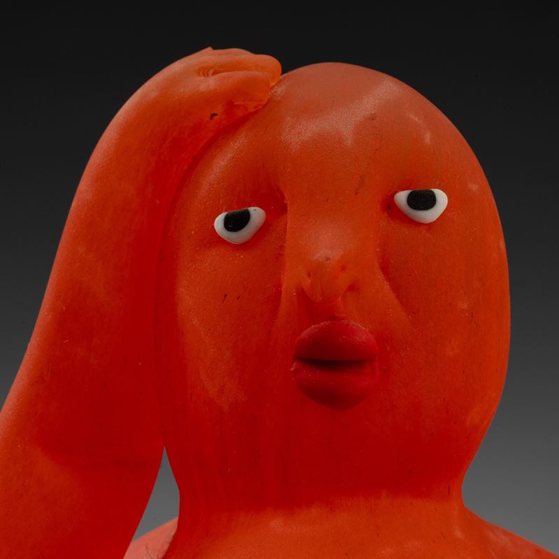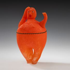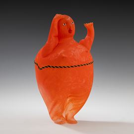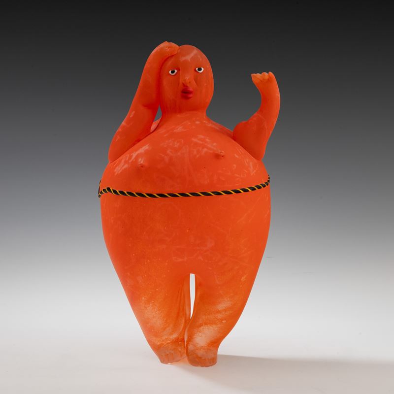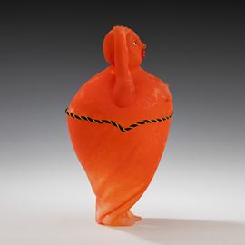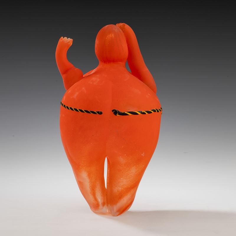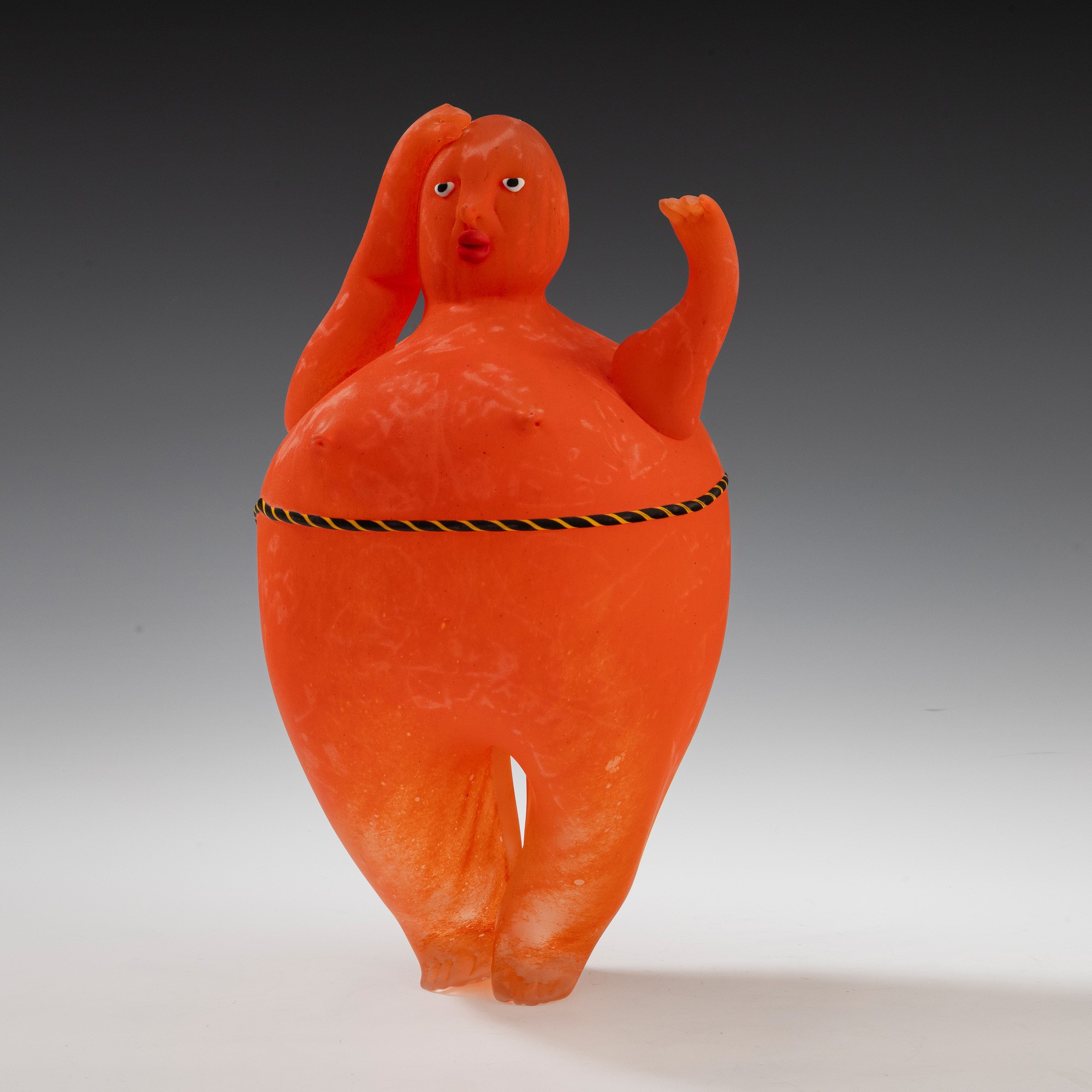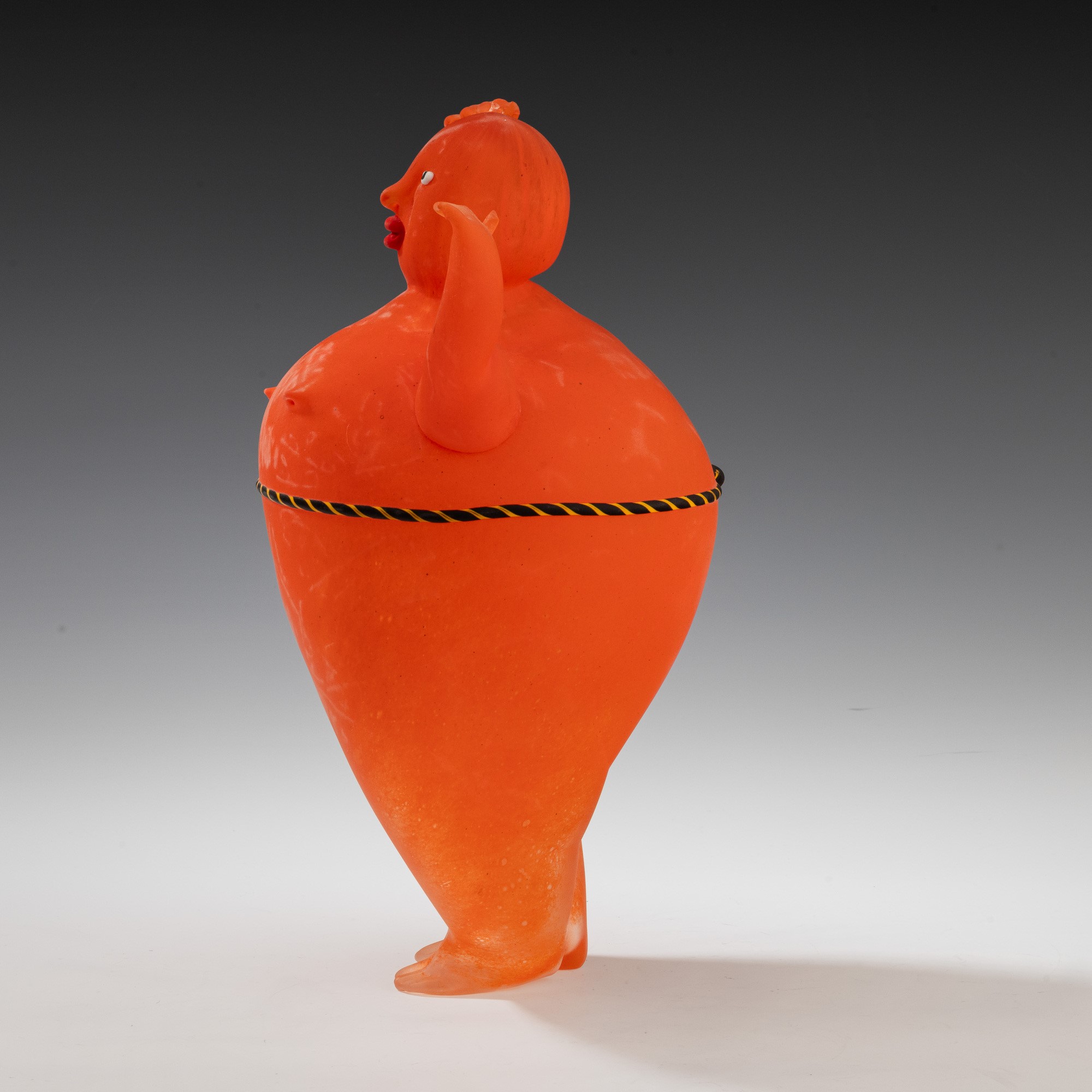 Figura antropomorfa in vetro soffiato arancione con applicazioni policrome a caldo.