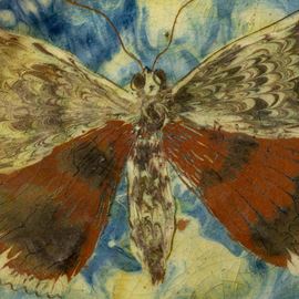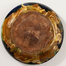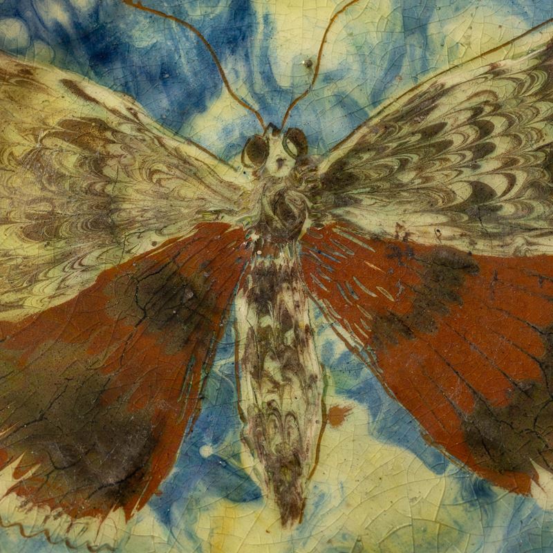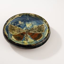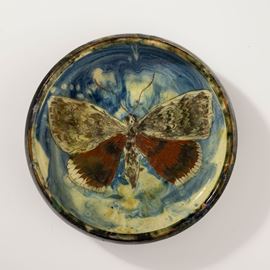 Coppa in terracotta maiolicata con raffigurazione di farfalla a decoro colato policromo. Superficie iridata.