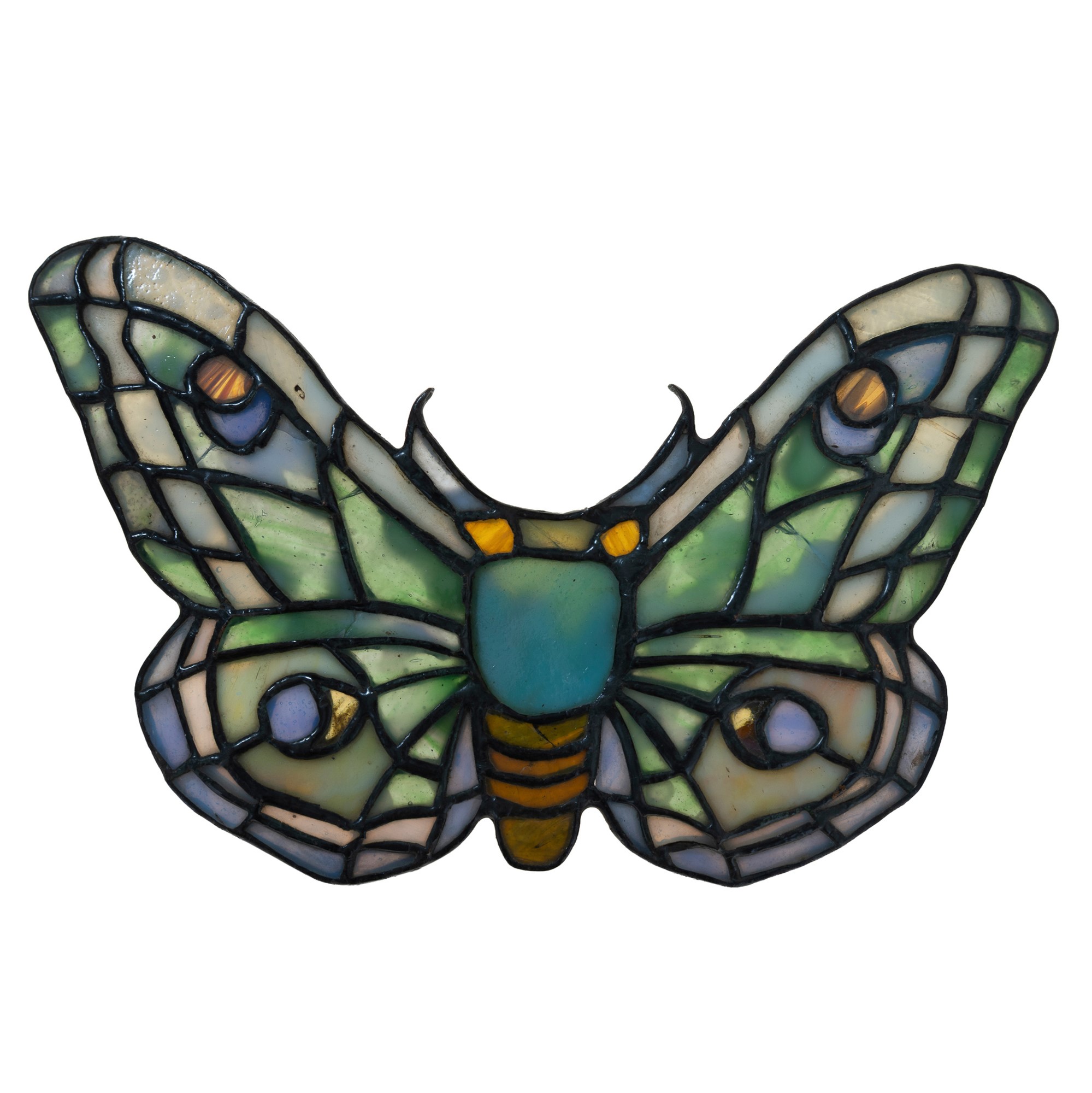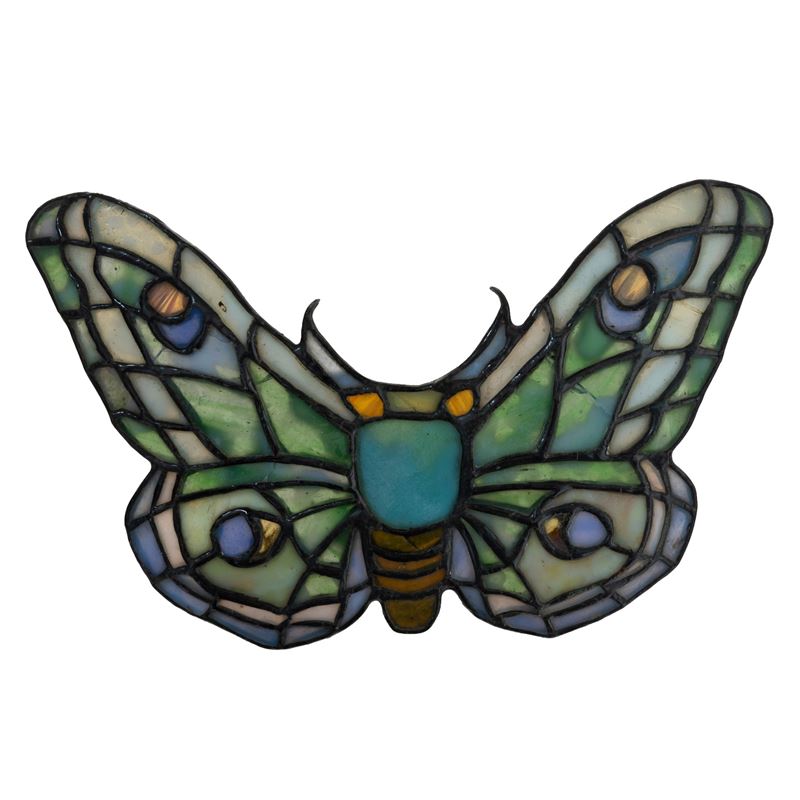 Placca decorativa in forma di farfalla in vetro piombato con paste vitree policrome.