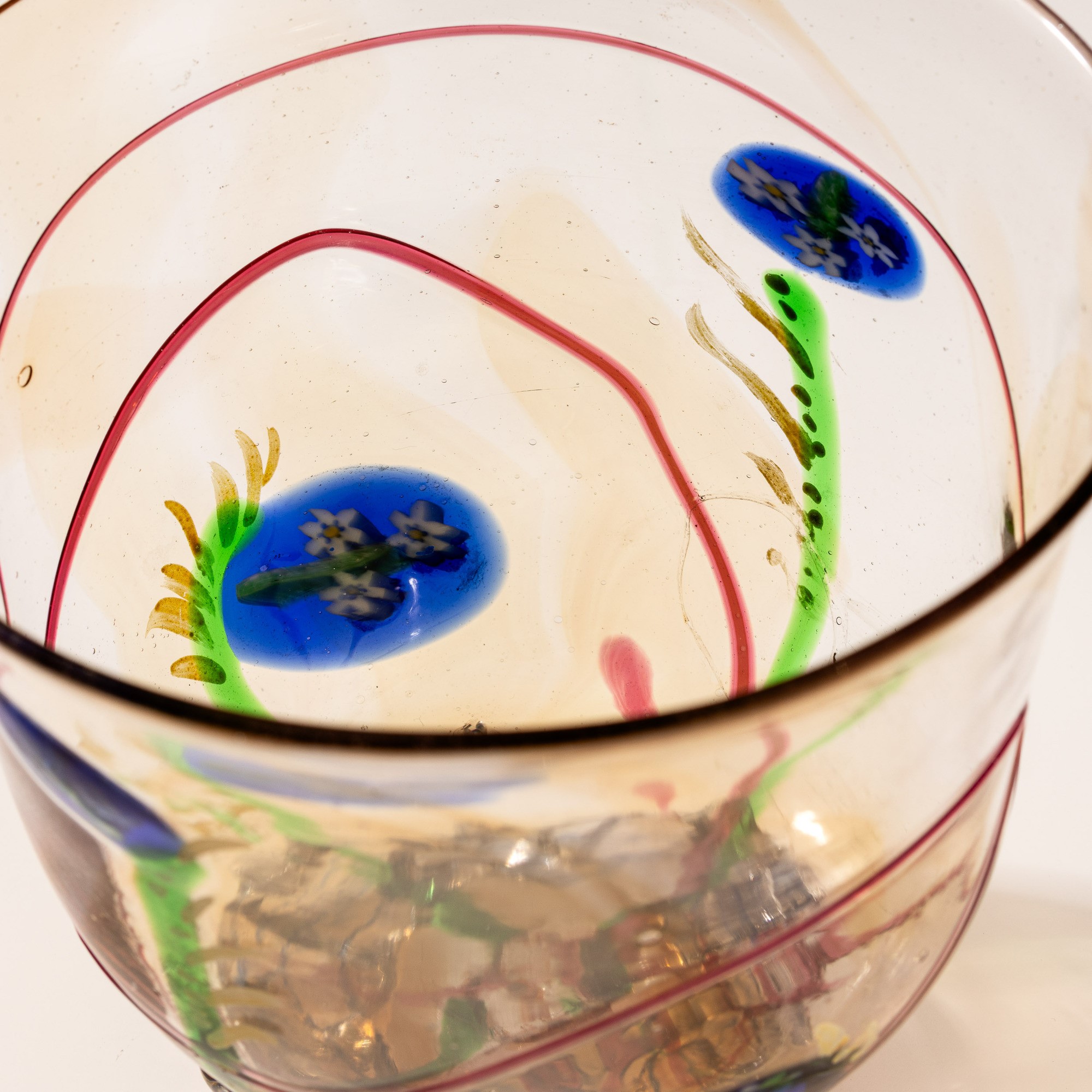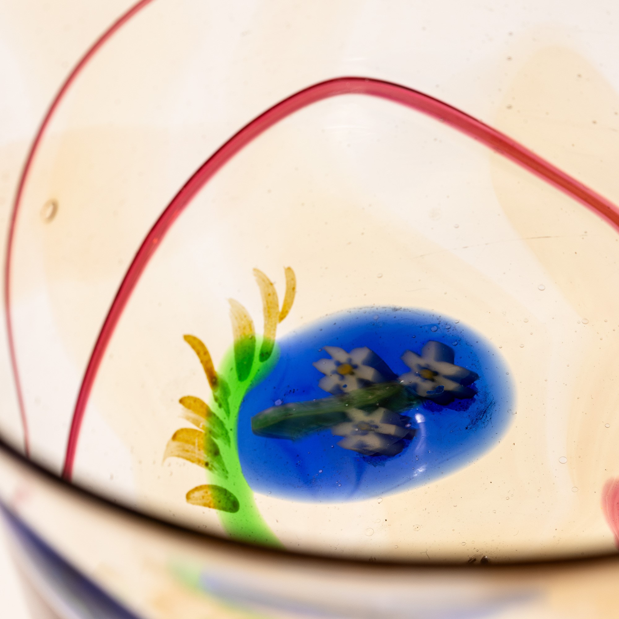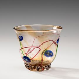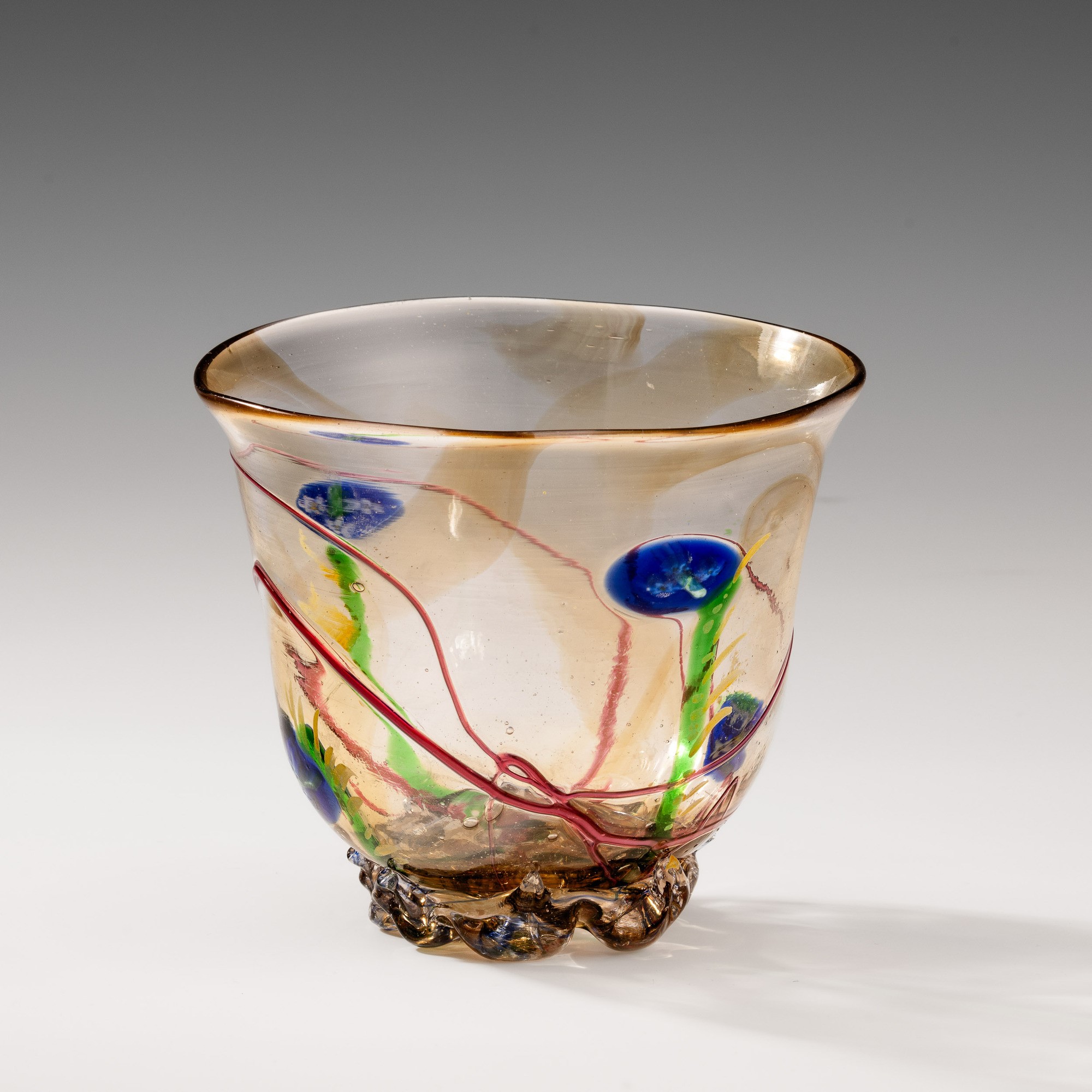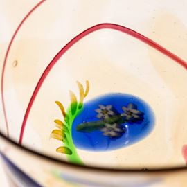 Coppa su piede costolato in vetro soffiato con decoro di murrine in forma di fiore e fili policromi applicati.