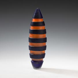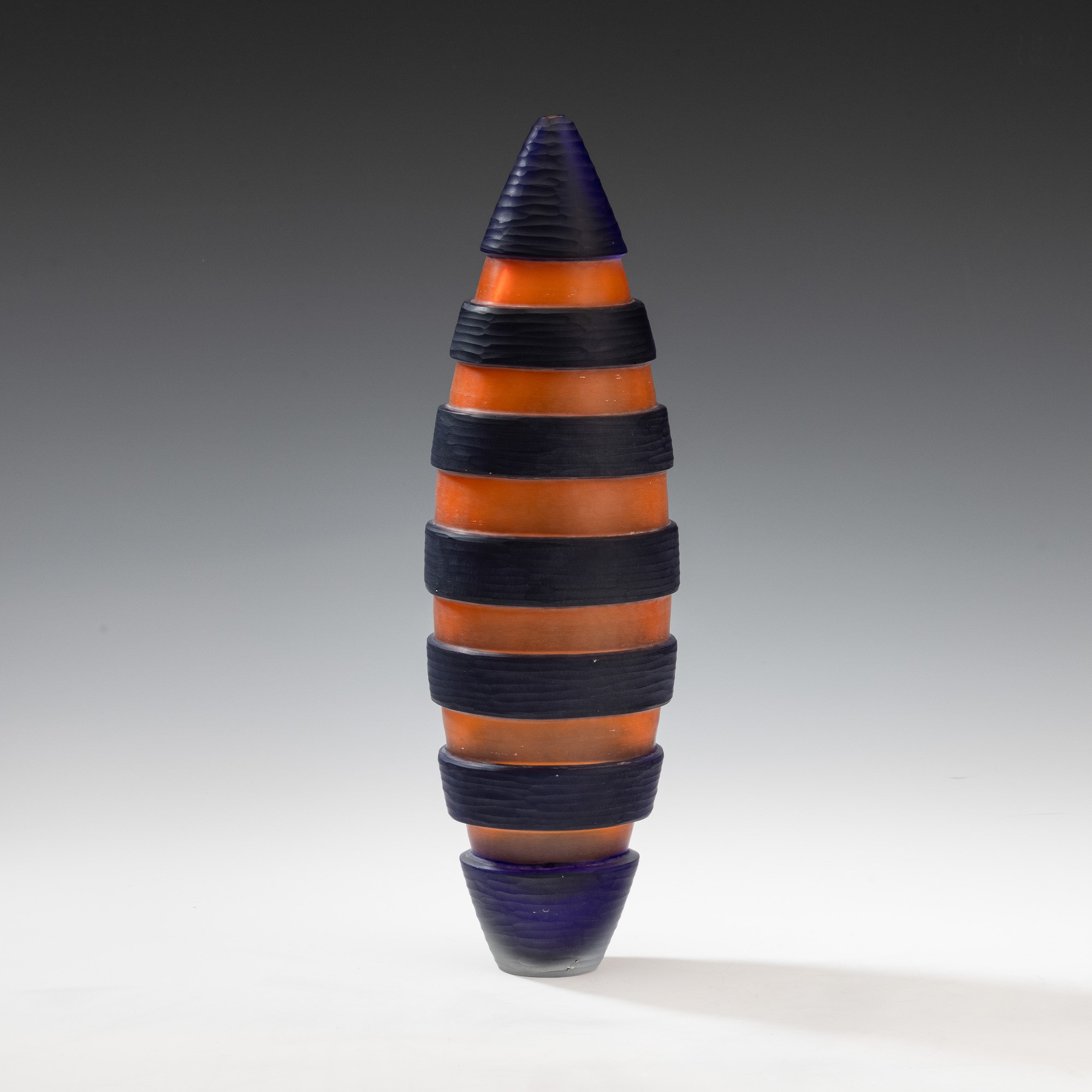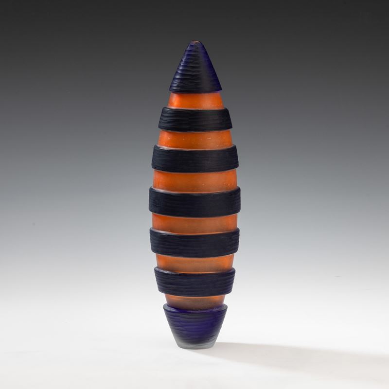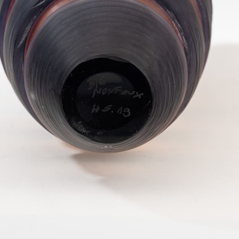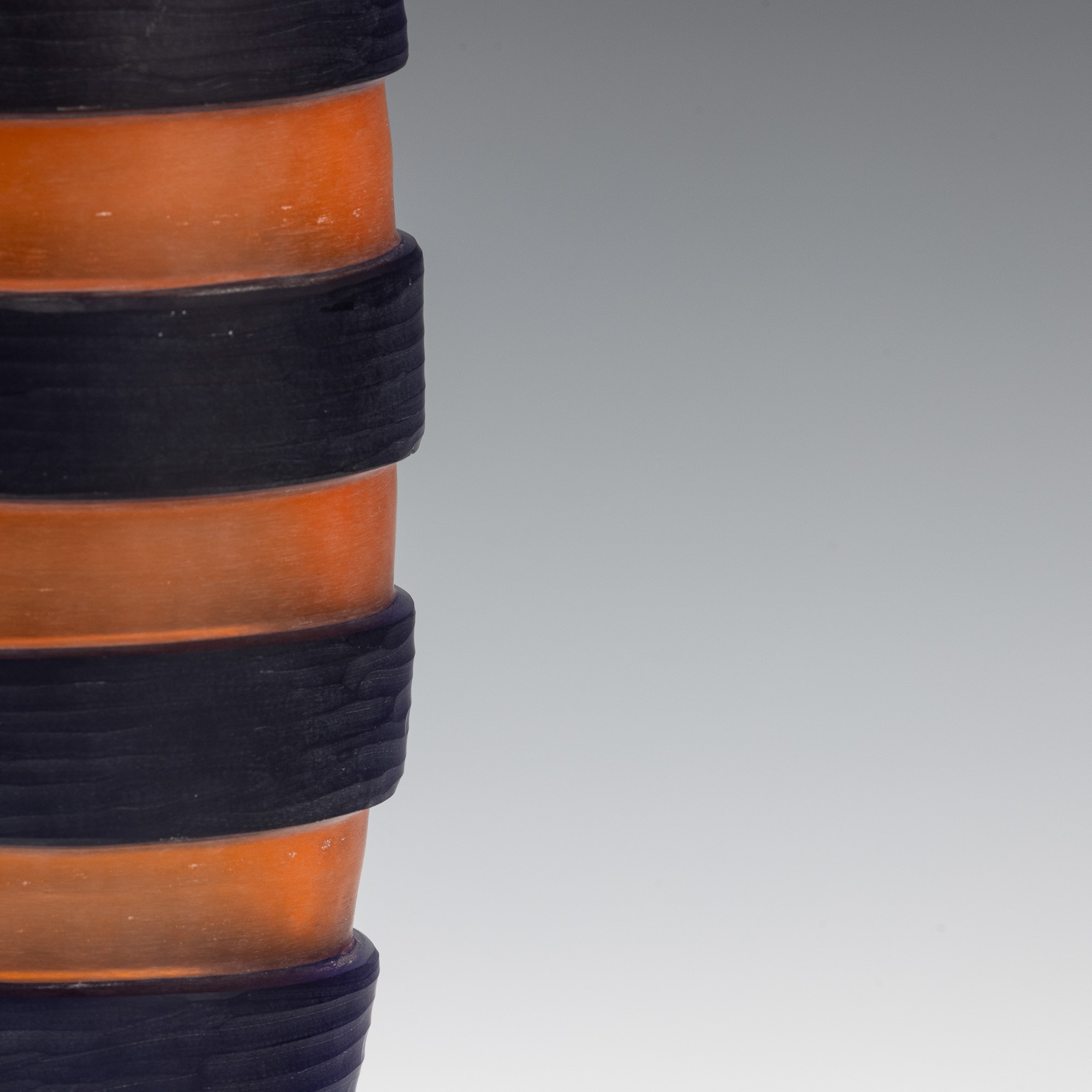 Vaso monofiore serie Nonfoux in vetro a cammeo con molature a fasce concentriche. Superficie interamente lavorata alla mola.