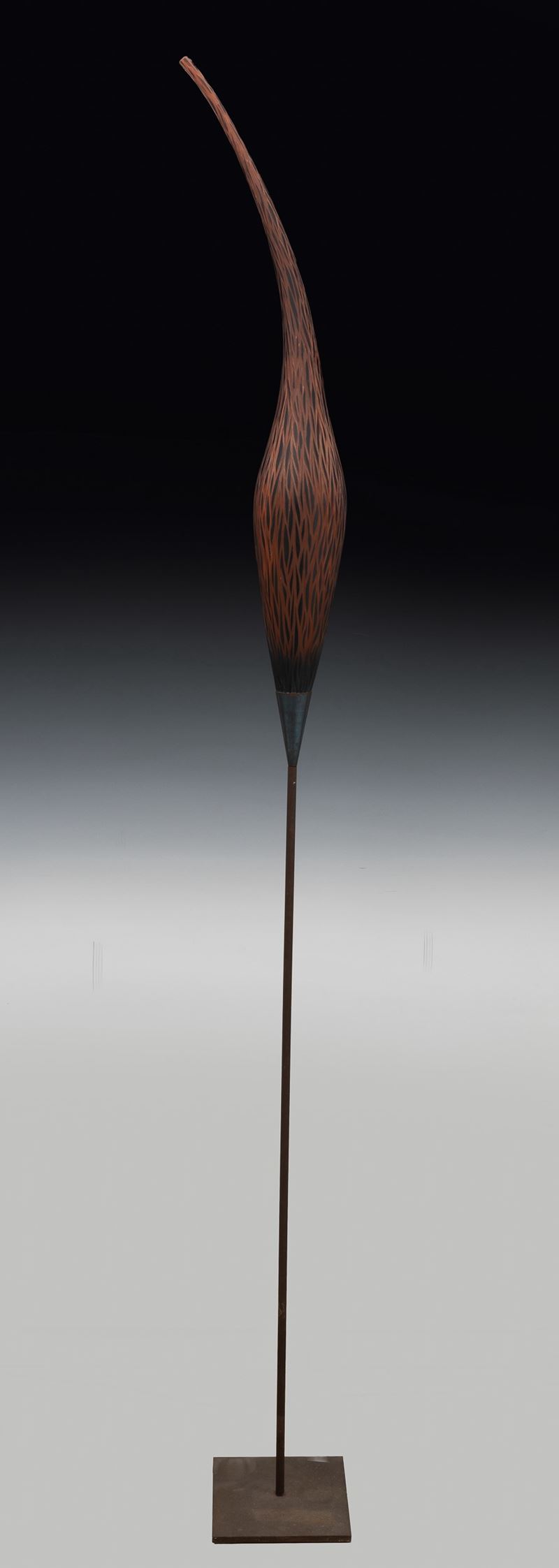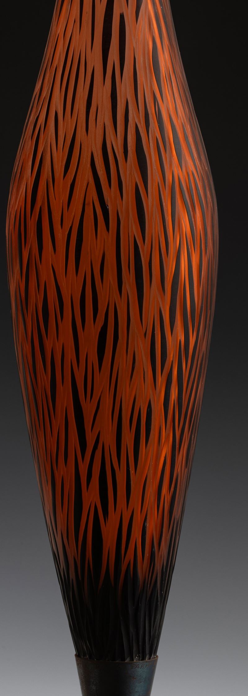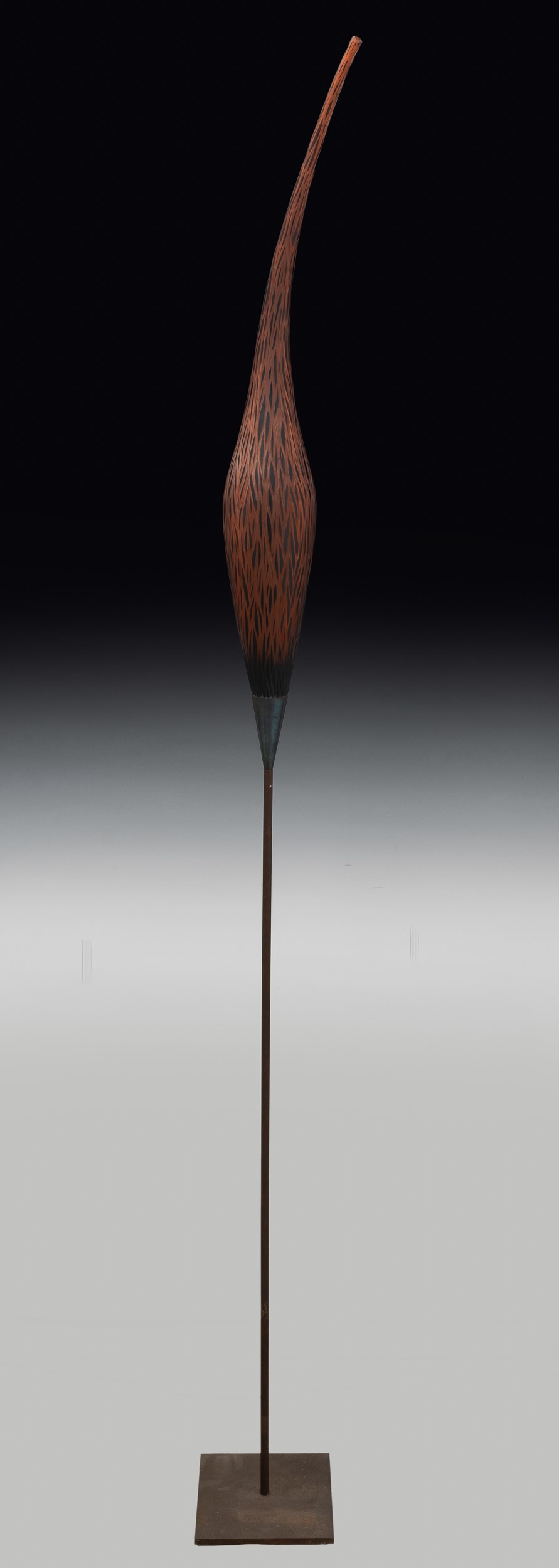 Scultura dalla serie Guardiani in vetro a cammeo con molature e velature verticali. Basamento in ferro battuto.Firma incisa sul metallo B/G '01 Paris #V606.