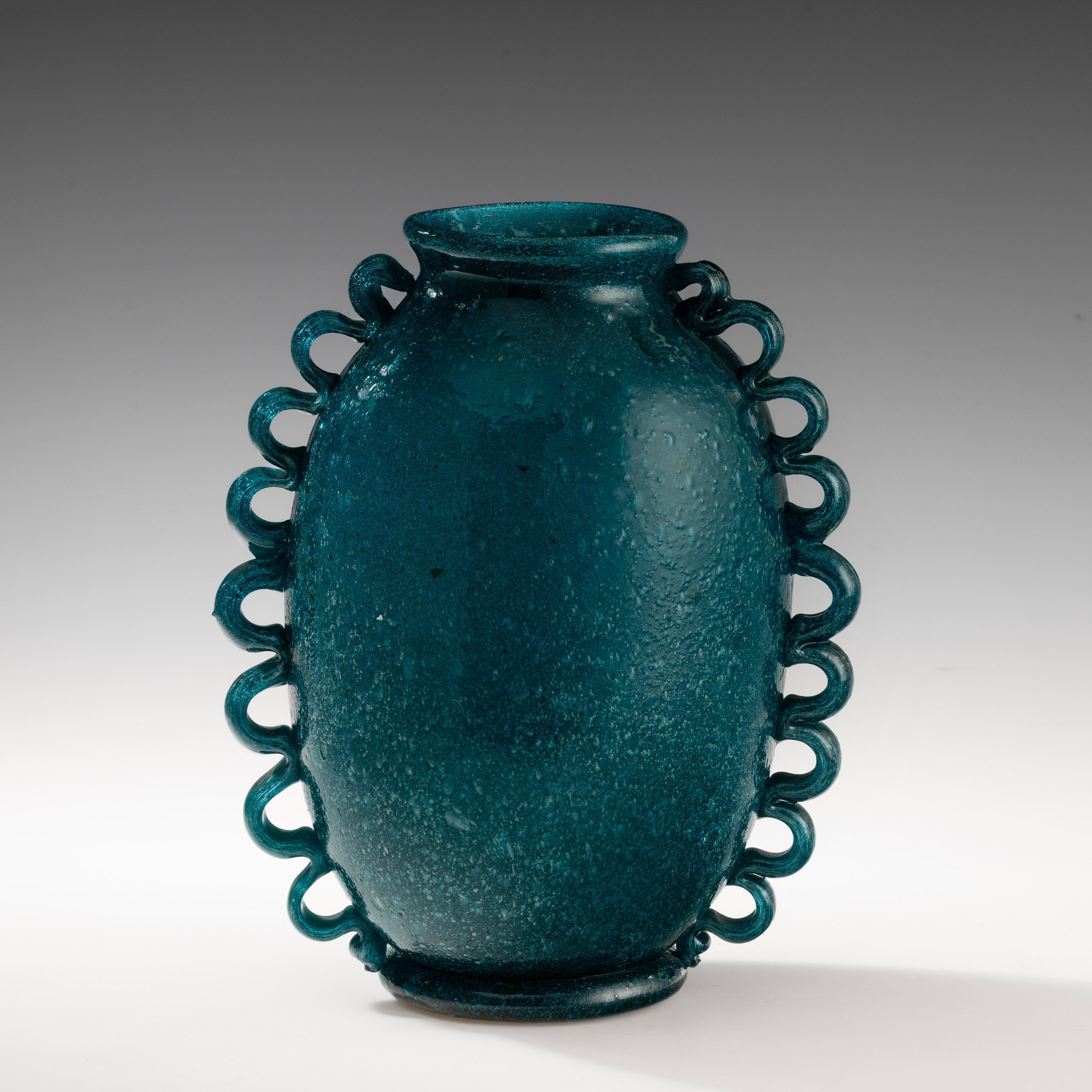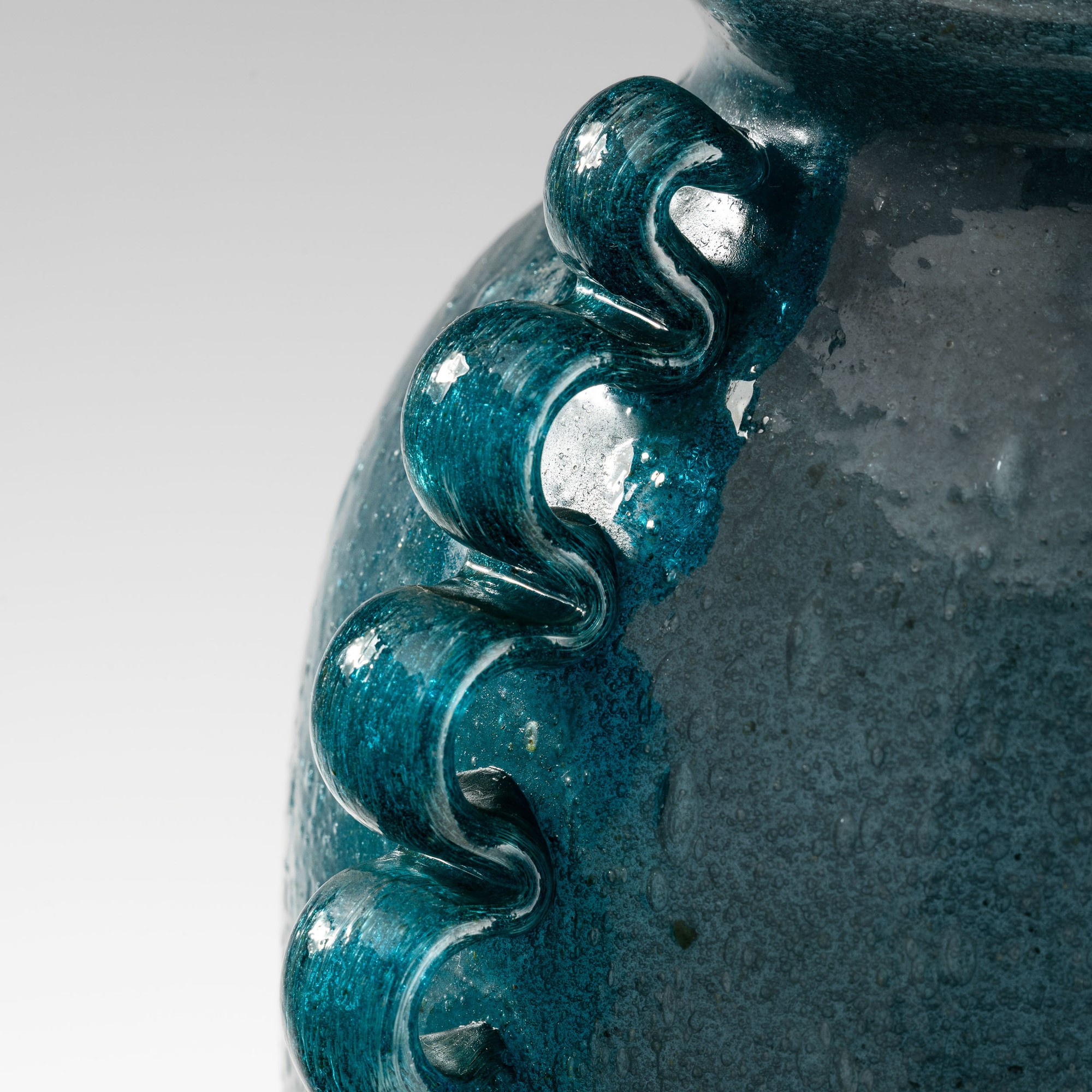 Vaso a uovo in vetro pulegoso verde petrolio con piede a disco e anse serpentiformi applicate.