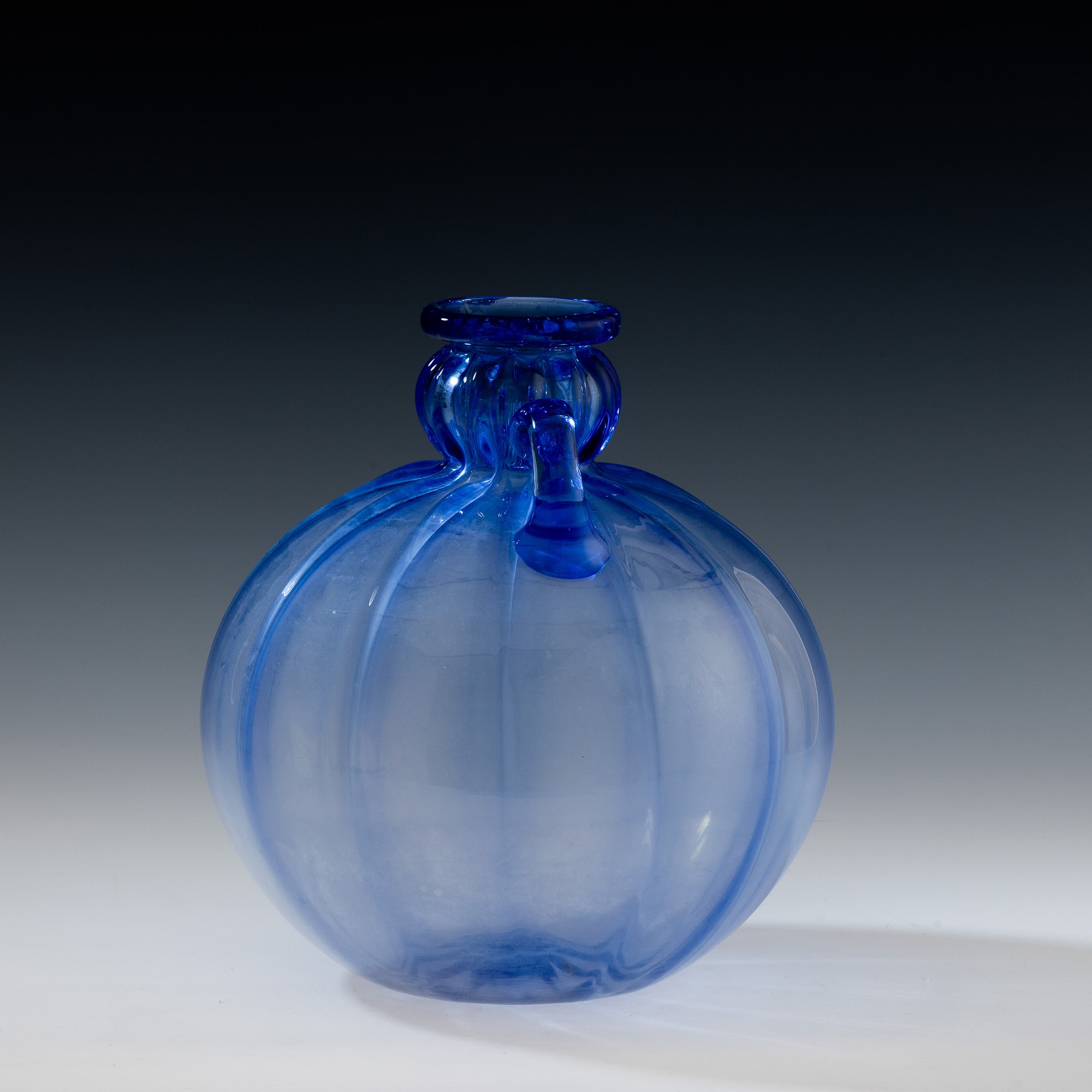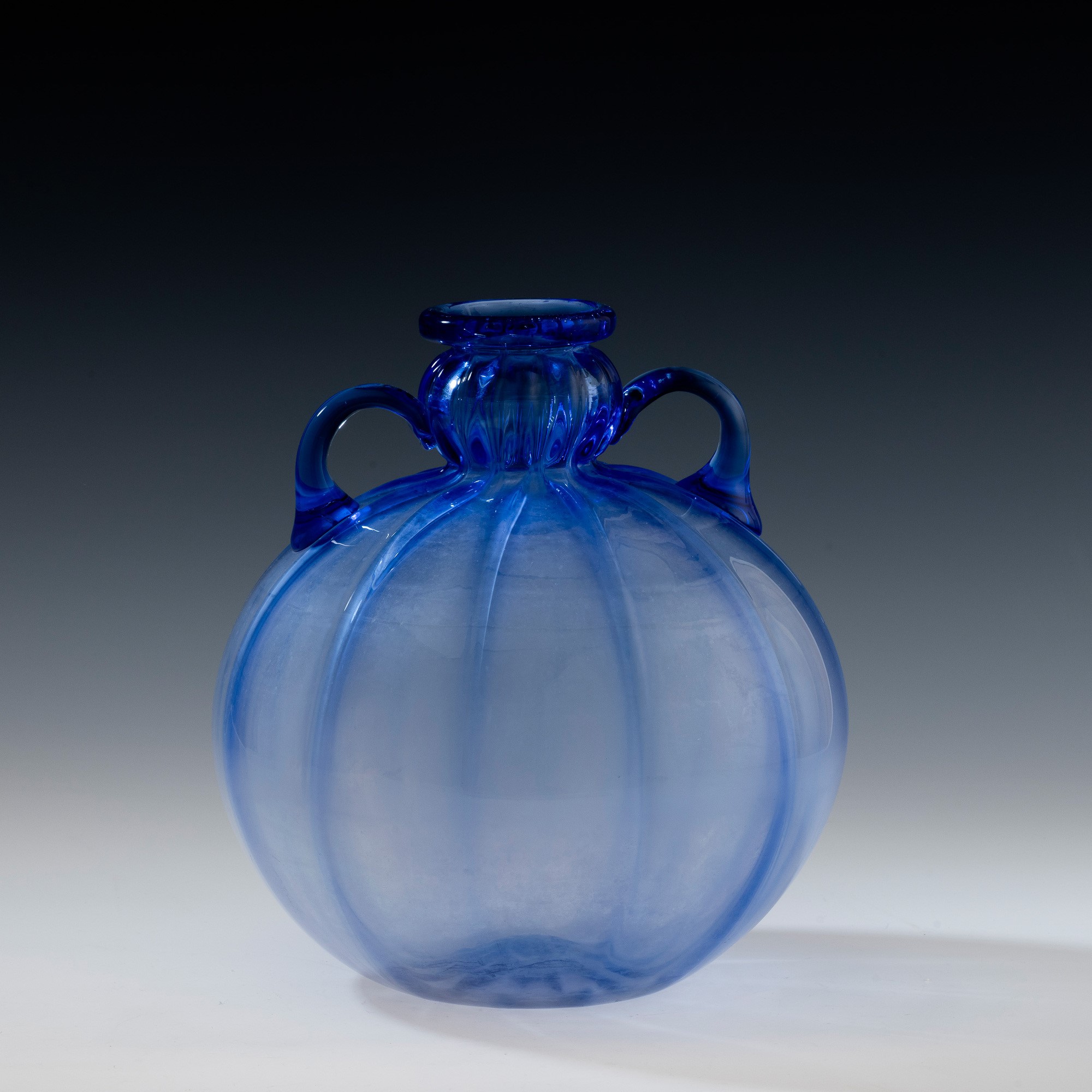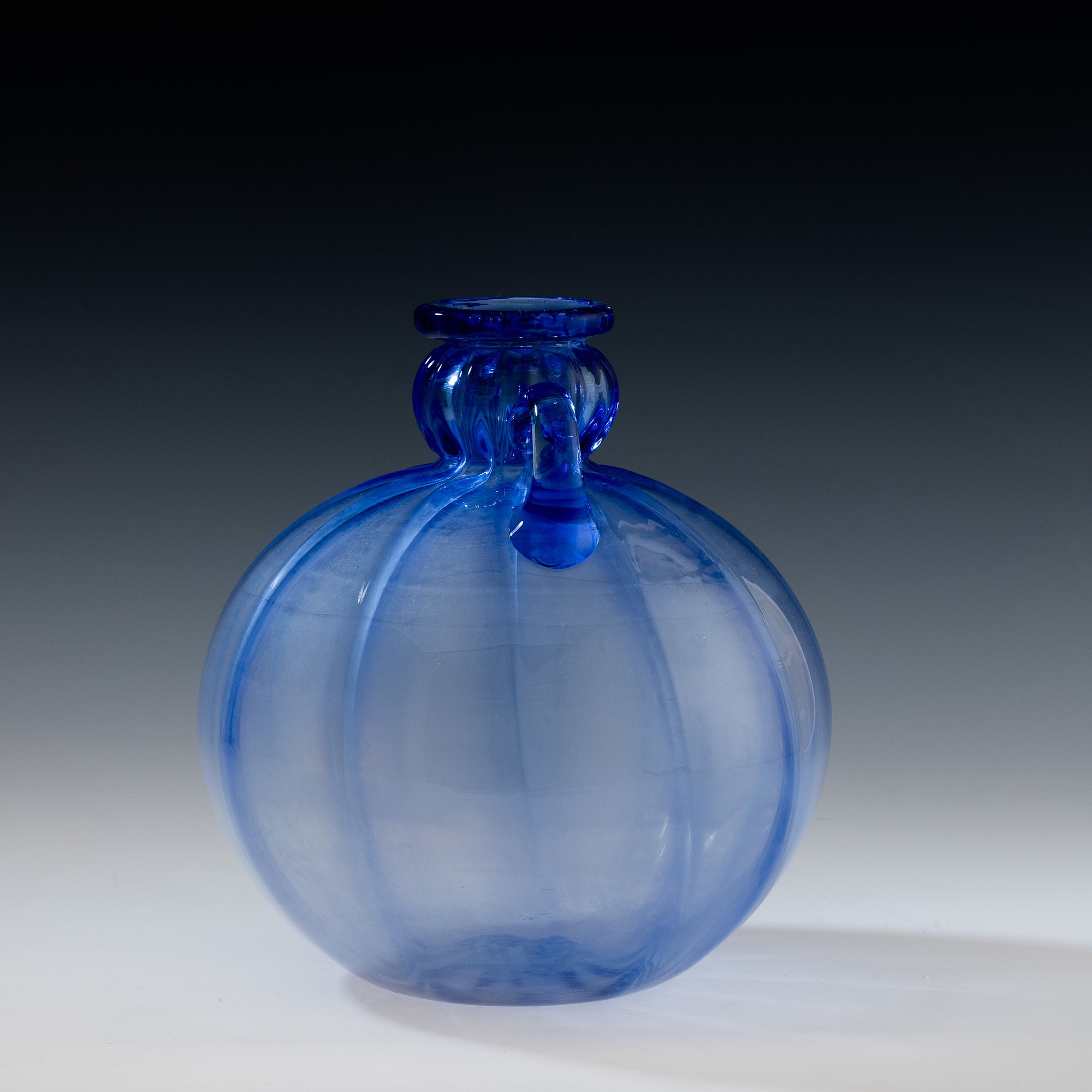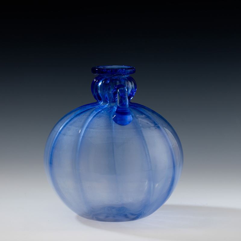 Vaso a sfera con collo a bulbo e anse applicate in vetro soffiato zaffiro a grandi costolature.