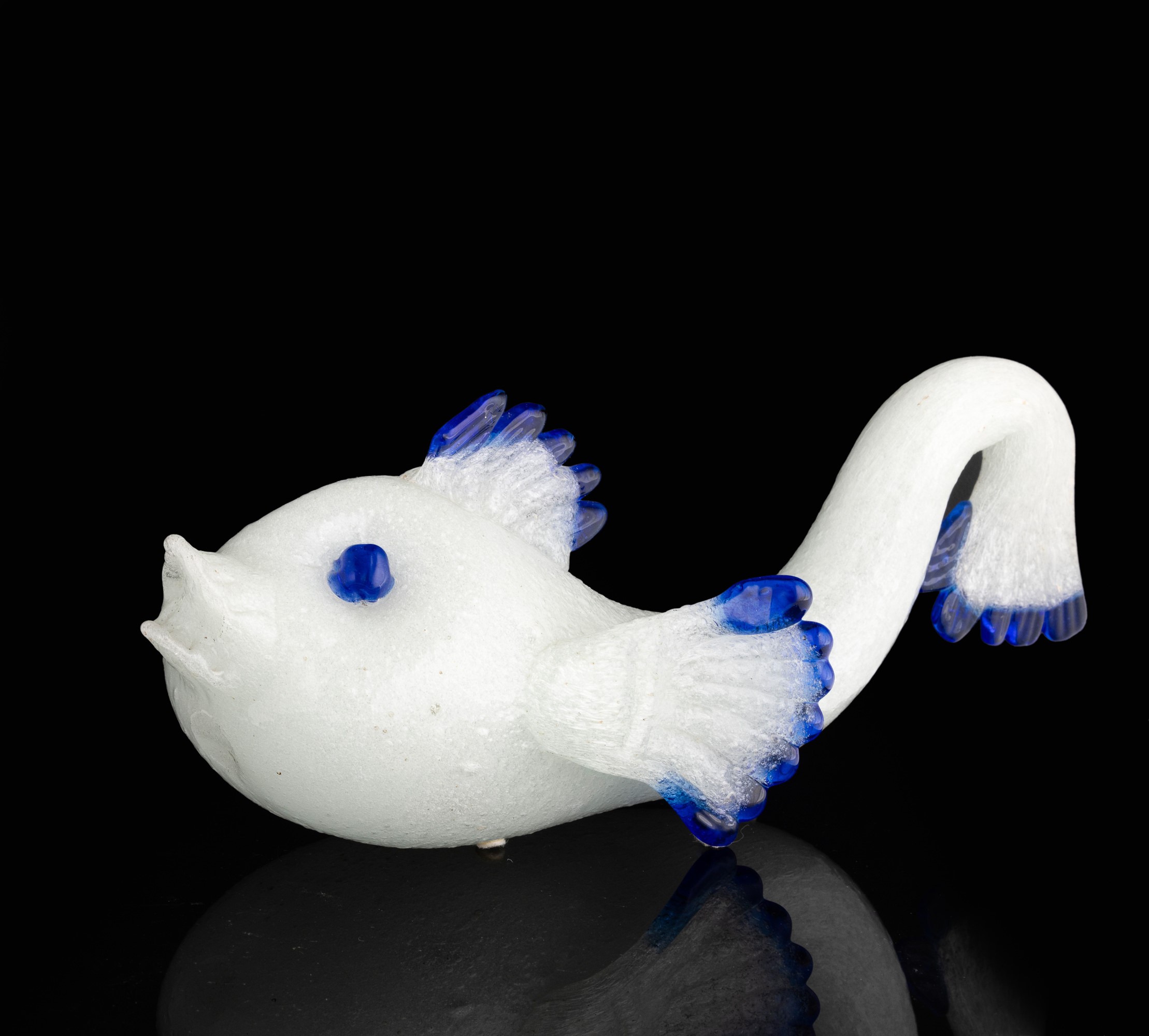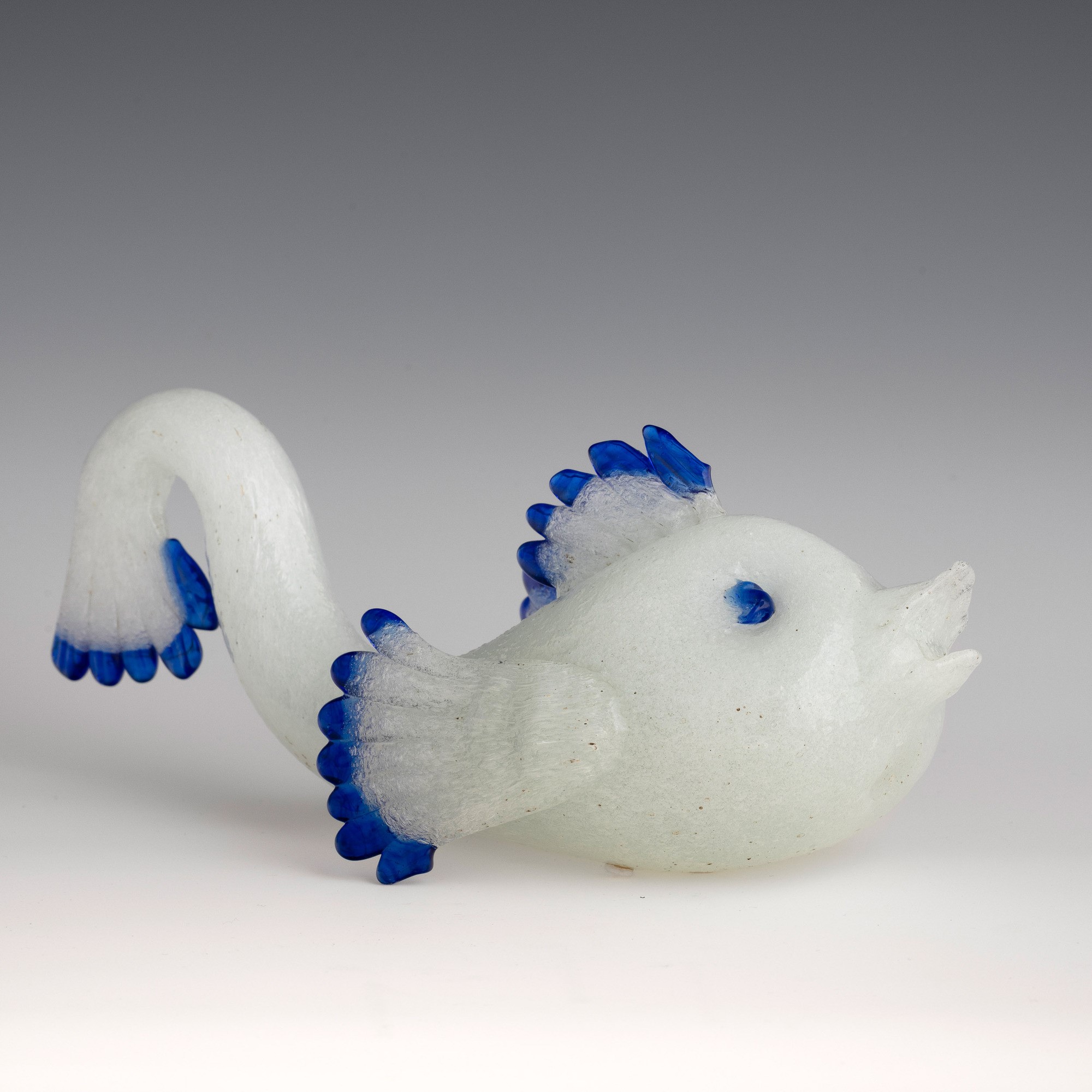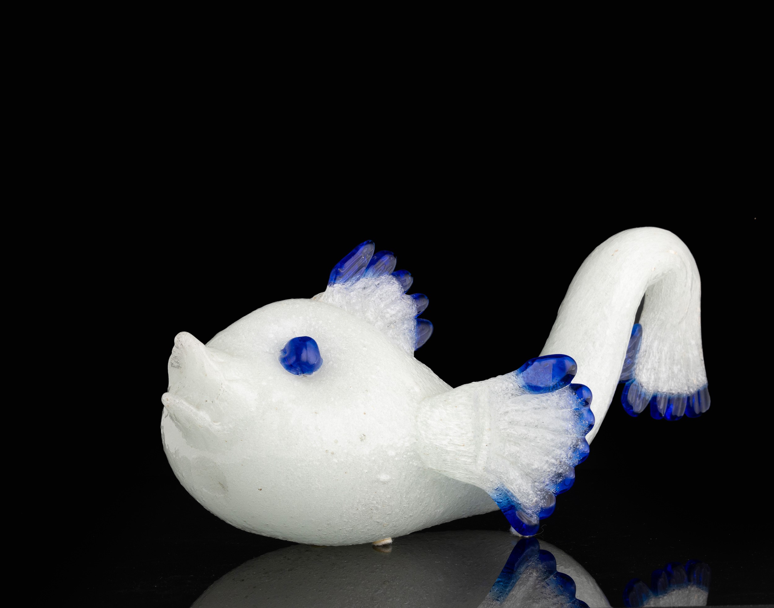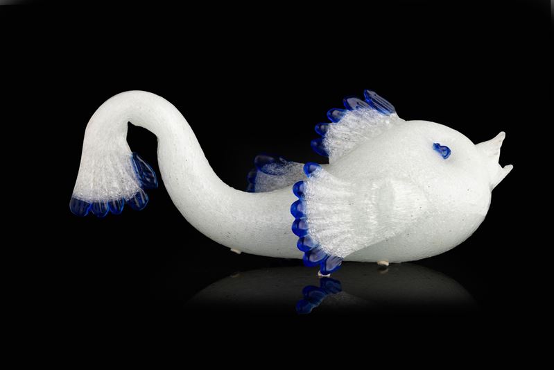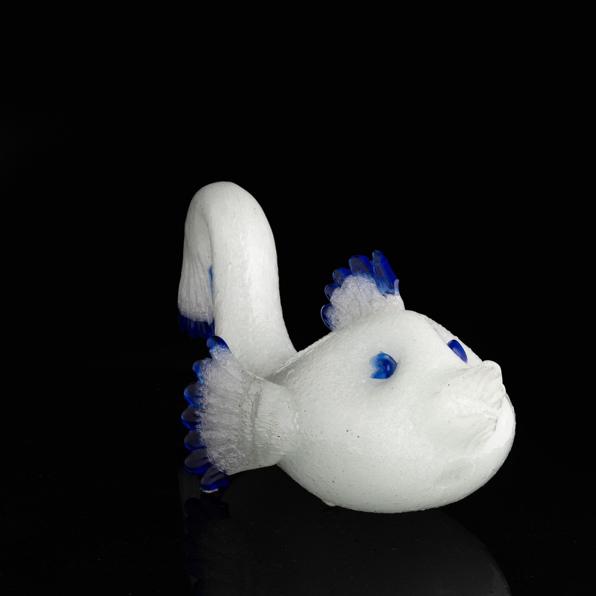 Pesce fantastico in vetro pulegoso con finiture in vetro trasparente blu.