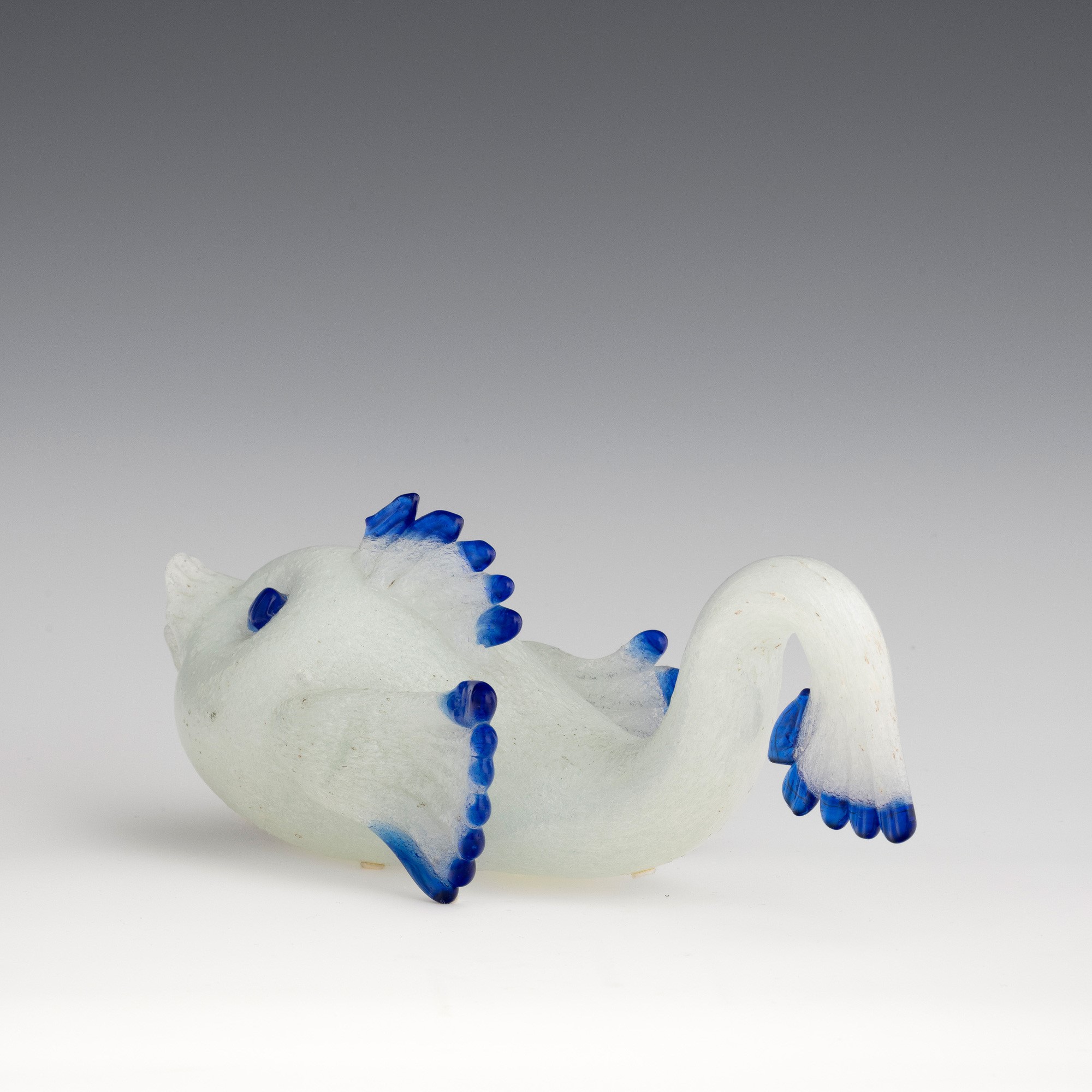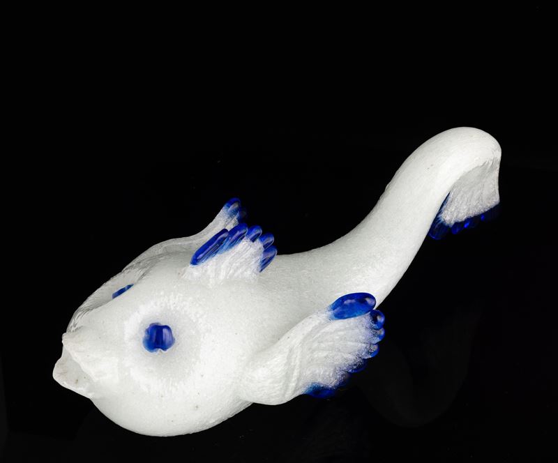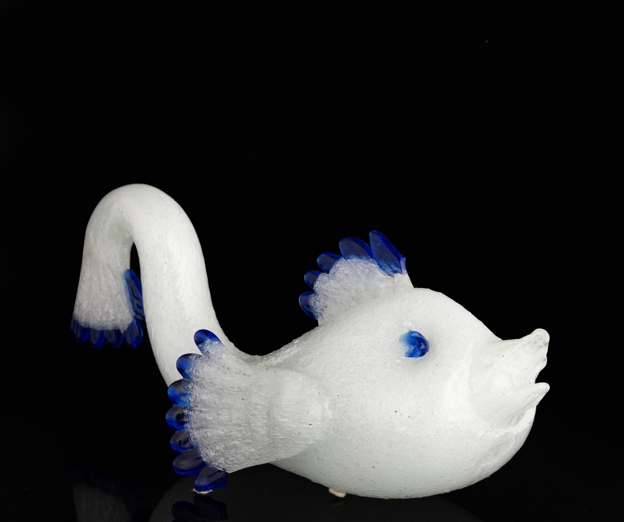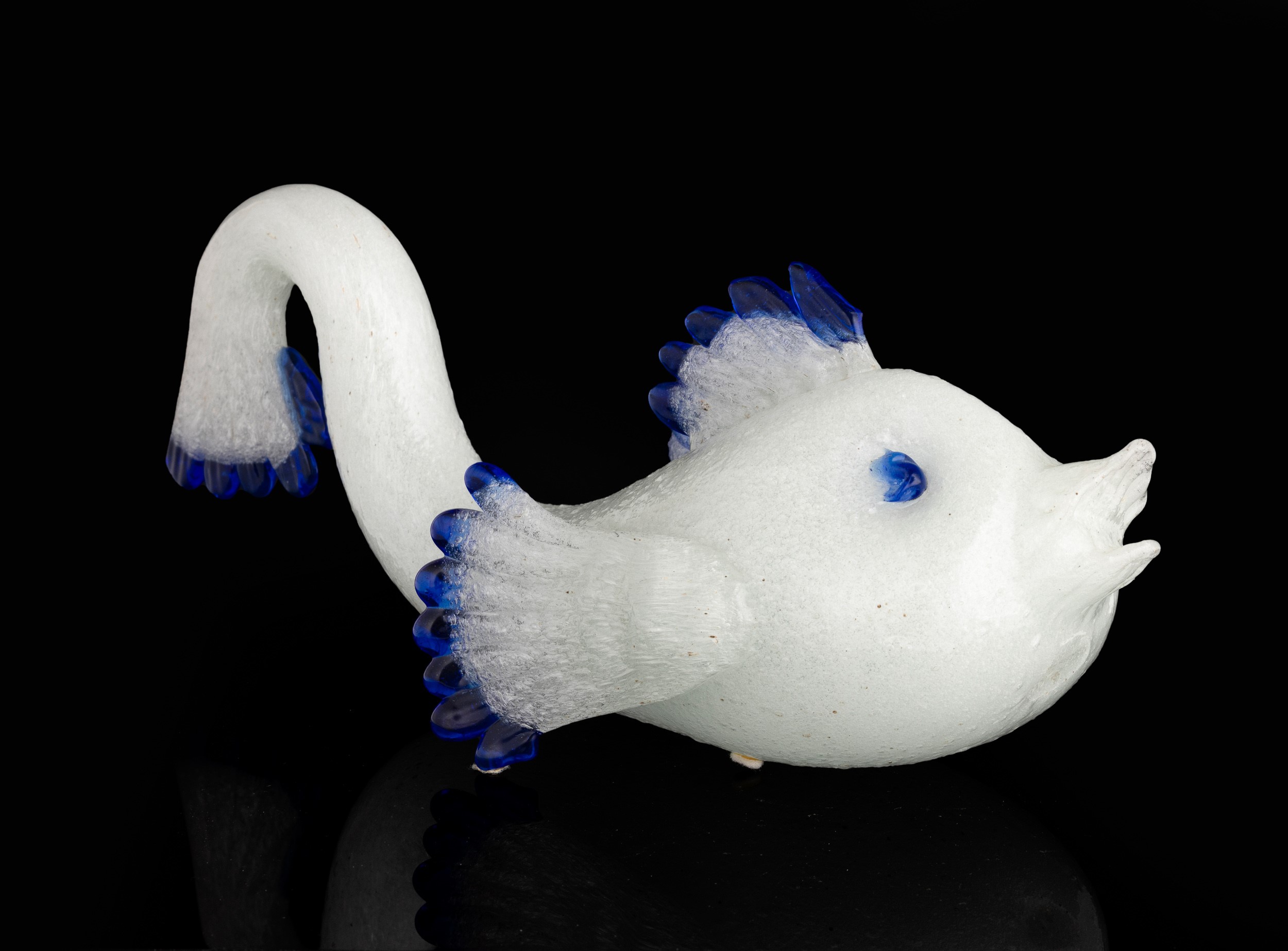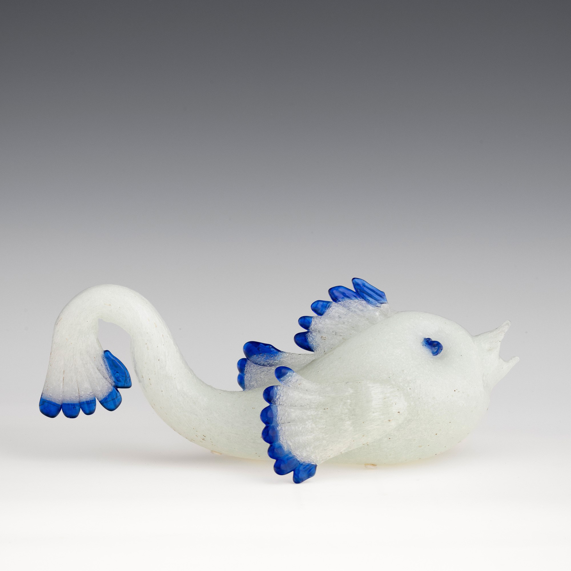 Pesce fantastico in vetro pulegoso con finiture in vetro trasparente blu.