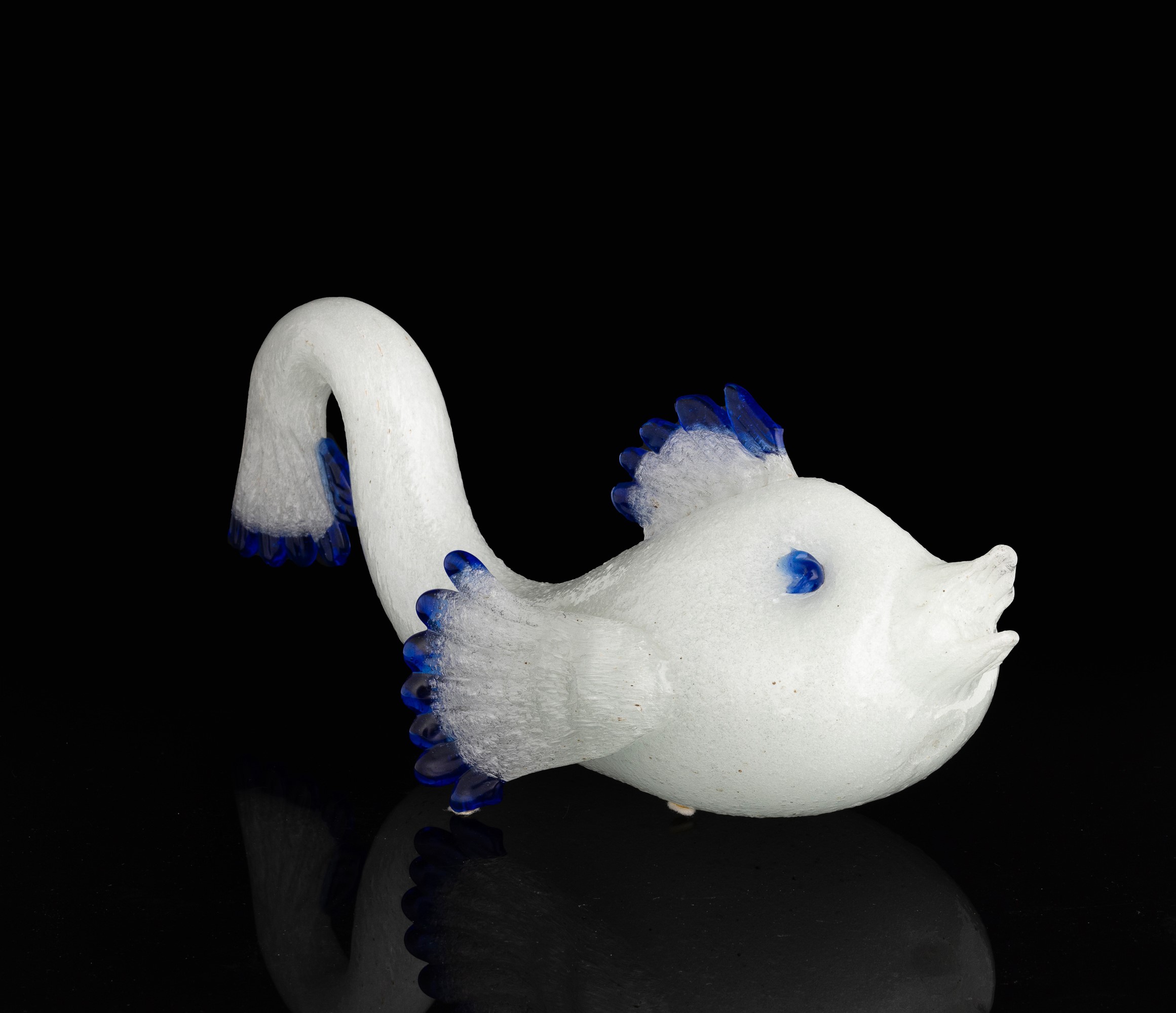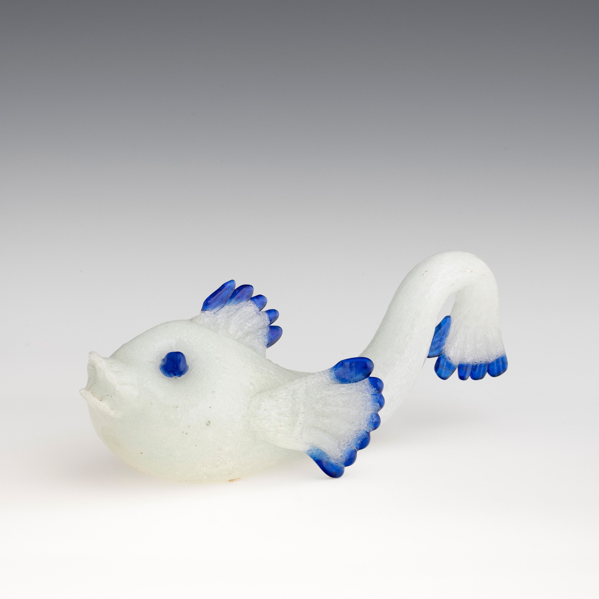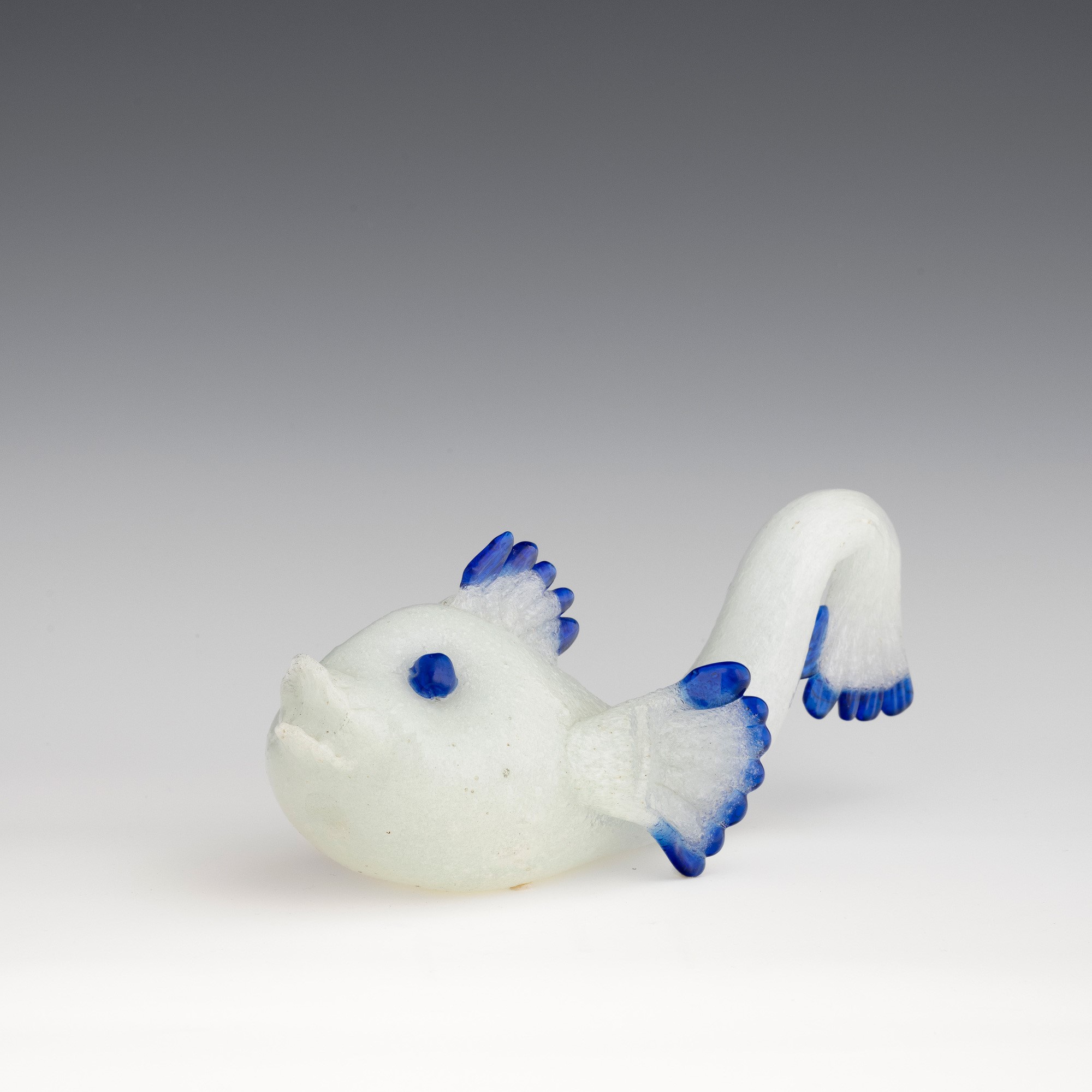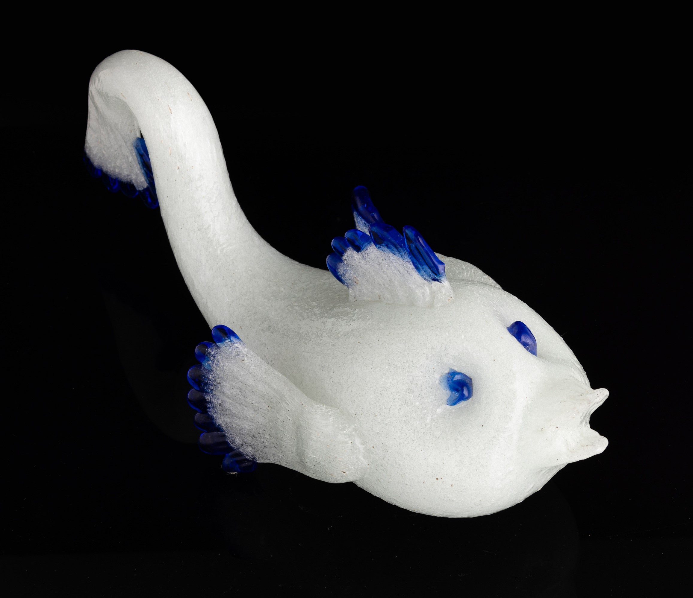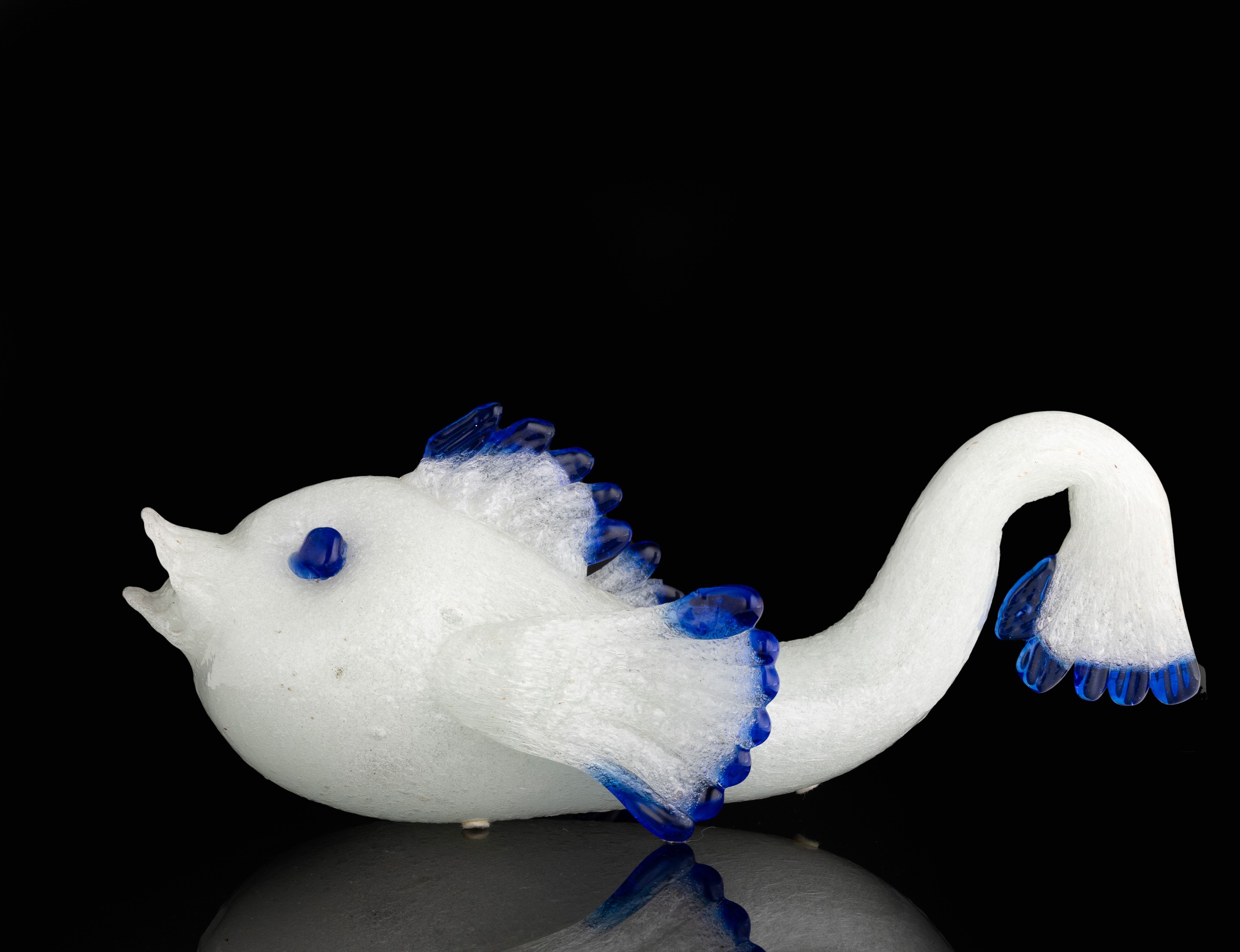 Pesce fantastico in vetro pulegoso con finiture in vetro trasparente blu.