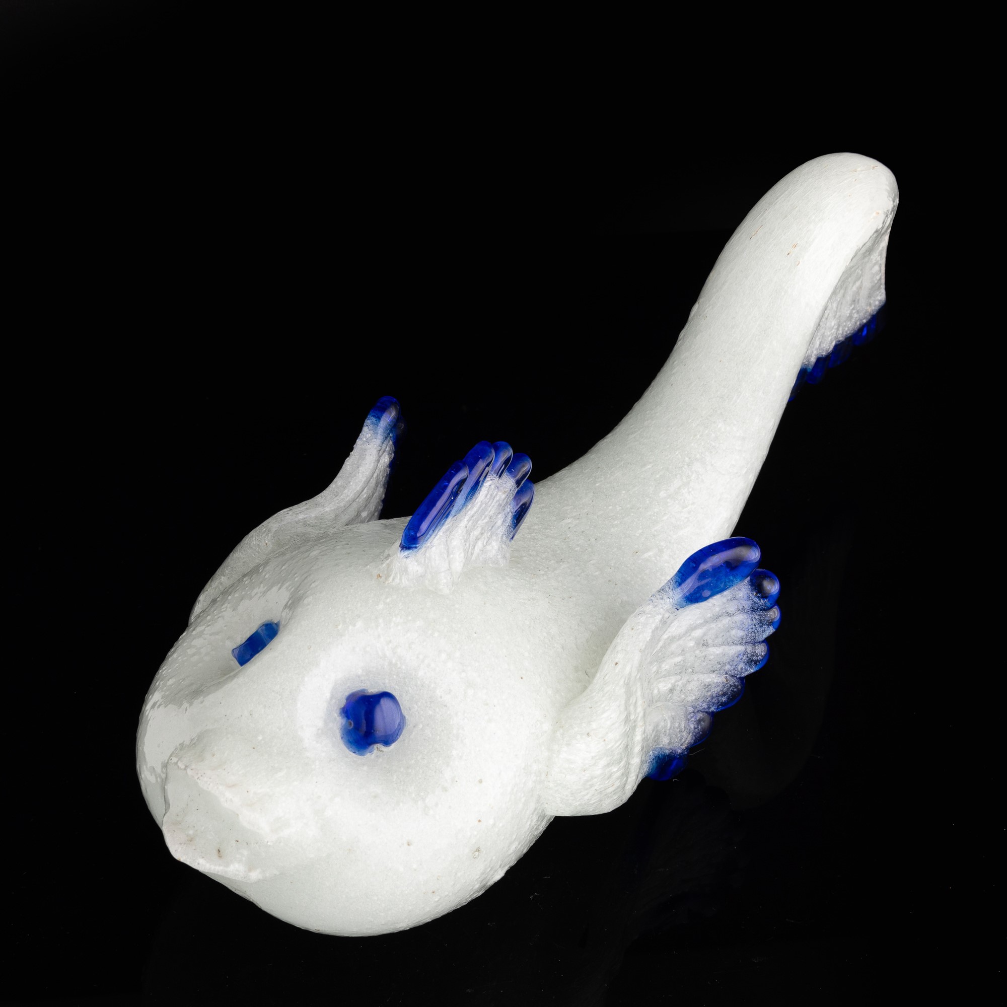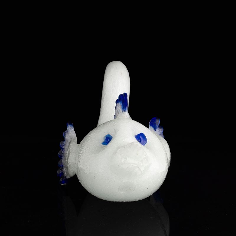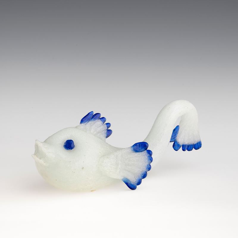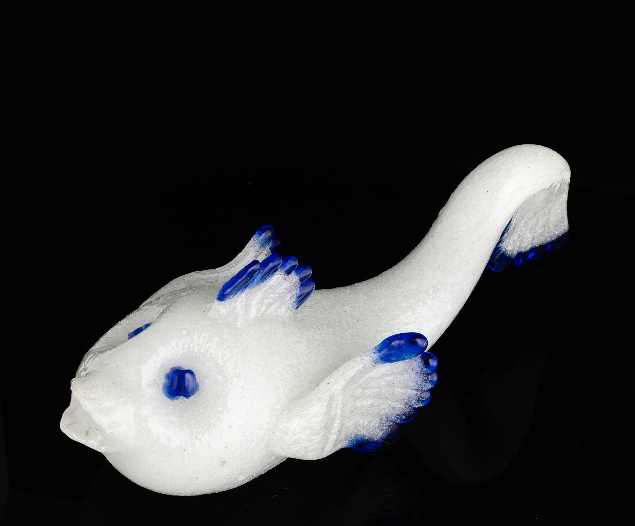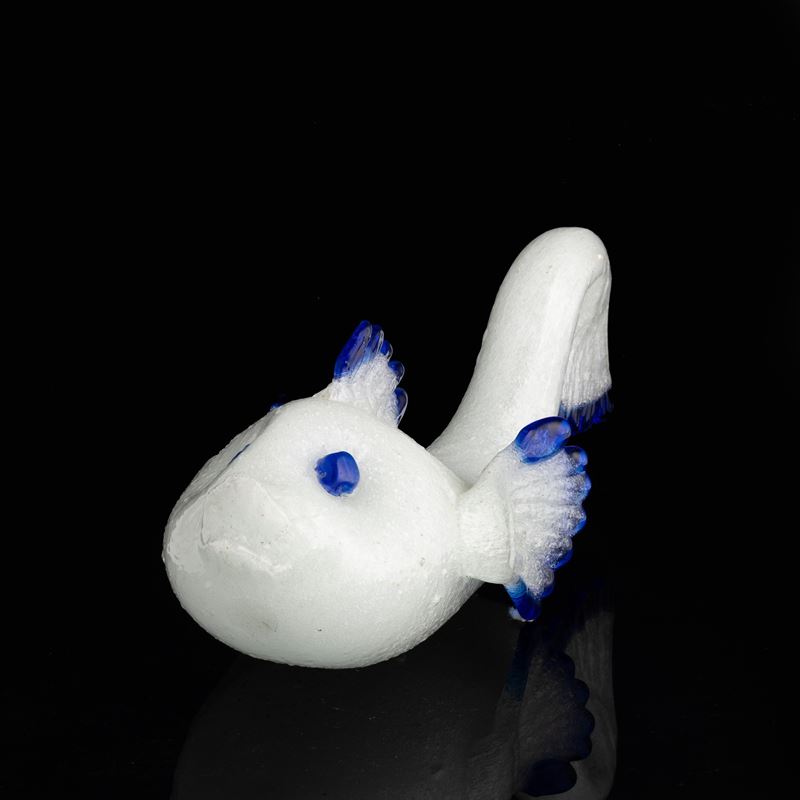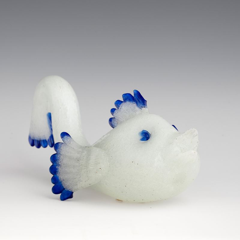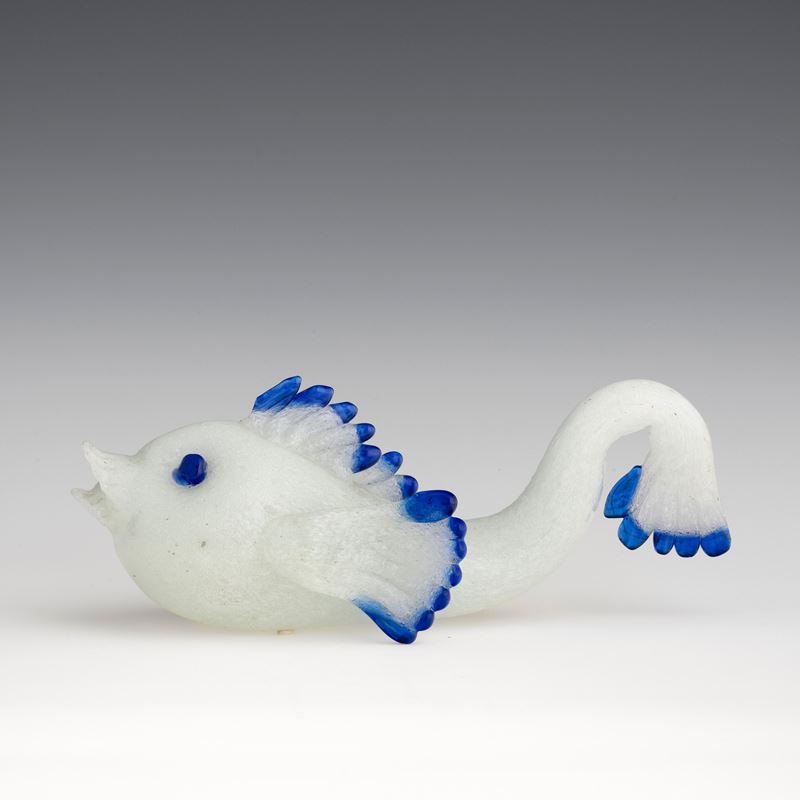 Pesce fantastico in vetro pulegoso con finiture in vetro trasparente blu.