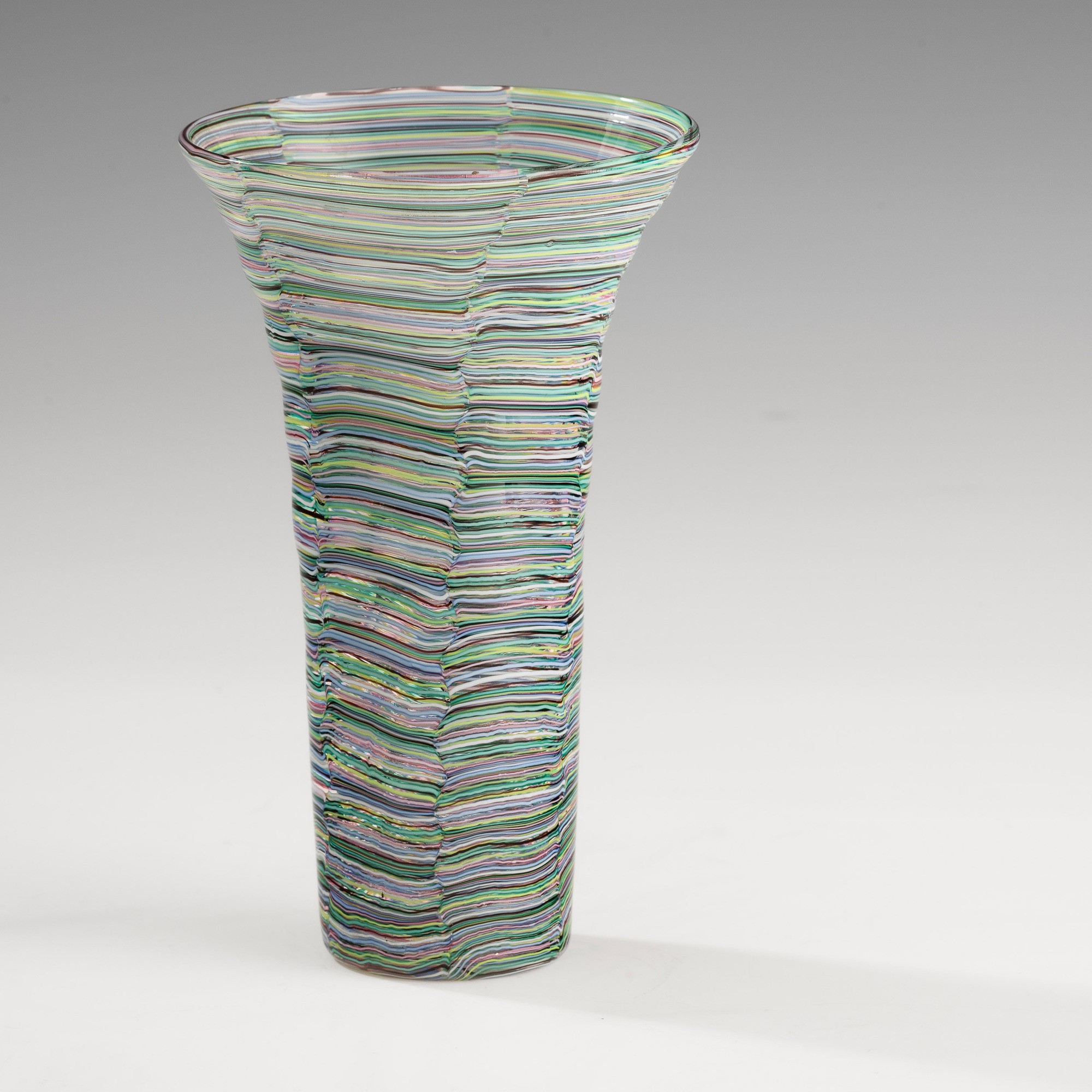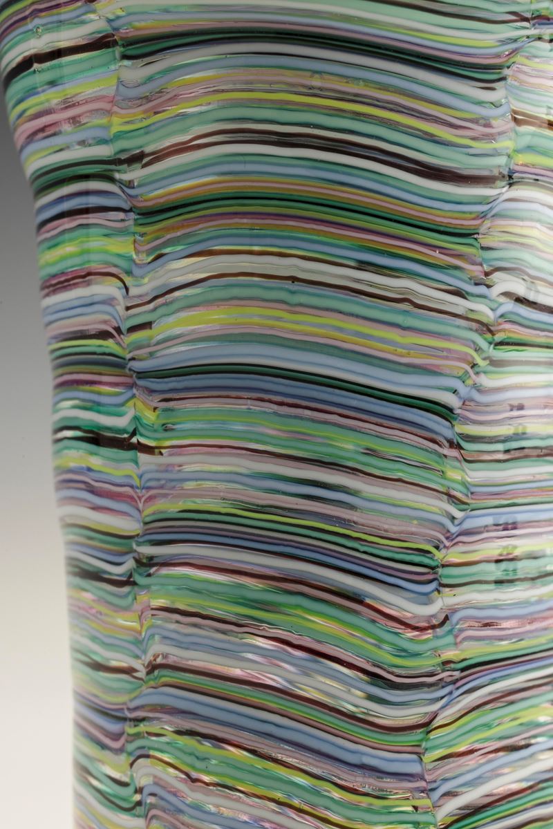 Eccezionale vaso cilindrico con ampio collo svasato serie Mosaico Multicolore in vetro soffiato con decoro di tessere a minute canne policrome sommerse.
