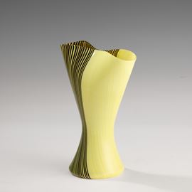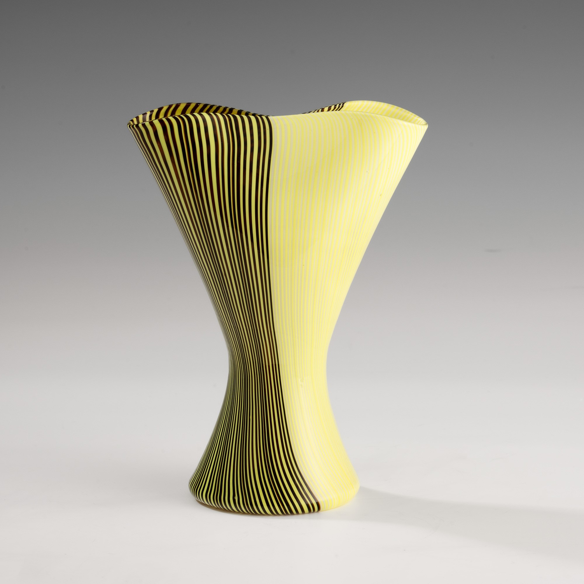 Vaso prototipo serie Tessuti in forma di clessidra con strozzatura centrale in vetro soffiato con decoro di sottili canne policrome verticali.